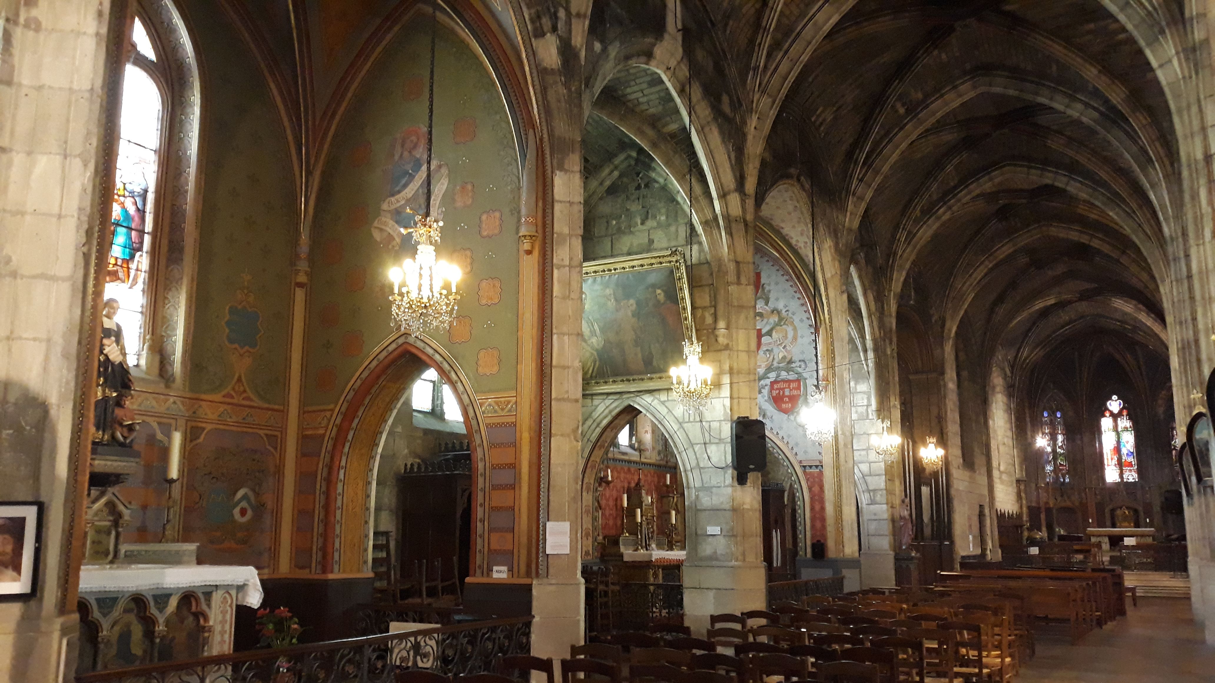 Une belle église, ouverte malgré le clocher en travaux. L'origine de l'édifice est du 11è, de très nombreuses transformations l'ont totalement modifiée. Le vaisseau central est bordé de collatéraux dont les travées ont été séparées par des sortes de murs-diaphragmes percés d'ouvertures ogivales. Des décors peints agrémentent l'église et apportent un peu de chaleur. Le mobilier, les vitraux et les tableaux sont à découvrir, ainsi que l'orgue sur la tribune et un second dans la dernière chapelle-travée du bas-côté Nord.