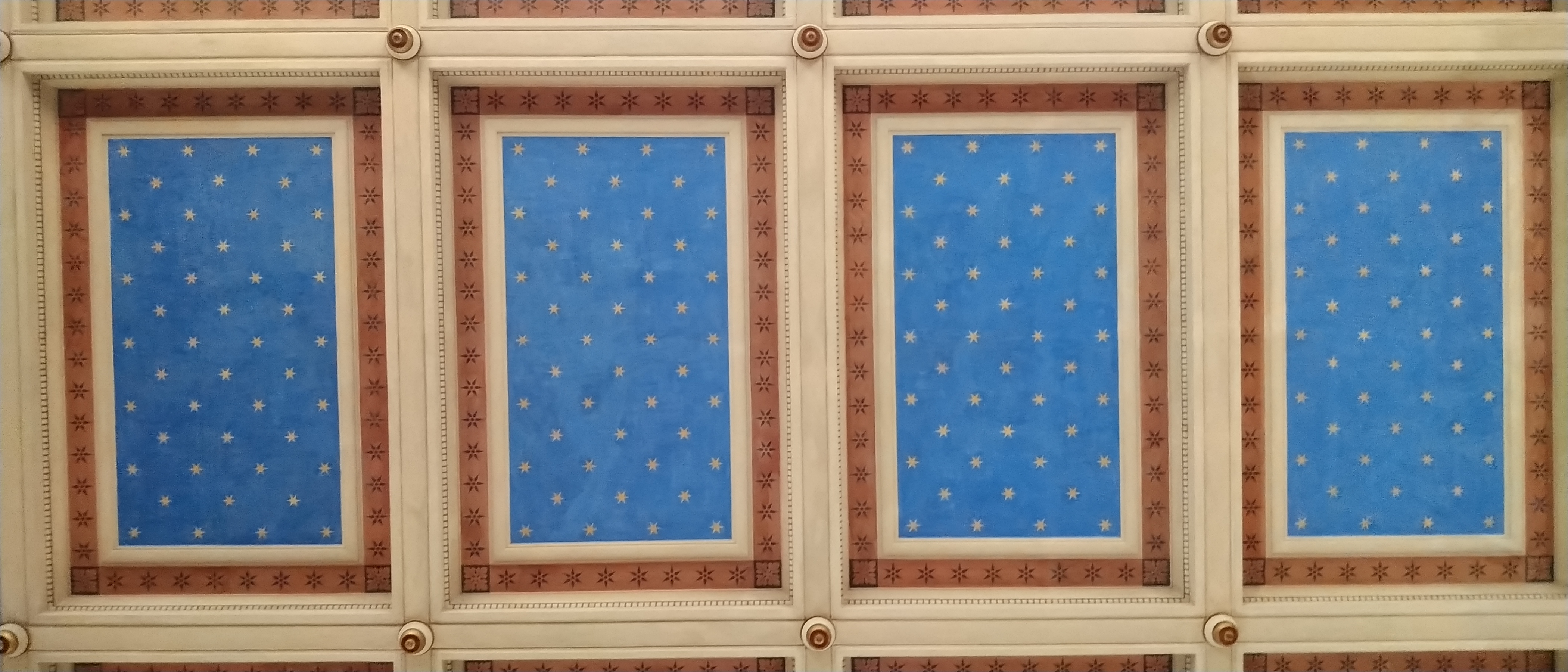 Eglise romane avec nombreuses statues. Plafond repeint éclairant l'édifice.