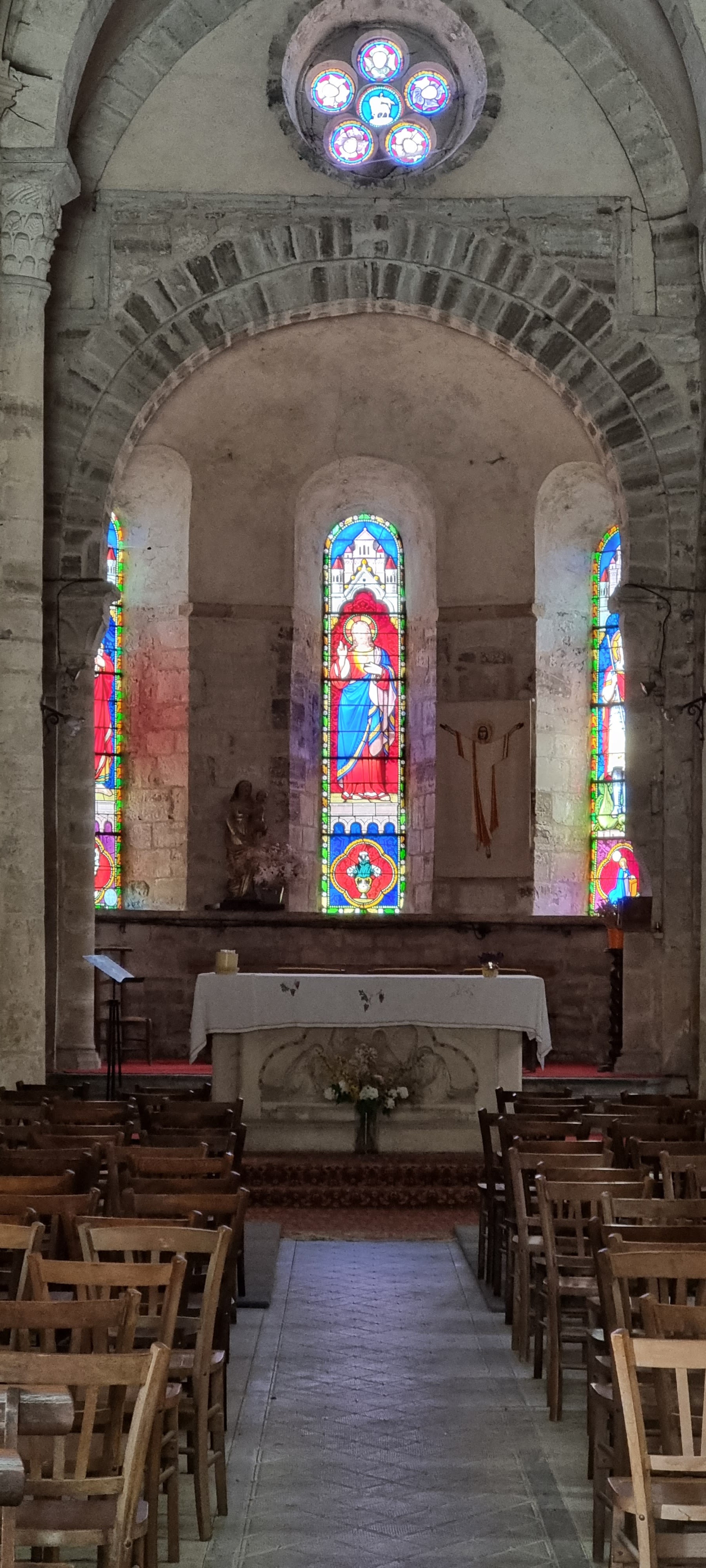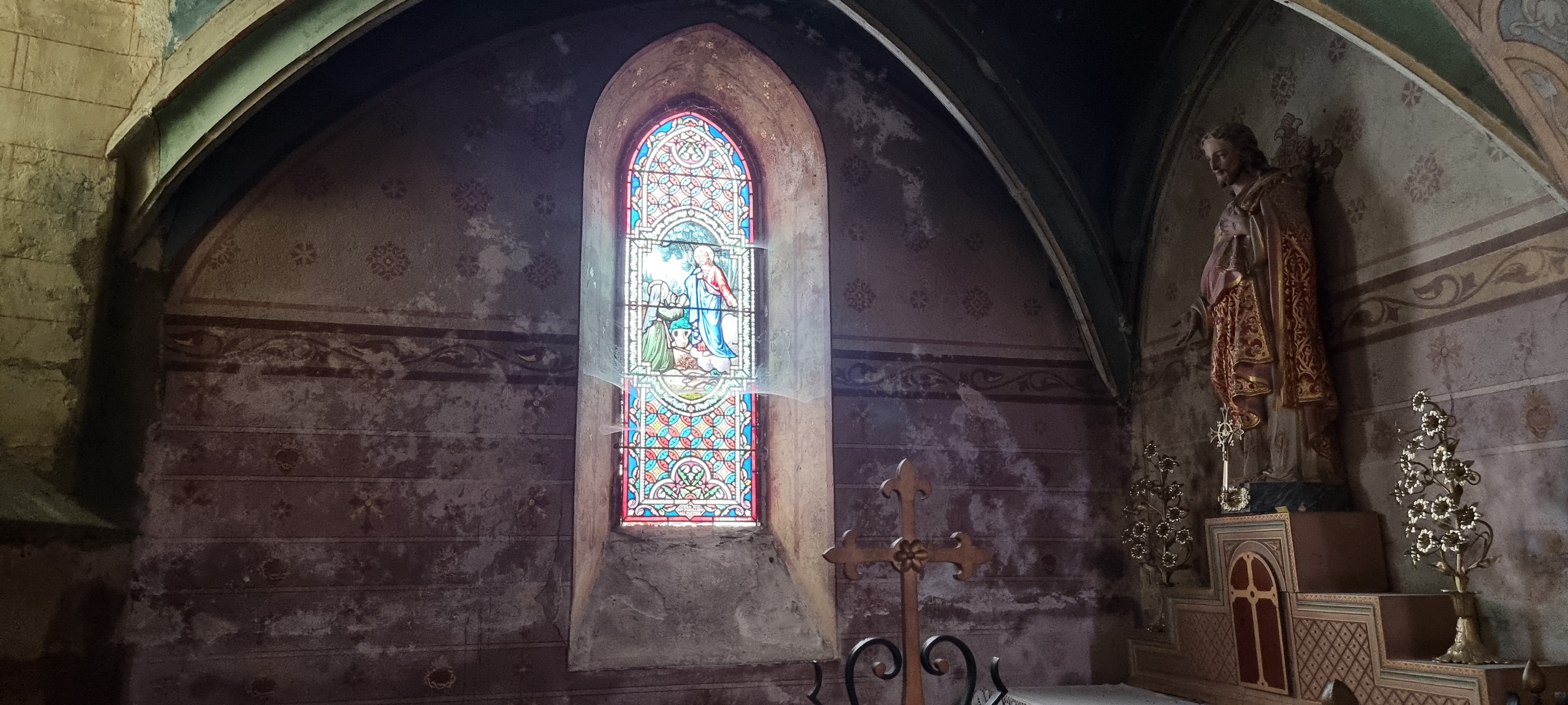 Très belle église avec de beaux vitraux et un mur représentant la grotte de Lourdes