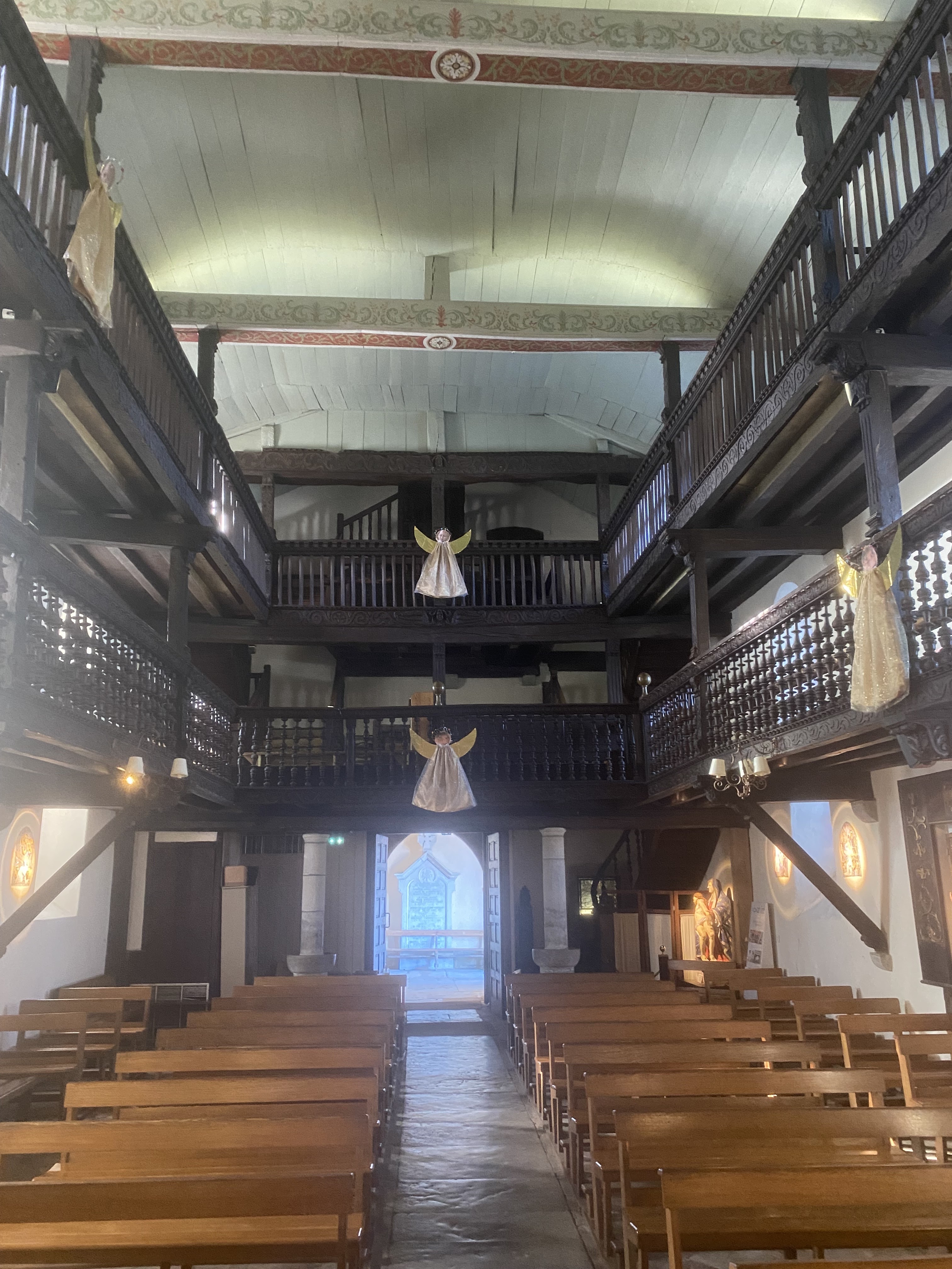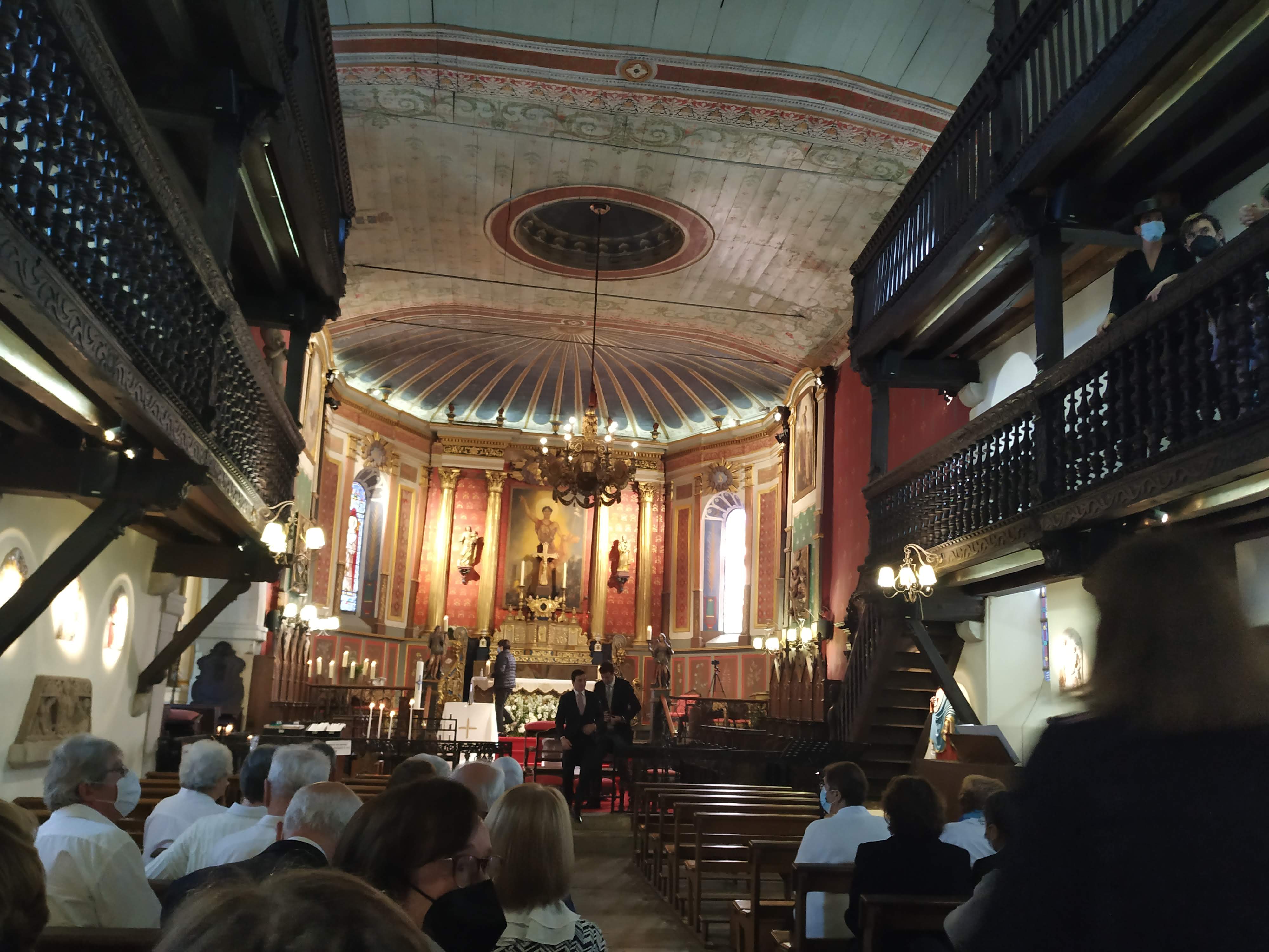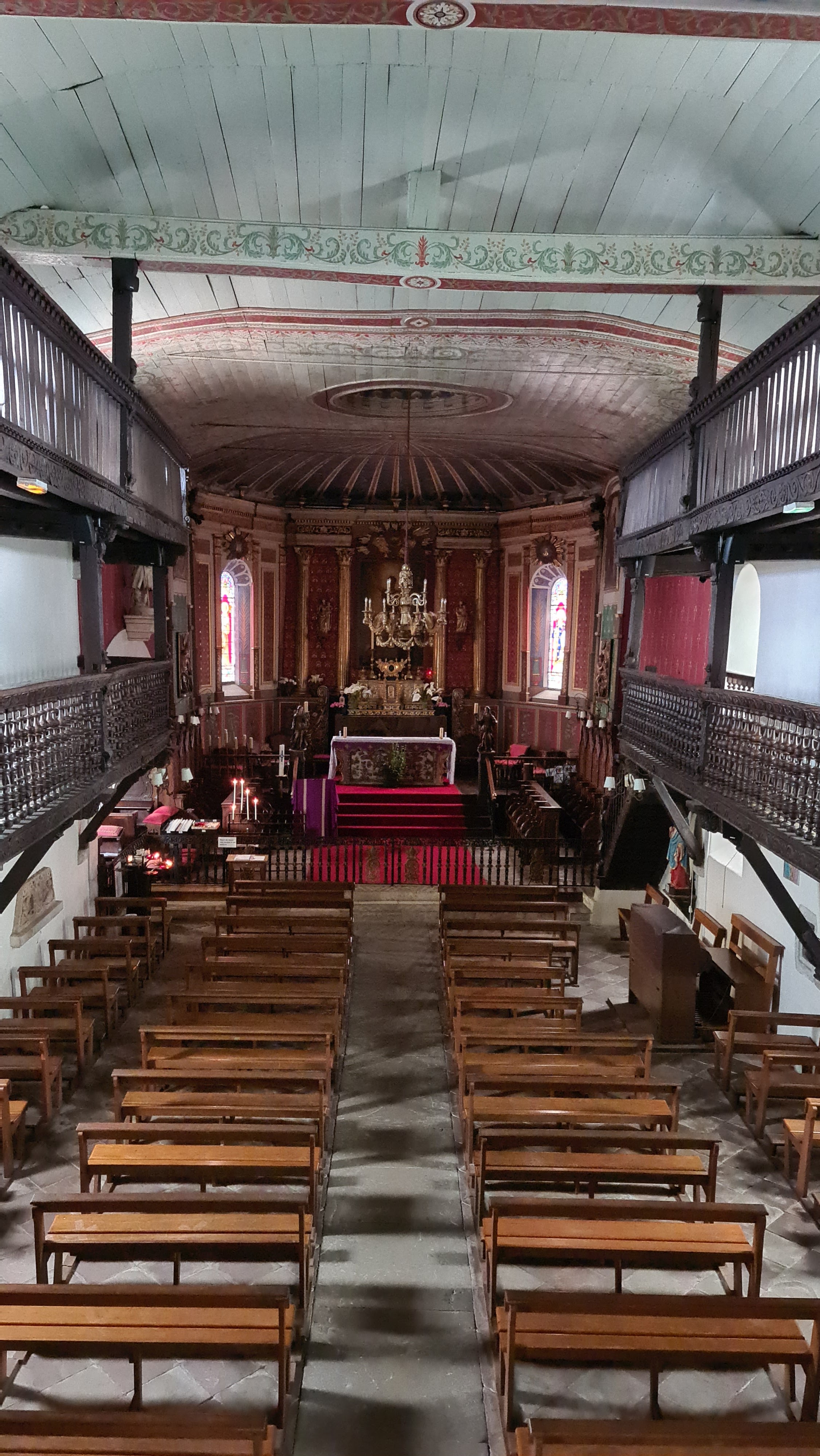 Jolie petite église typiquement basque avec ses deux niveaux de galeries en bois et son plafond en bois peint.