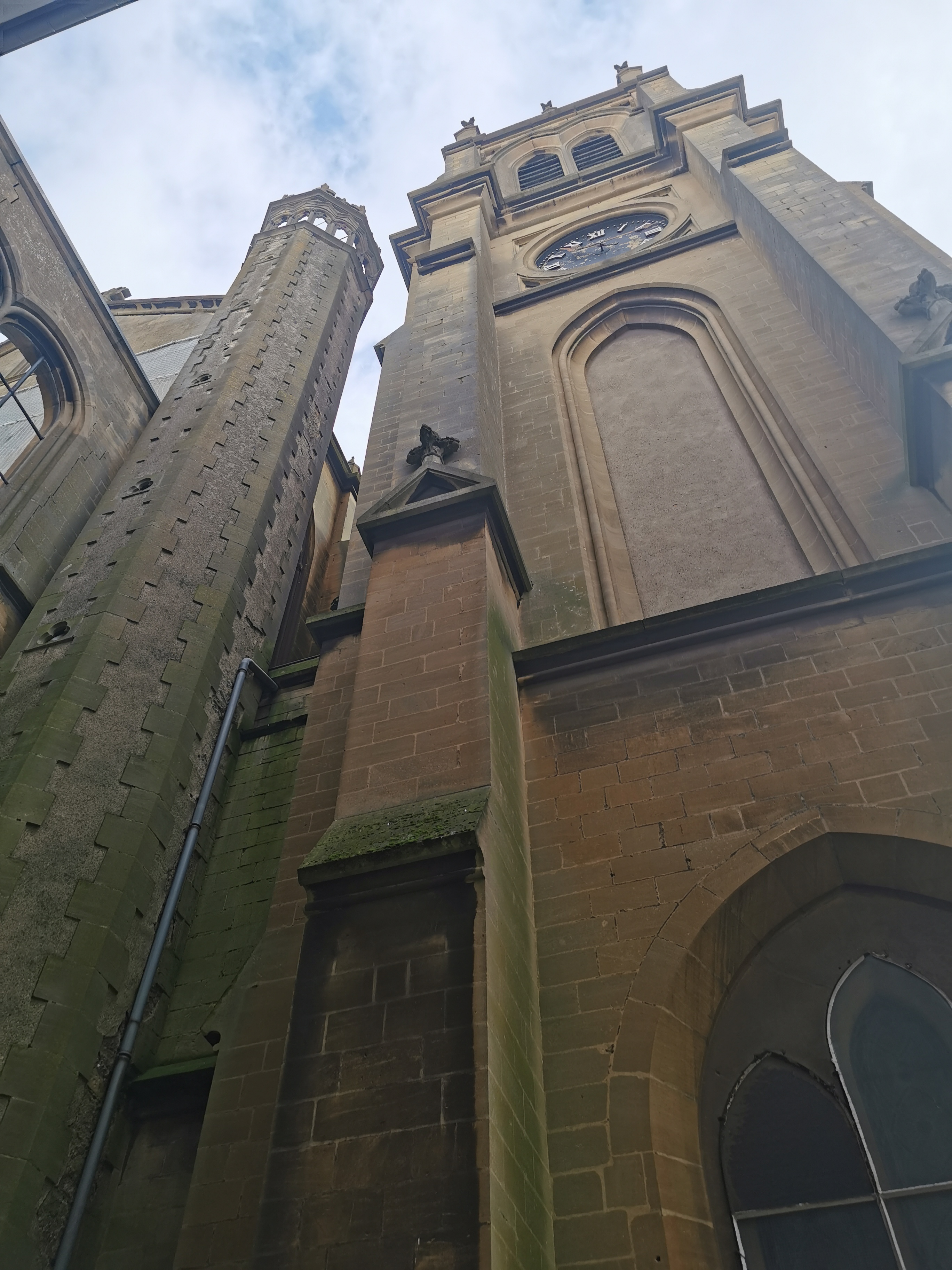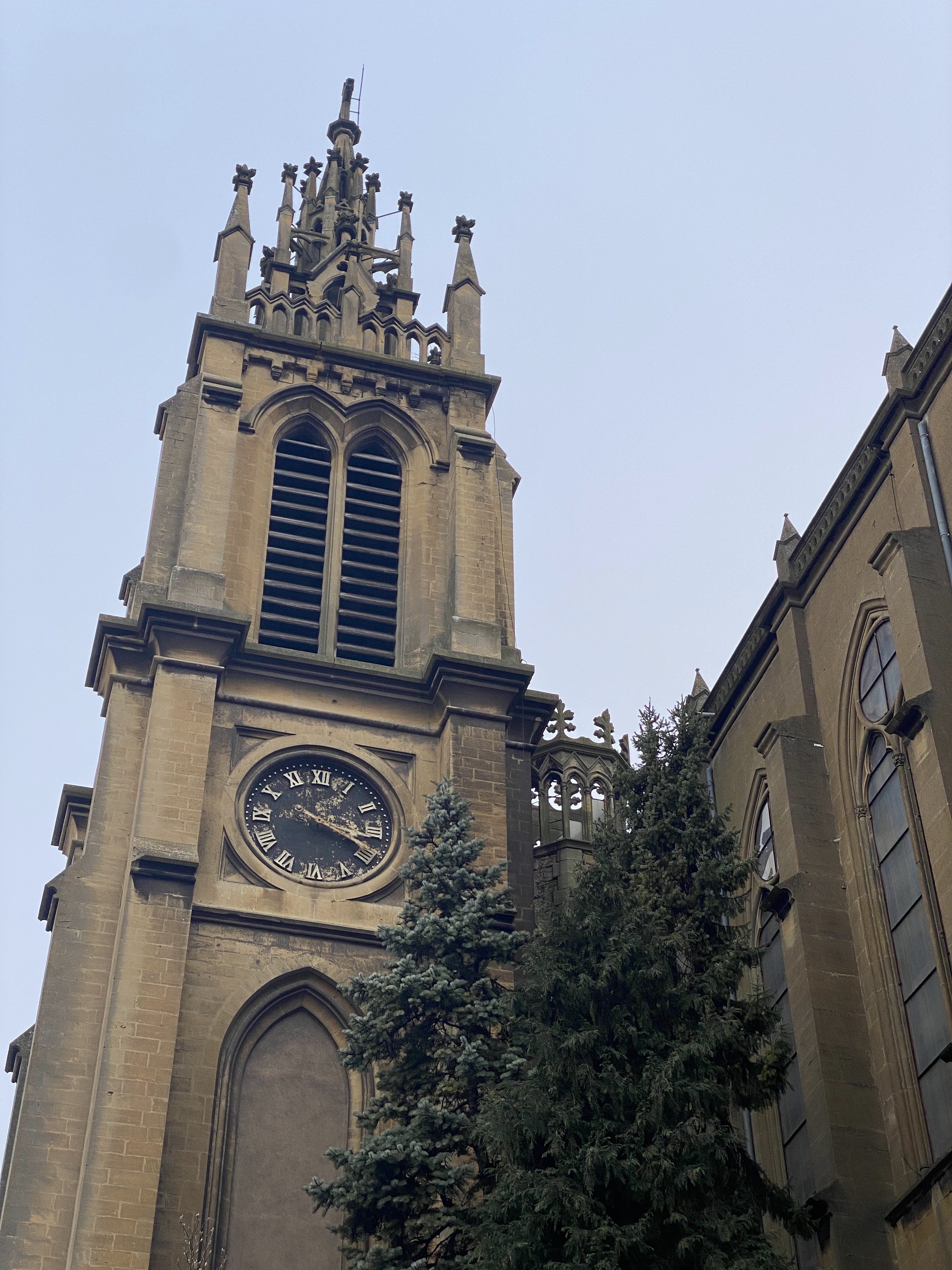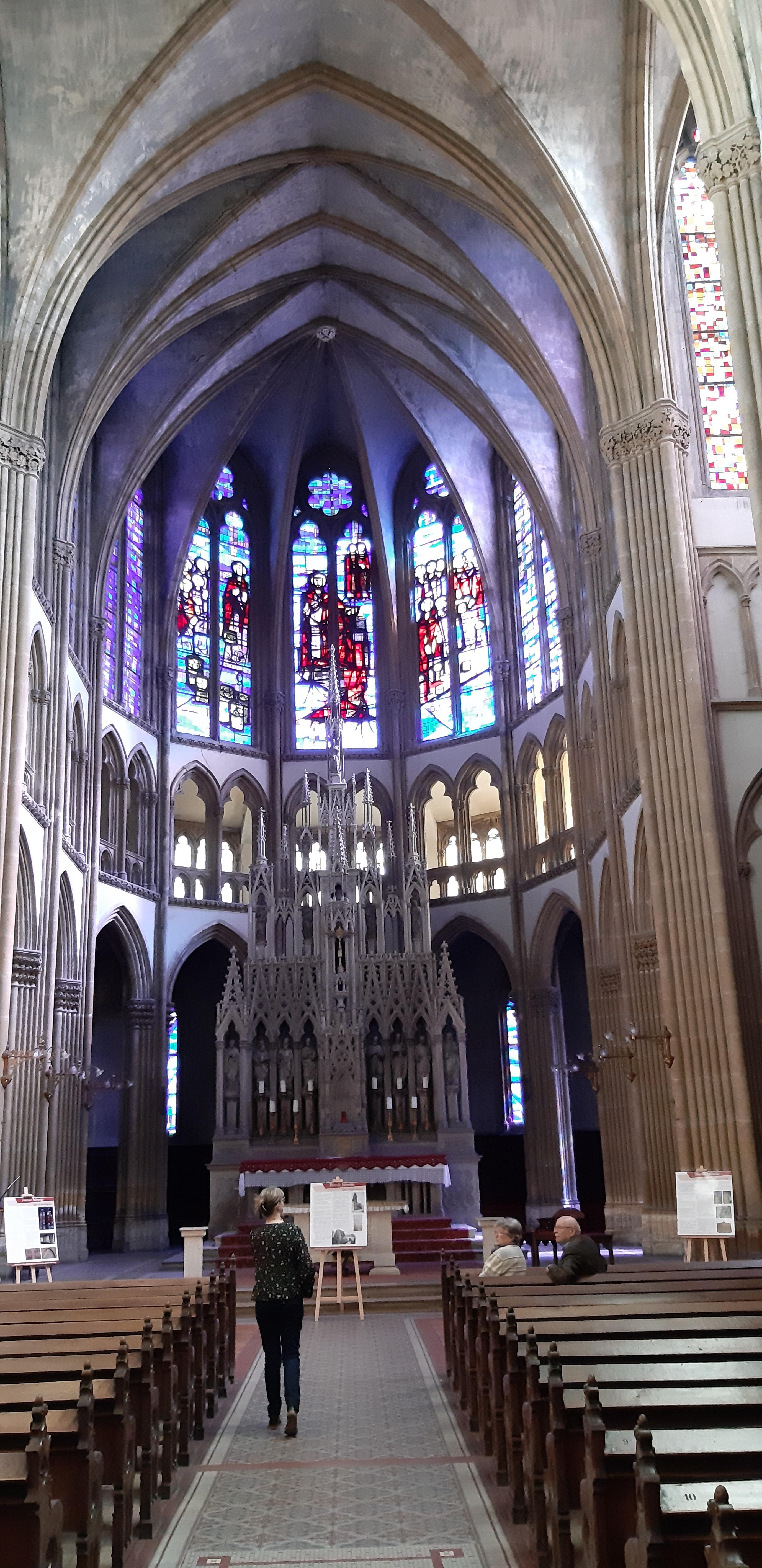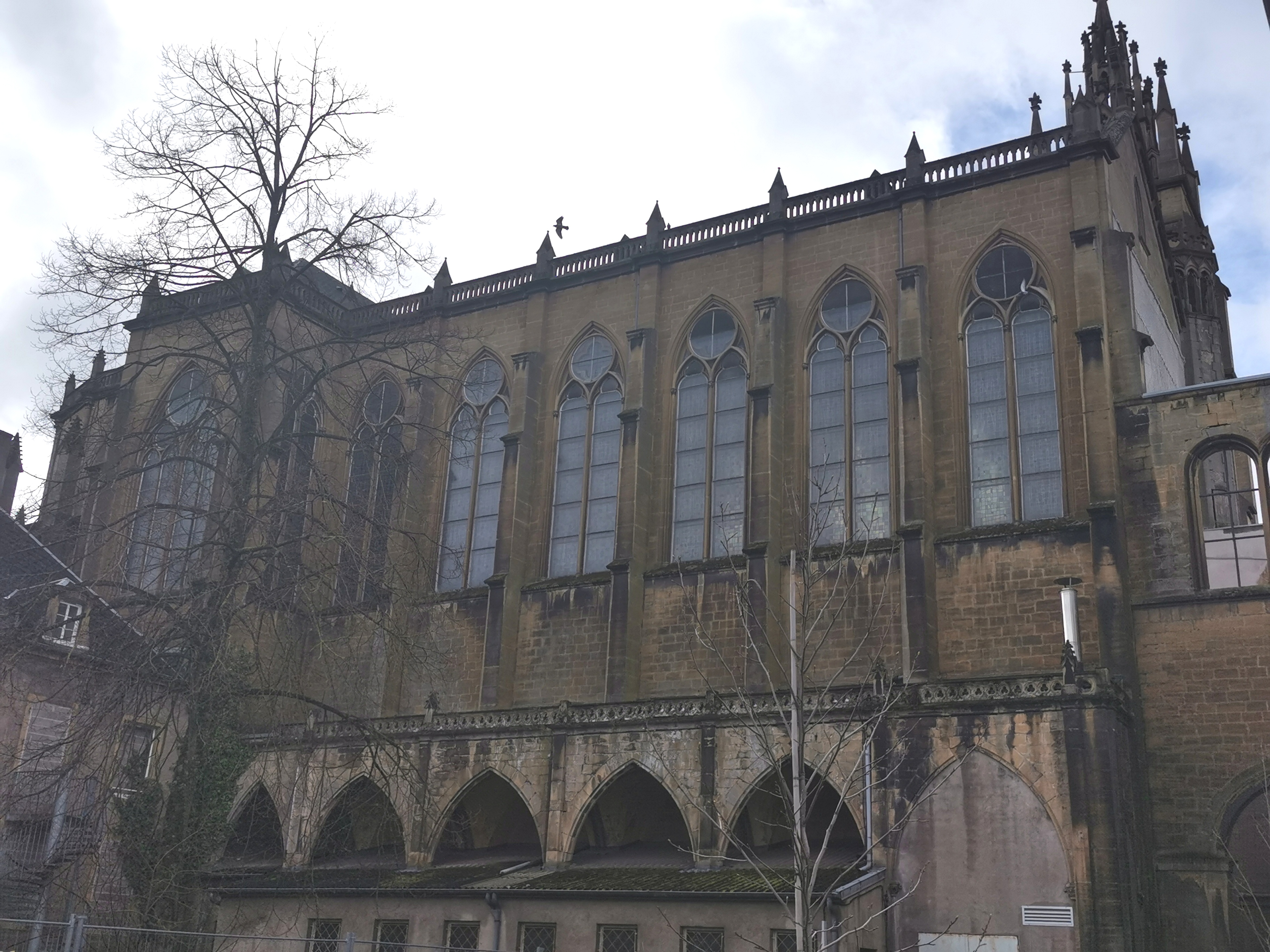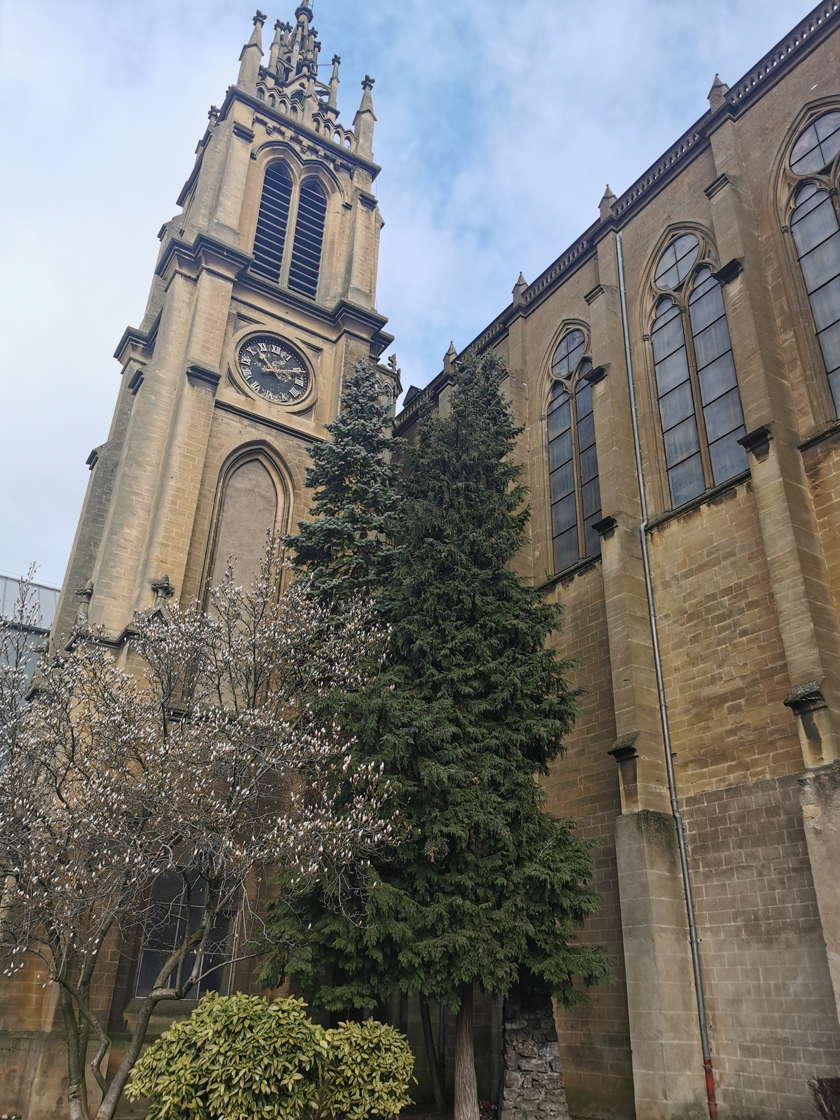 Église de style néo gothique dont la construction remonte à 1863. Malgré une qualité architecturale qui pourrait s'apparenter à celle d'une cathédrale, celle-ci n'a pas fait l'objet des attentions qu'elle mérite . La proximité immédiate de l'autoroute, des annexes contemporaines à l'abandon construites sur son flanc gauche et qui fusionnent grossièrement avec une partie de son architecture, des barres d'immeubles trop proches.... Comment a t-on pu laisser avancer un tel plan d'urbanisme si toutefois il y en ait eu un....!? Étrange impression que ce mélange incohérent de constructions semblant vouloir peu à peu étouffer l'église . Celle ci étant fermée, j'ai dû me contenter des photos sur le Web pour en apprécier sa beauté intérieure. Sa restauration sera laborieuse, pour autant qu'il lui soit attribuée un périmètre à la hauteur de sa grâce.