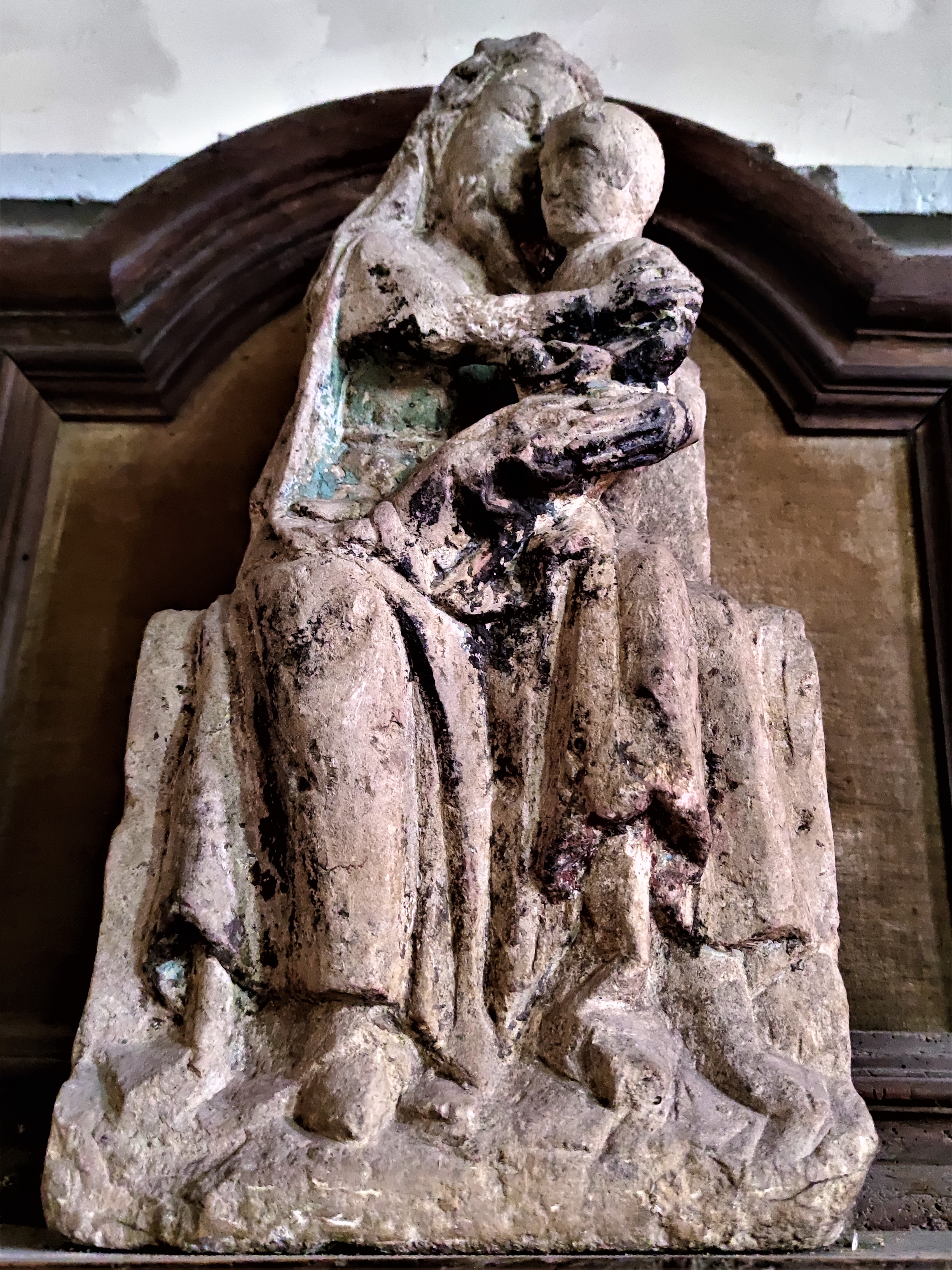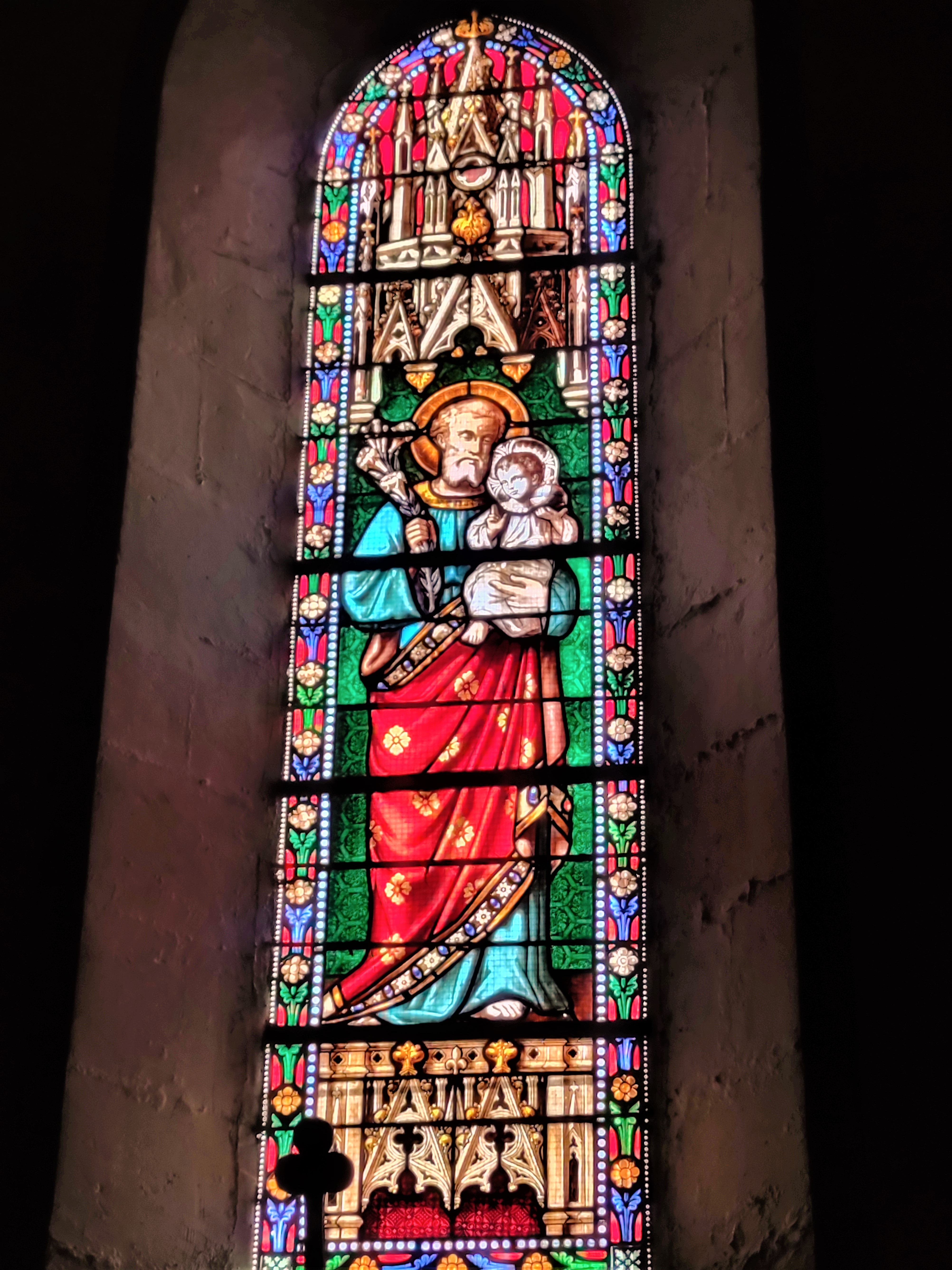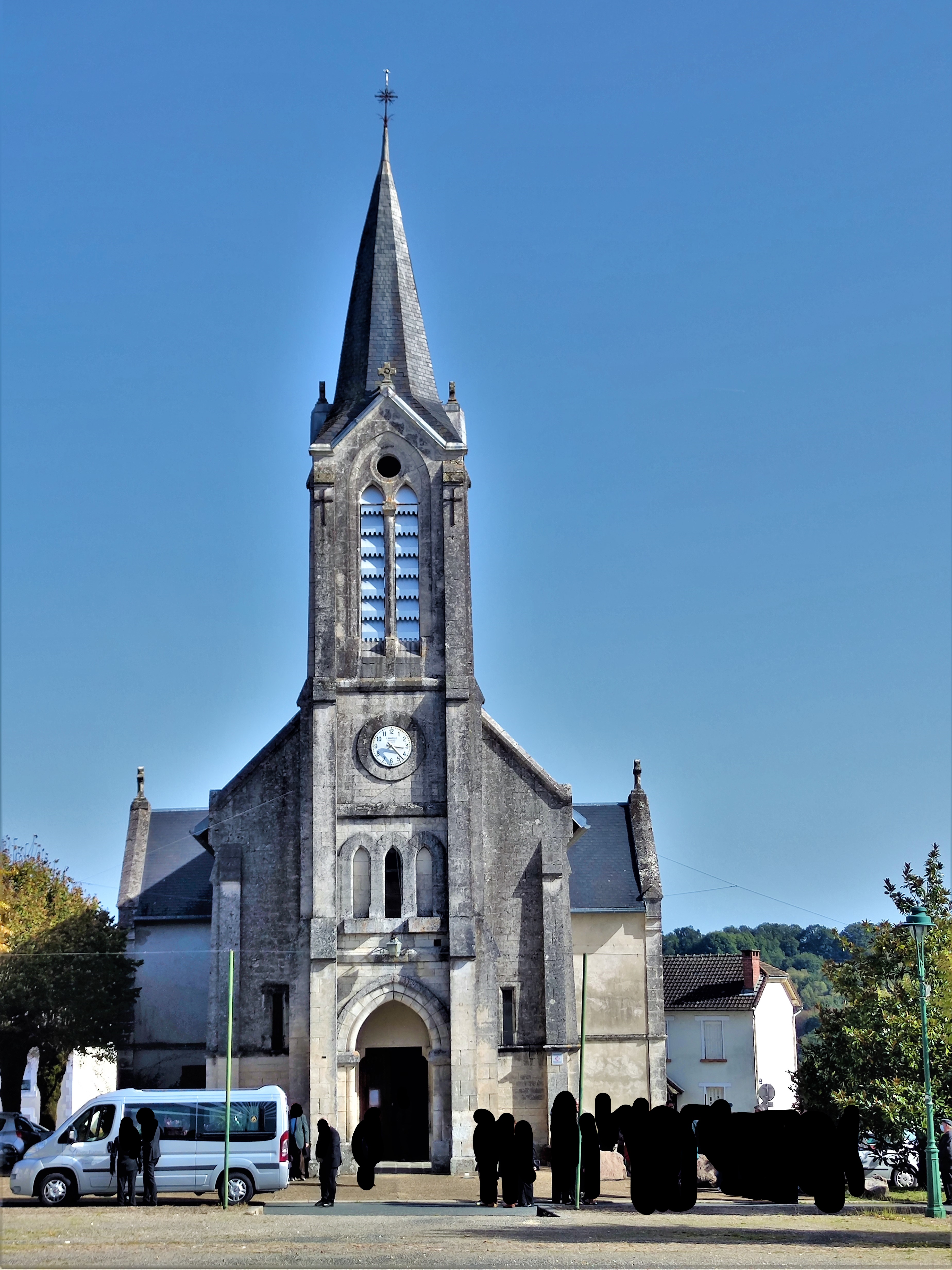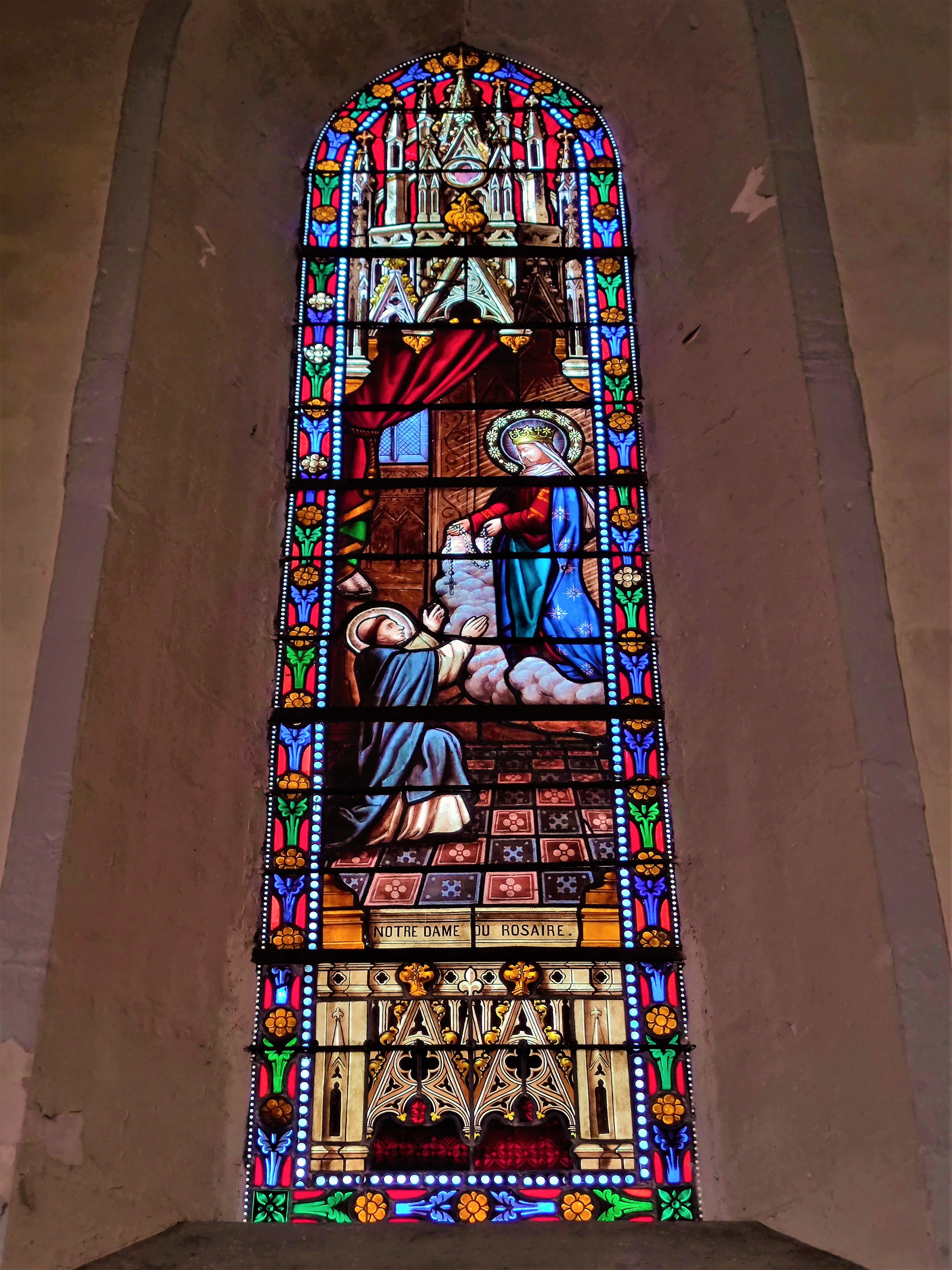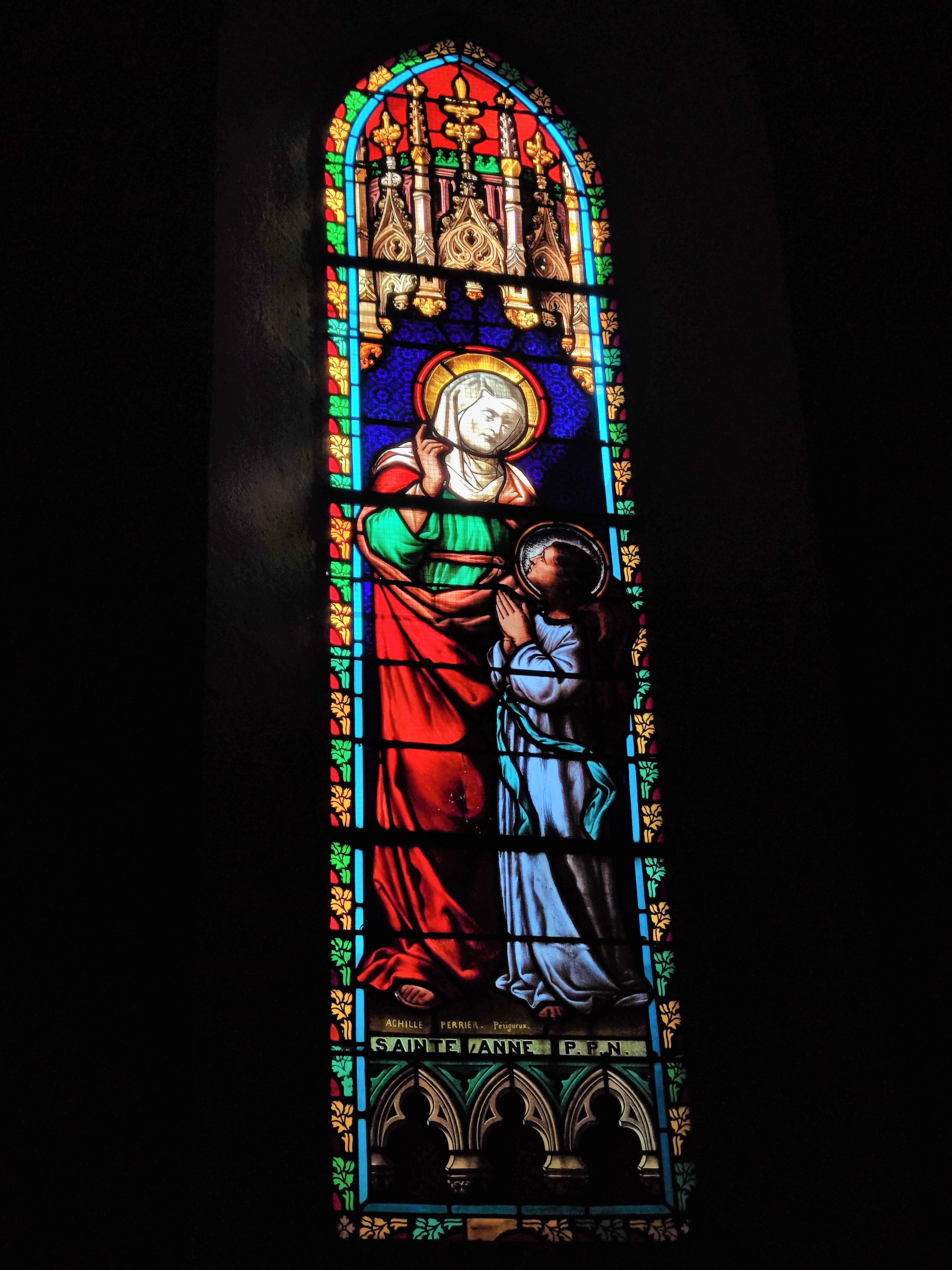 Une église assez banale, mais bien entretenue, ouverte et accueillante, citoyens et paroissiens en prennent soin. L'église actuelle, construite au 19ème, a pour principale qualité d'être ouverte ; ce dernier point apparaissant comme une obligation, m'a expliqué une paroissienne, ce village se trouvant sur un des chemins conduisant les pèlerins vers Saint-Jacques-de-Compostelle. Pour l'anecdote, il y aurait eu une église au 12ème, inaugurée par Richard-Cœur-De-Lion, lors de son passage. Cette cité, Sainte-Marie-de-Frugie prit le nom de La Coquille au 19ème, son histoire étant liée aux pèlerinages vers le tombeau de l'apôtre saint Jacques le Majeur. Et pourtant, il semble que les pèlerins n'ont laissé aucun témoignage de leur passage, si ce n'est l'histoire du racket dont ils étaient victimes. Depuis 2008, la mairie a mis en place un lieu d'accueil pour les pèlerins. Une église lumineuse, éclairée par des vitraux historiés dont 2, situés dans le chœur sont signés Achille Perrier, peintre-vitrailliste de Périgueux : Sainte-Anne et Saint-Jean Baptiste. La statue en pierre de la Vierge à l'enfant, sculptée il y a 800 ans, est un témoignage émouvant du savoir-faire des artistes médiévaux. J'ai reçu un accueil chaleureux dans cette église, lieu propre au recueillement, à la prière ou à un moment de détente.