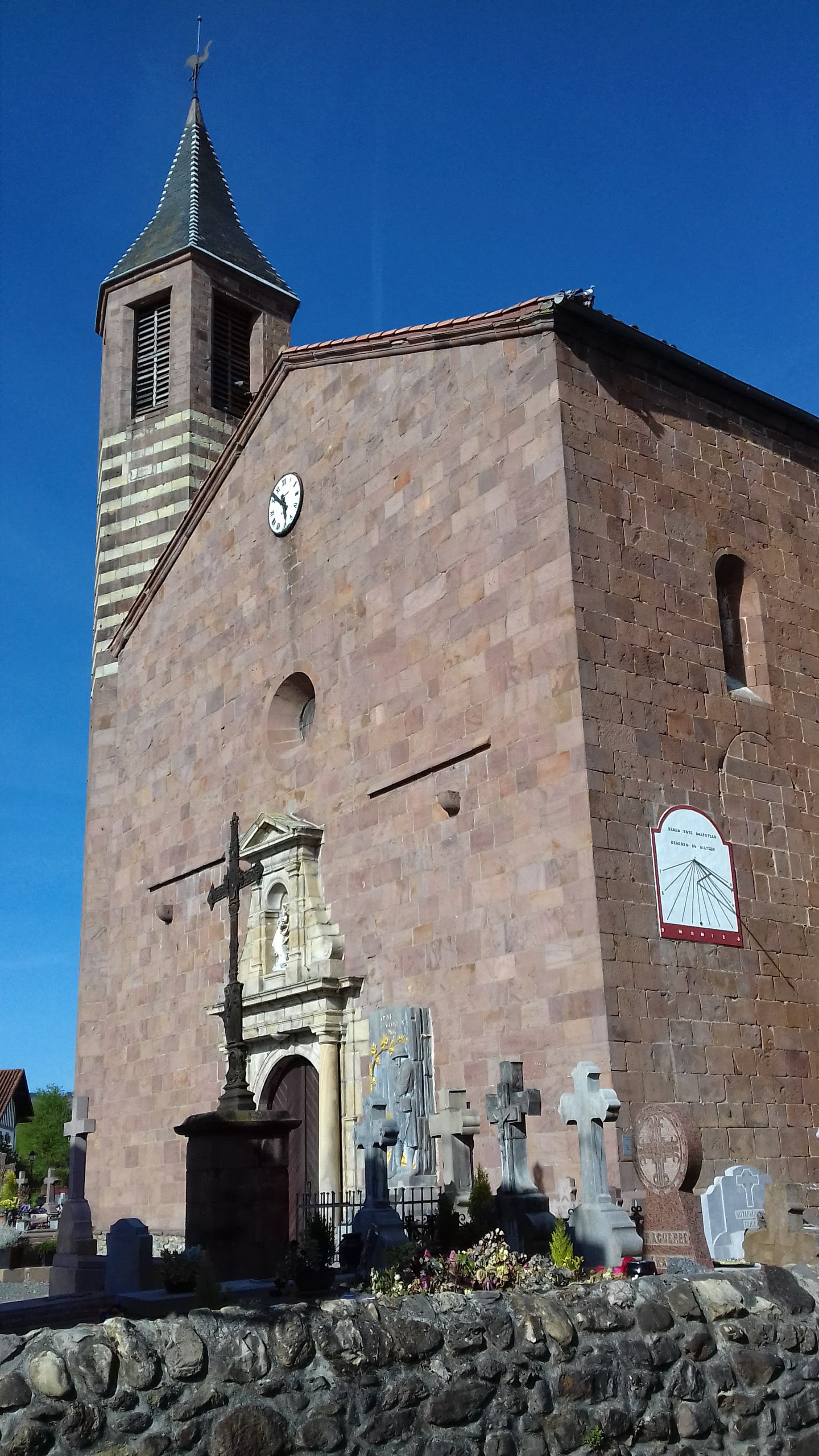 Église sympathique en pierres du pays, grès rouge. Un clocher bicolore coiffé d'un toit en ardoise. Un intérieur assez sombre, avec de beaux vitraux. Un très bel orgue, quelques tableaux.