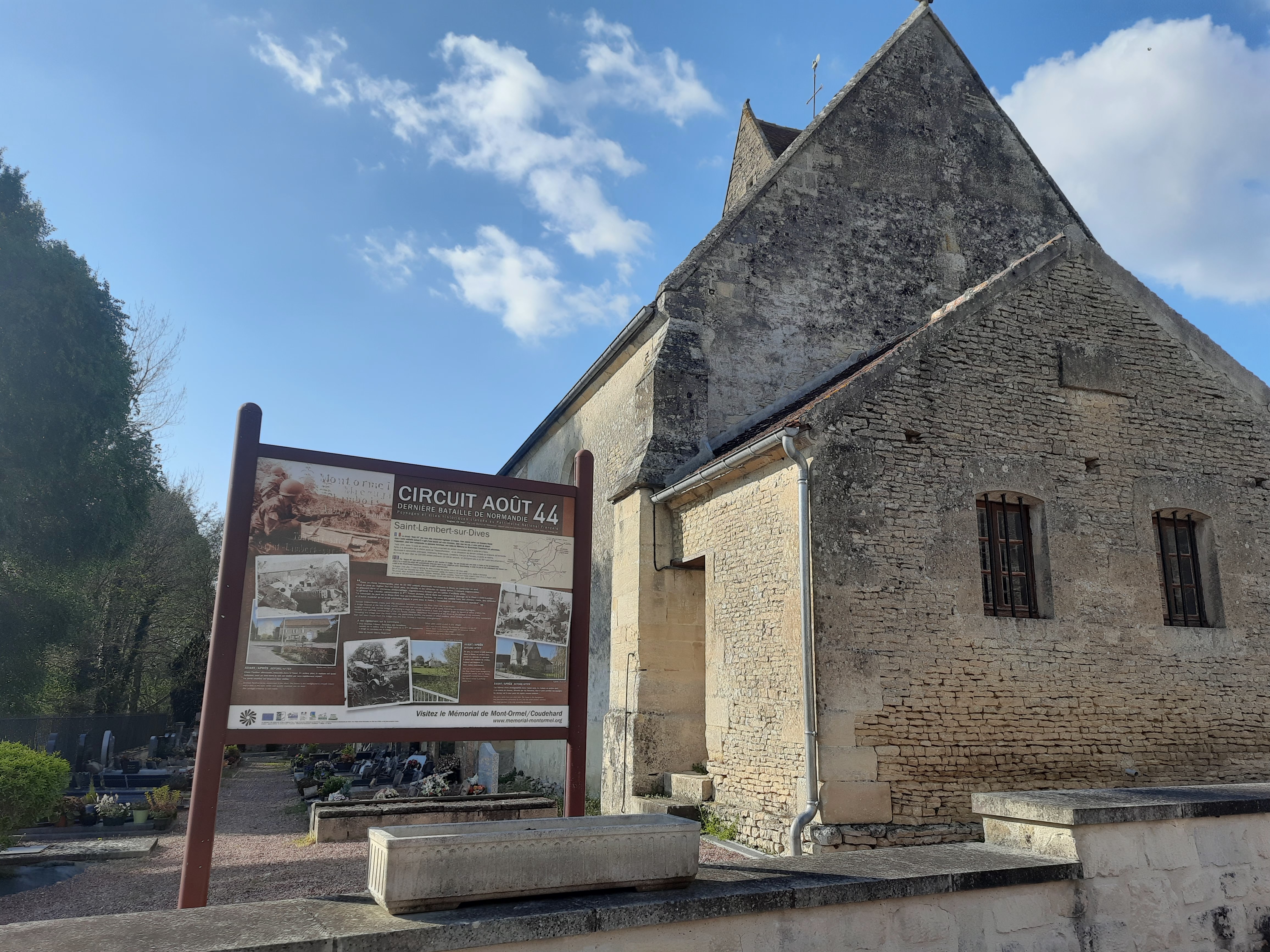 Nouvelle étape du circuit Août 1944. Le panneau est situé à l'entrée du cimetière attenant à l'église.