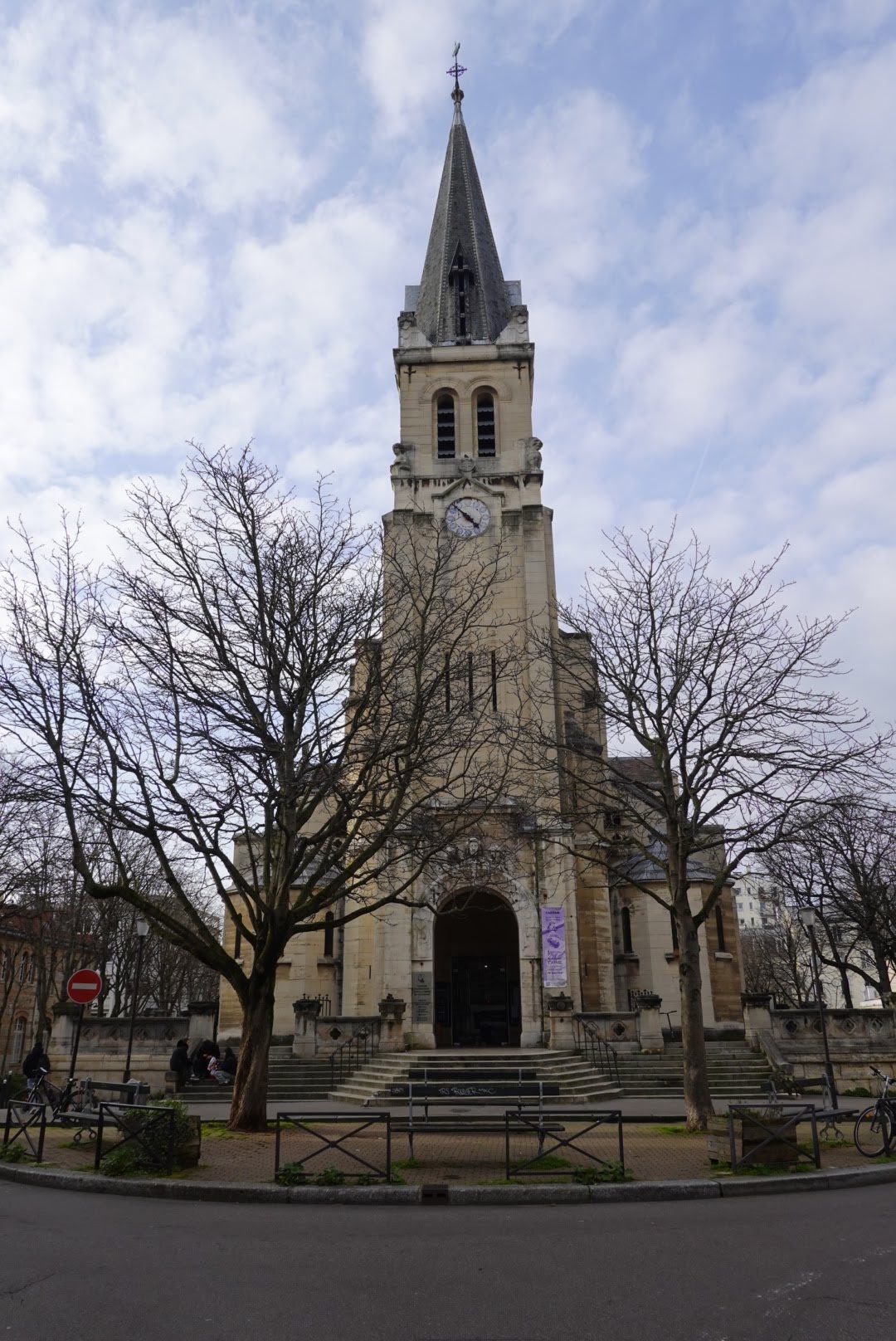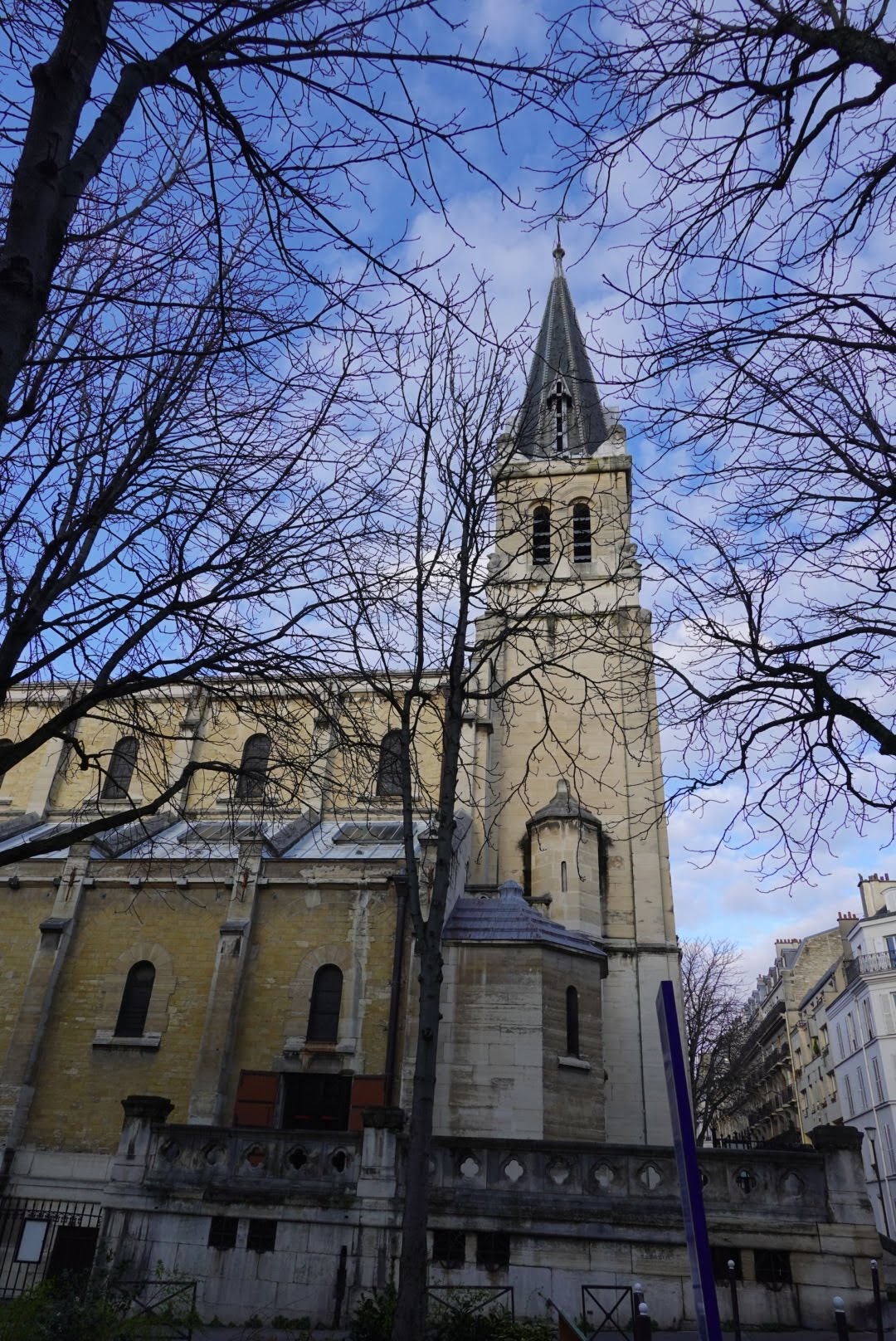 Un édifice religieux Chrétien classique sur une petite place Parisienne au calme.