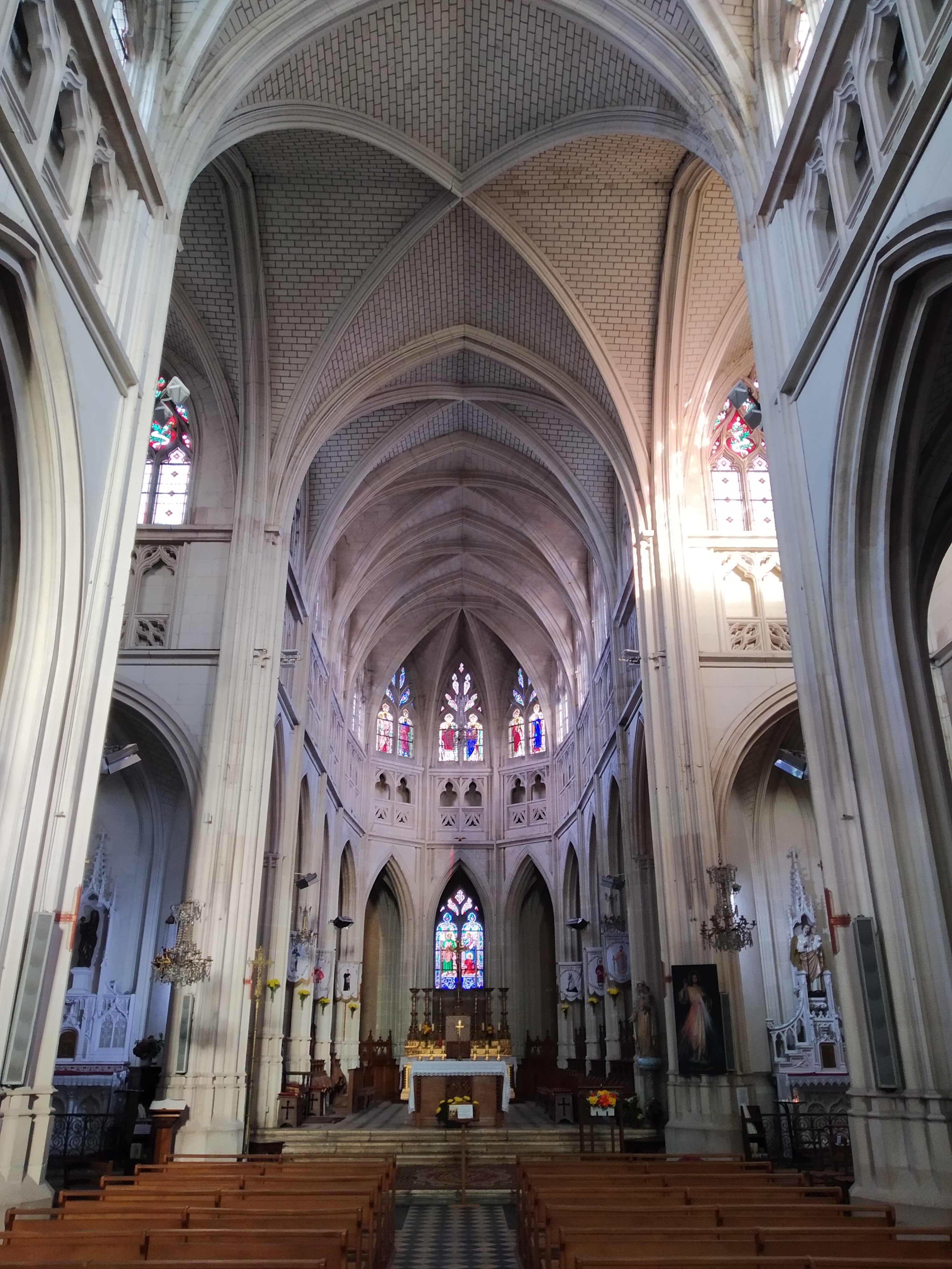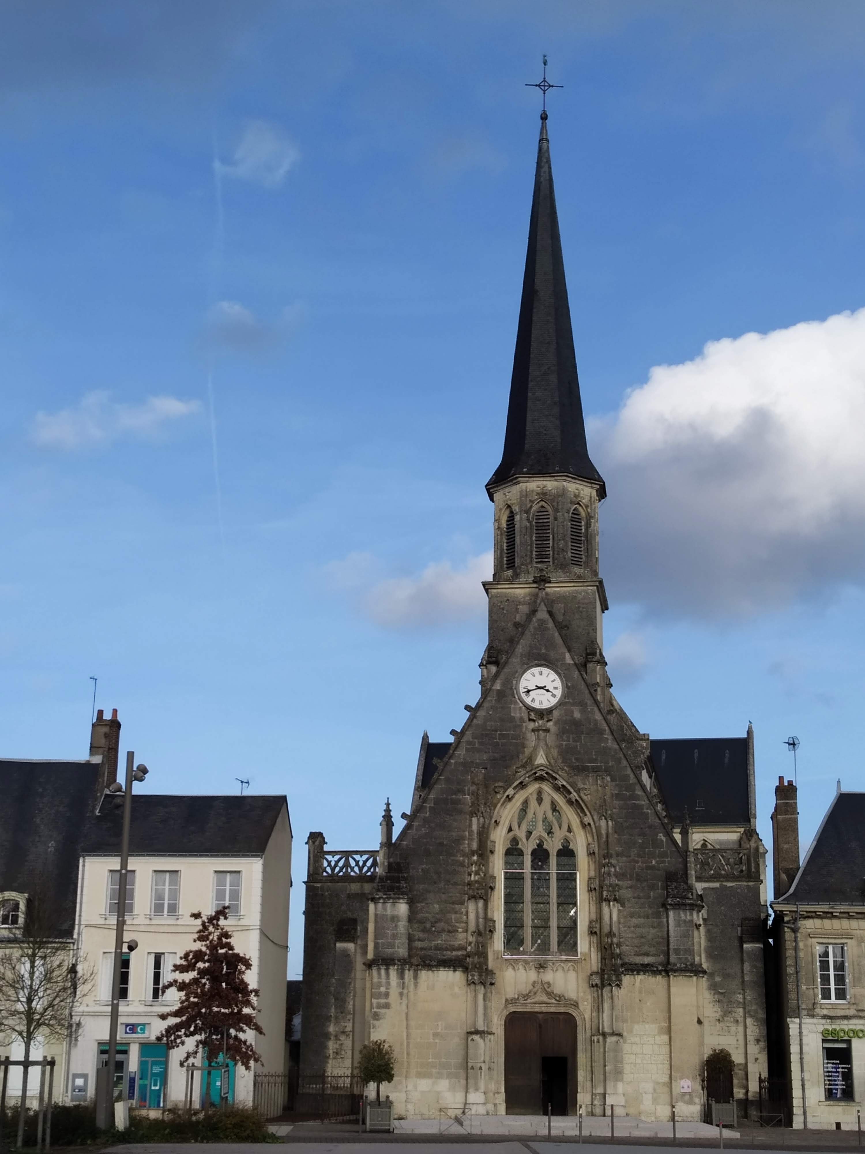 Conséquemment à de multiples incendies, cet édifice fut plusieurs fois reconstruit. Aujourd'hui, c'est une église de style néo-gothique flamboyant du 19ème, la façade est celle d'un ancien édifice du 16ème siècle, également de style gothique flamboyant. Le visiteur pénètre dans un narthex qui s'ouvre sur une nef à trois vaisseaux. Ces derniers sont séparés par des arcatures reposant sur de gros piliers au niveau de la nef centrale, et des arcatures reposant sur des piliers engagés entourent les baies des collatéraux. Le chœur est imposant, encadré par des chapelles logées à l'extrémité orientale des nefs latérales. Les verrières éclairent joliment l'église et sont équipées de vitraux de la même époque. La façade ouest donne sur la place centrale de Montoire-sur-le-Loir, l'église est ouverte et accueillante.