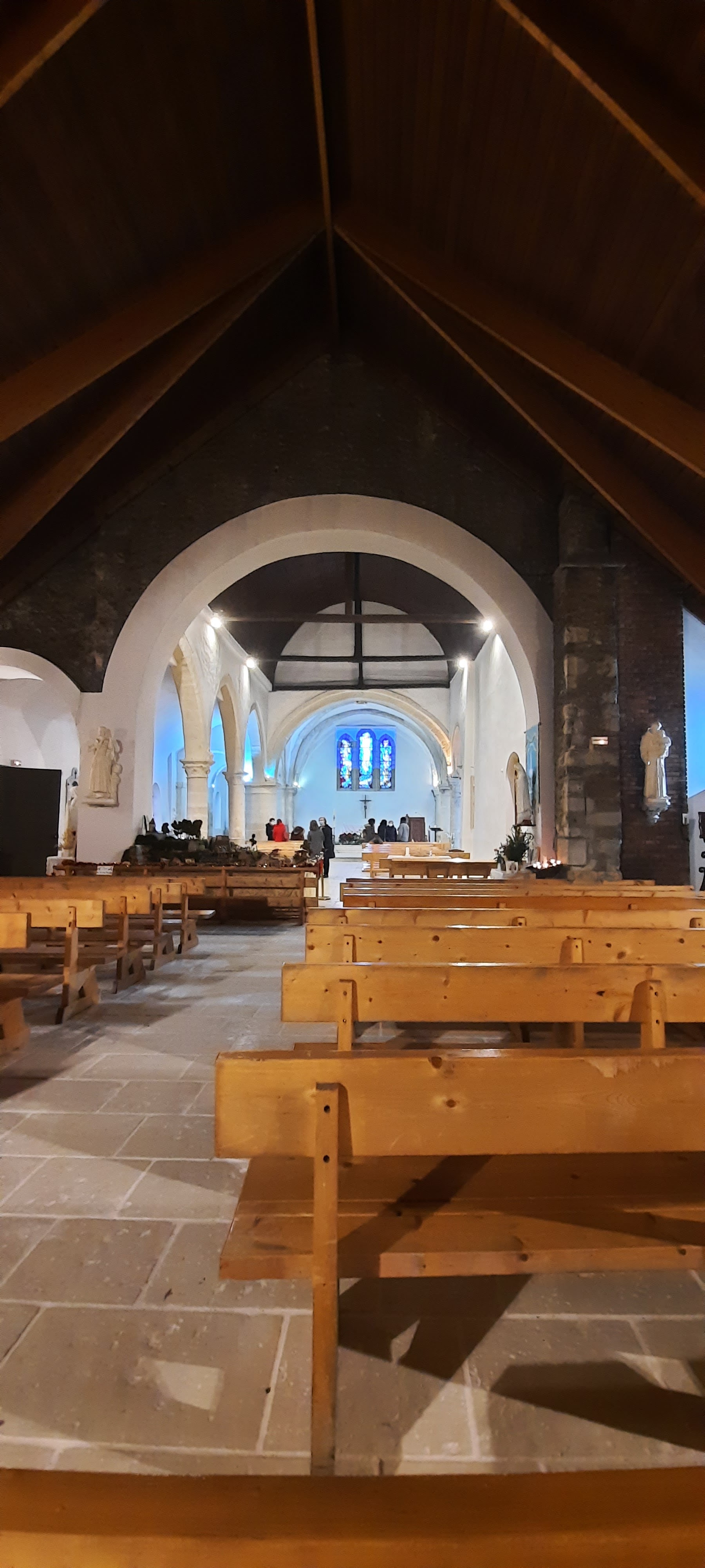 L'église de Bois d'Arcy, pas très grande mais chaleureuse. Une crypte en-dessous avec des salles qui permettent de favoriser des rencontres ou de faire des activités. Après la messe, il y avait une activité prévue des scouts. J'ai découvert, parce que cela faisait longtemps que je n'étais pas allée, qu'il y avait au-dessus de l'autel un TNI, ce qui permettait de lire les chants. La crèche était encore là. Le parking pour se garer est petit, prévoir de la marge pour se garer dans les rues adjacentes. Pour accéder à l'Église, il y a des marches mais aussi une rampe d'accès.
