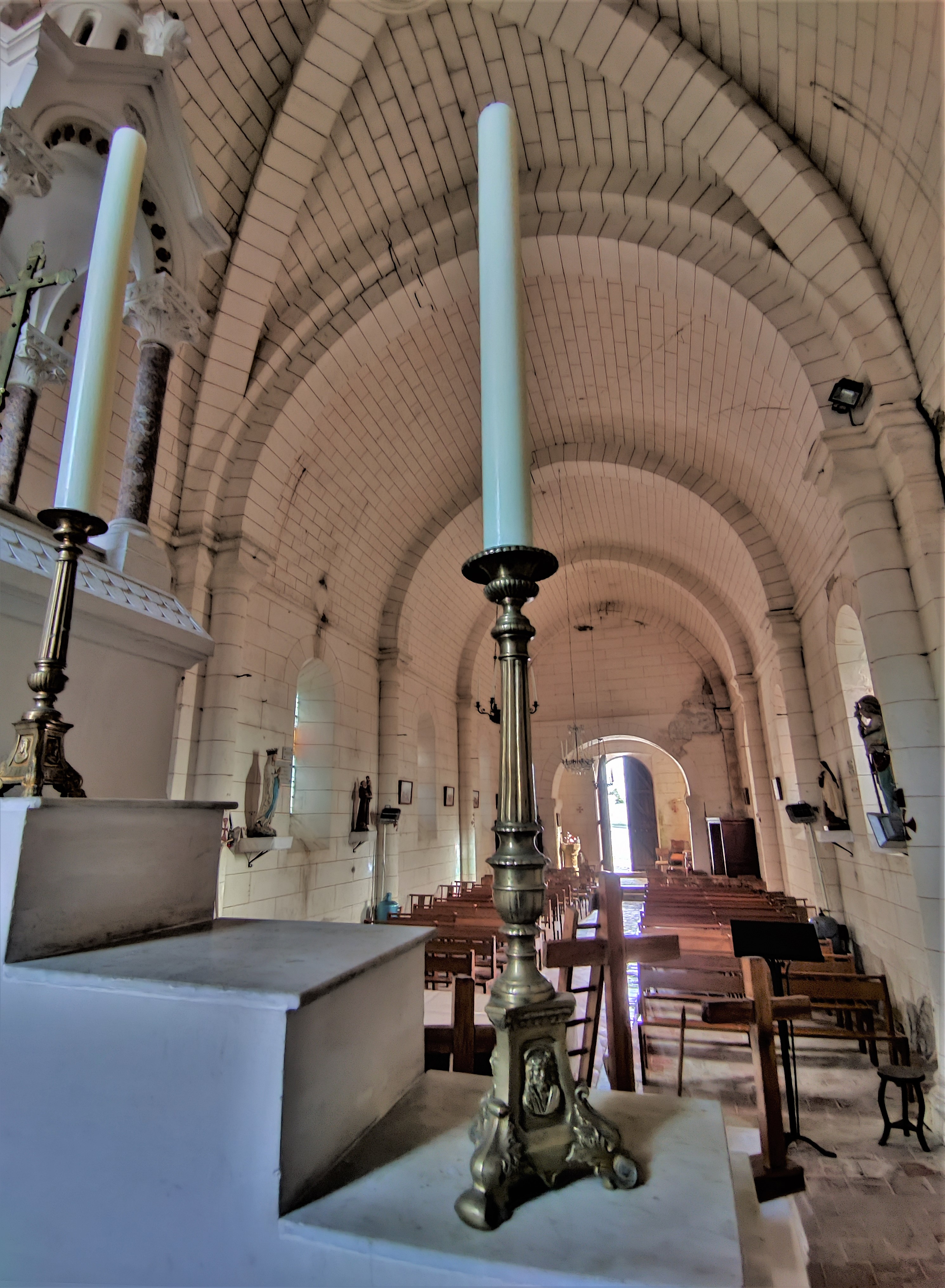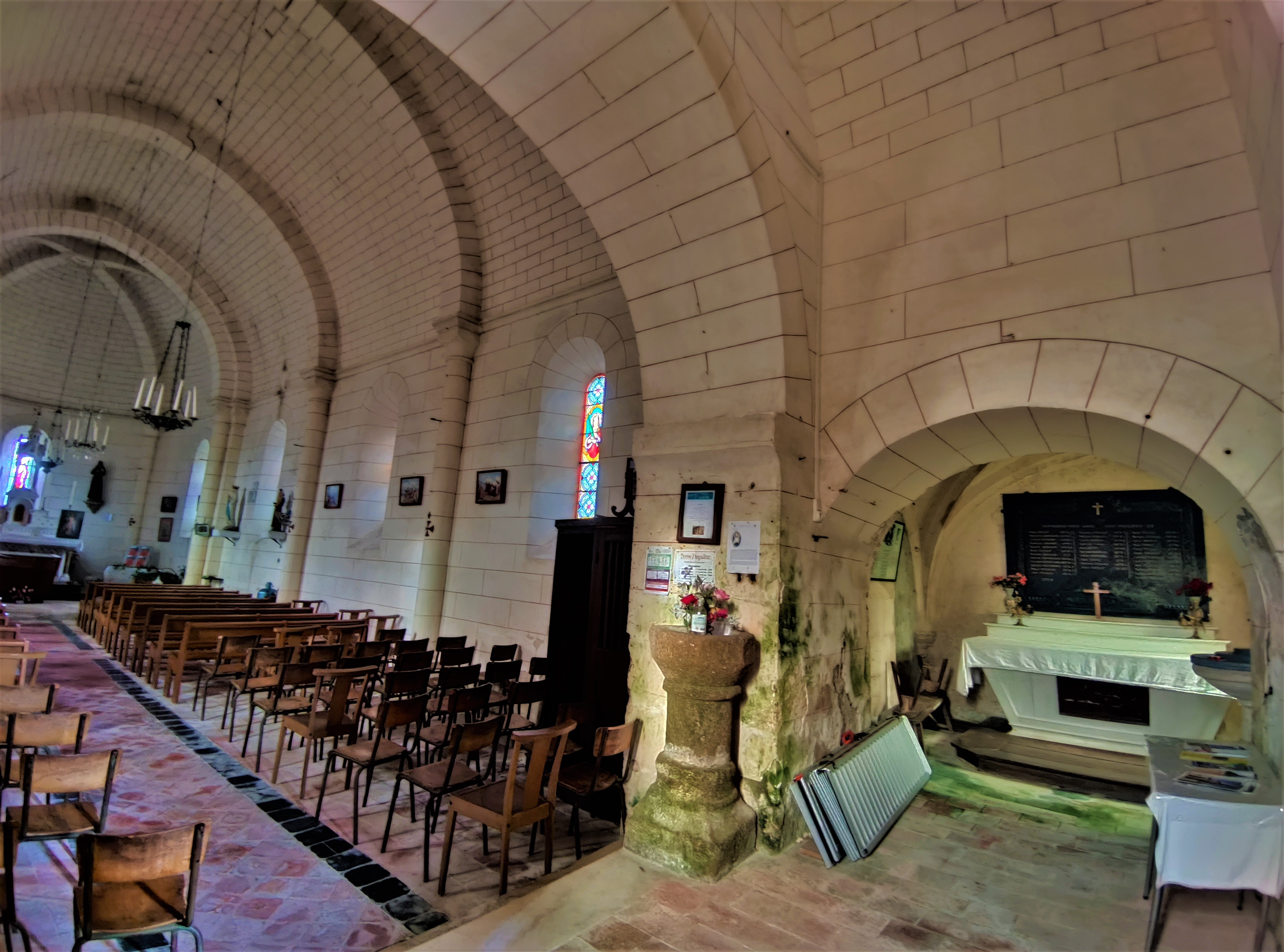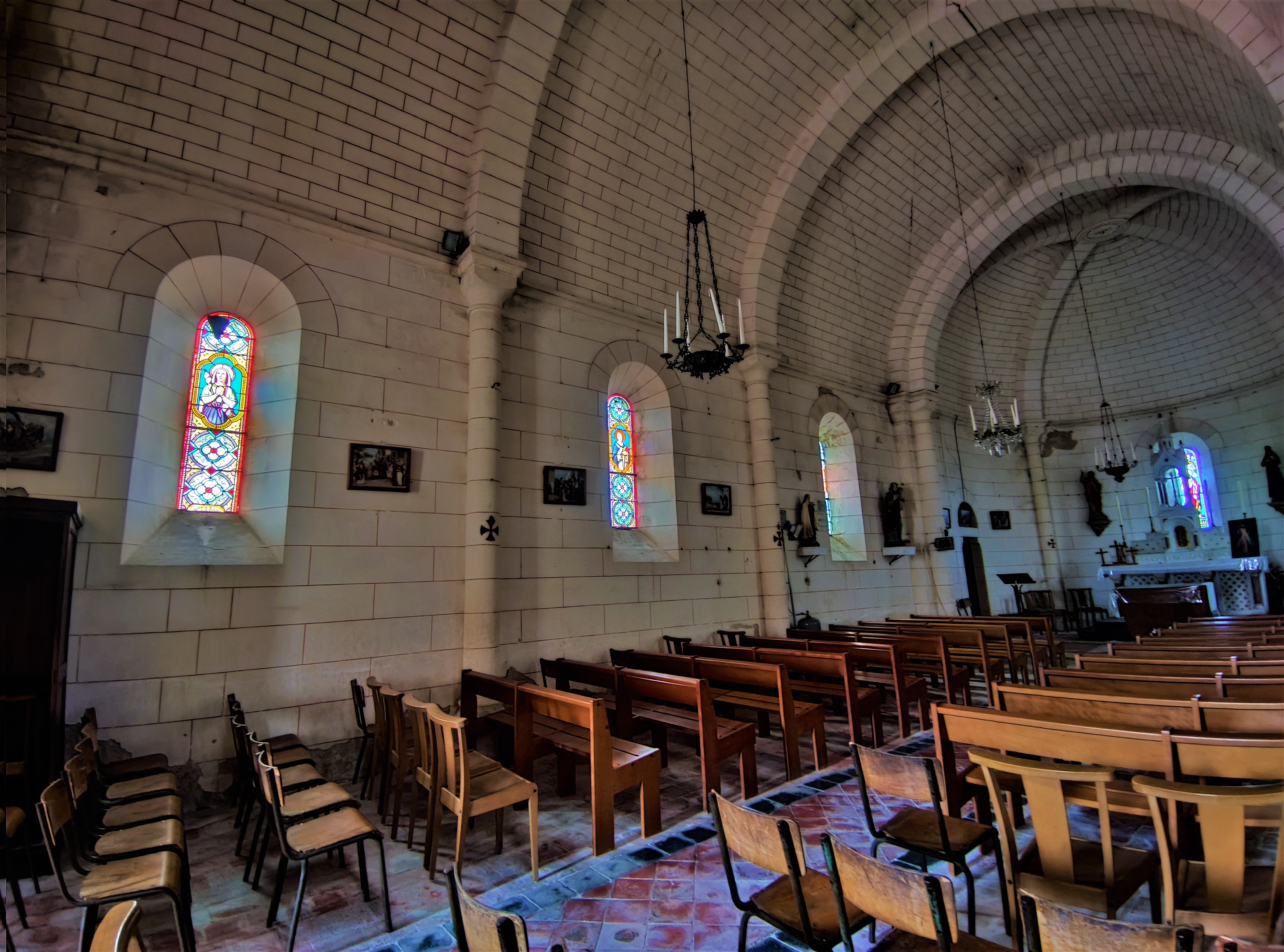 De l'église romane reste la travée sous clocher, qui est le chœur primitif, et la chapelle qui y est accolée. L'église construite au 19ème siècle est désorientée, on entre à l'Est par un porche en pierre qui s'ouvre sur le chœur roman. La chapelle du 15ème est ouverte d'une baie gothique. La nef à vaisseau unique est dotée d'une voûte de briques, en berceau, avec arcs doubleaux, les ouvertures sont en plein cintre. L'abside est ouverte de trois baies en plein cintre et voûtée en croisée d'ogives. L'ensemble des vitraux est de belle facture, l'éclairage est agréable. Il faut prendre les clés à la mairie située tout près. J'ai apprécié cette visite toute simple, le chemin de croix m'a bien plu.