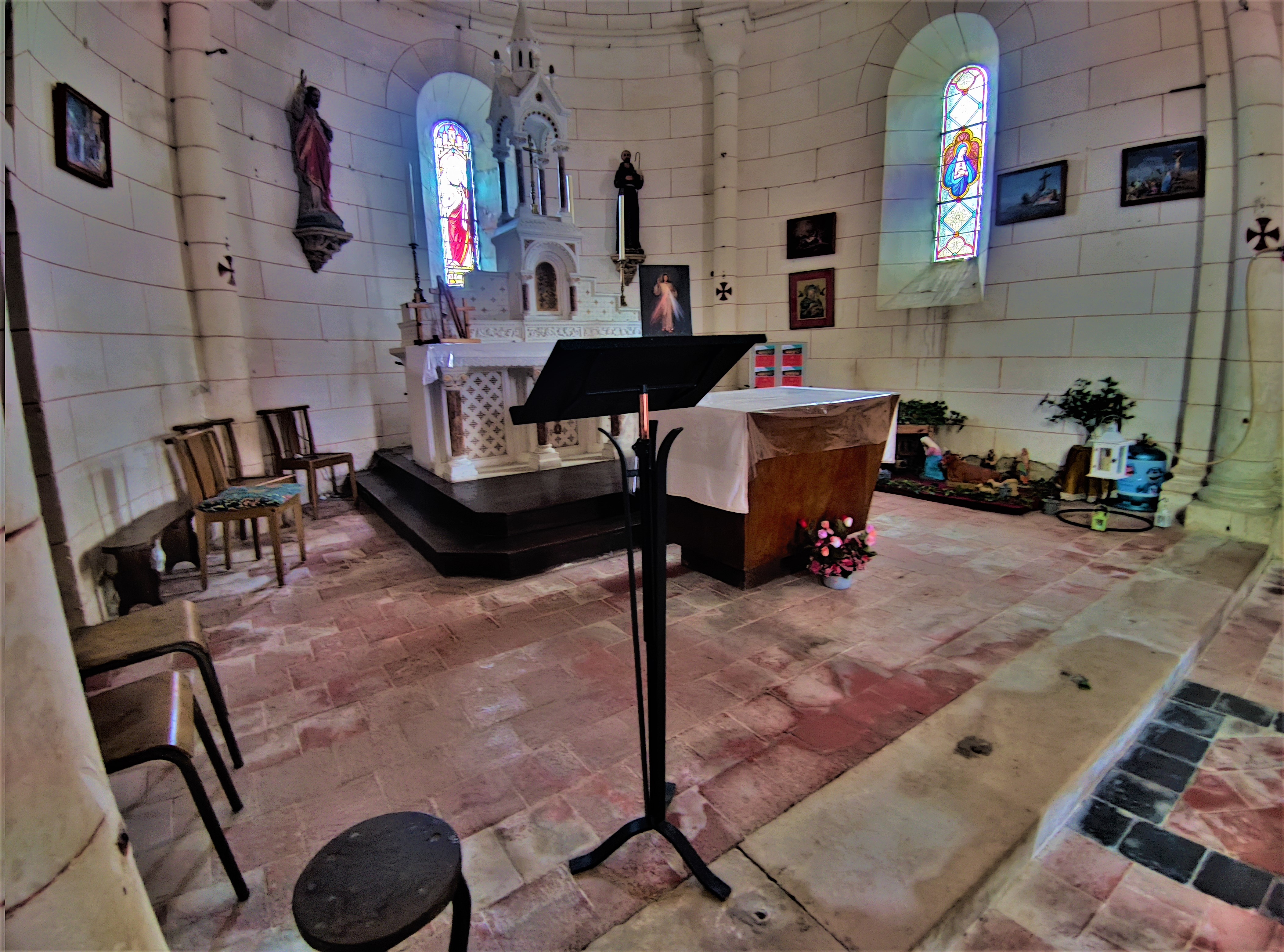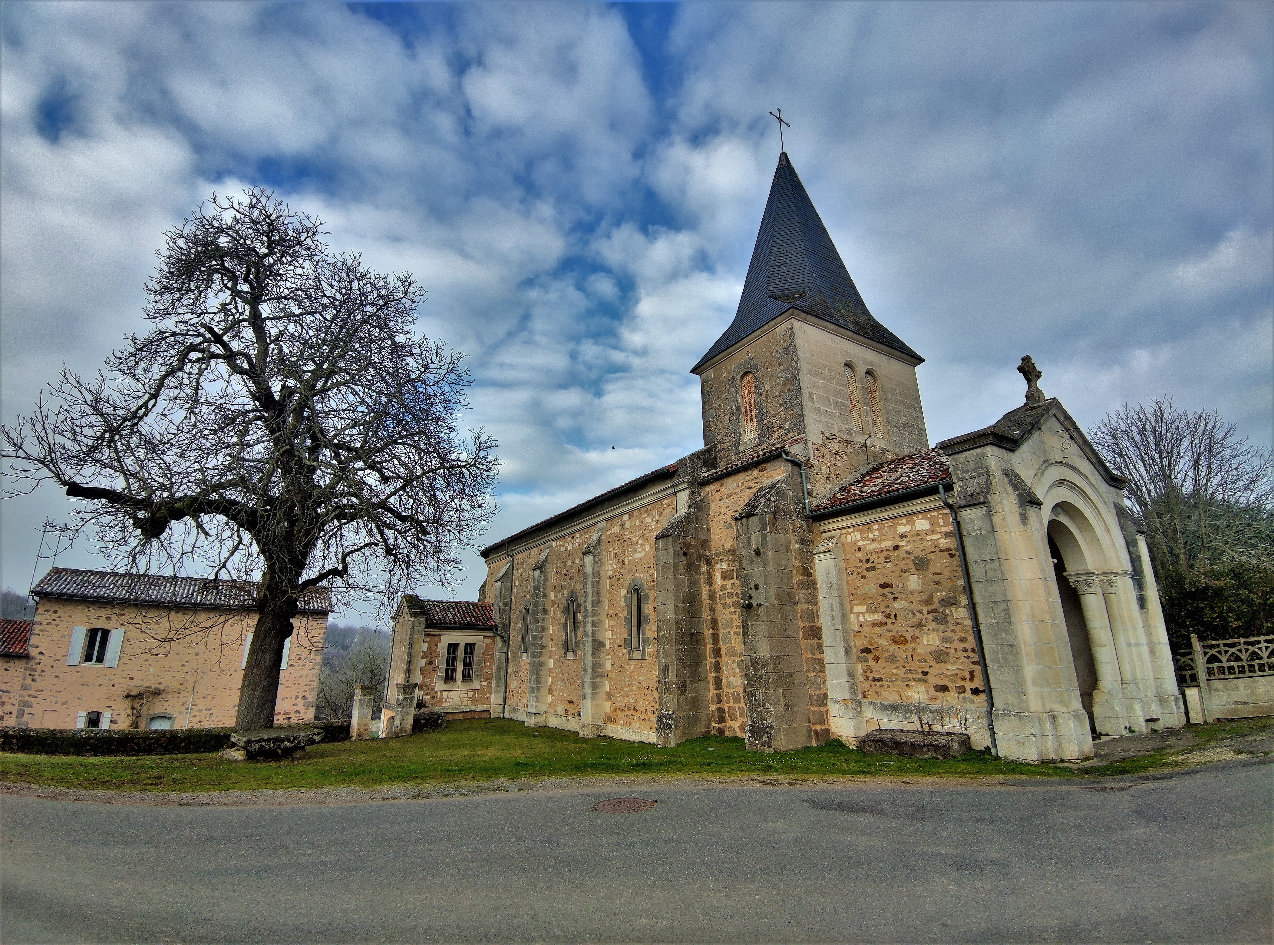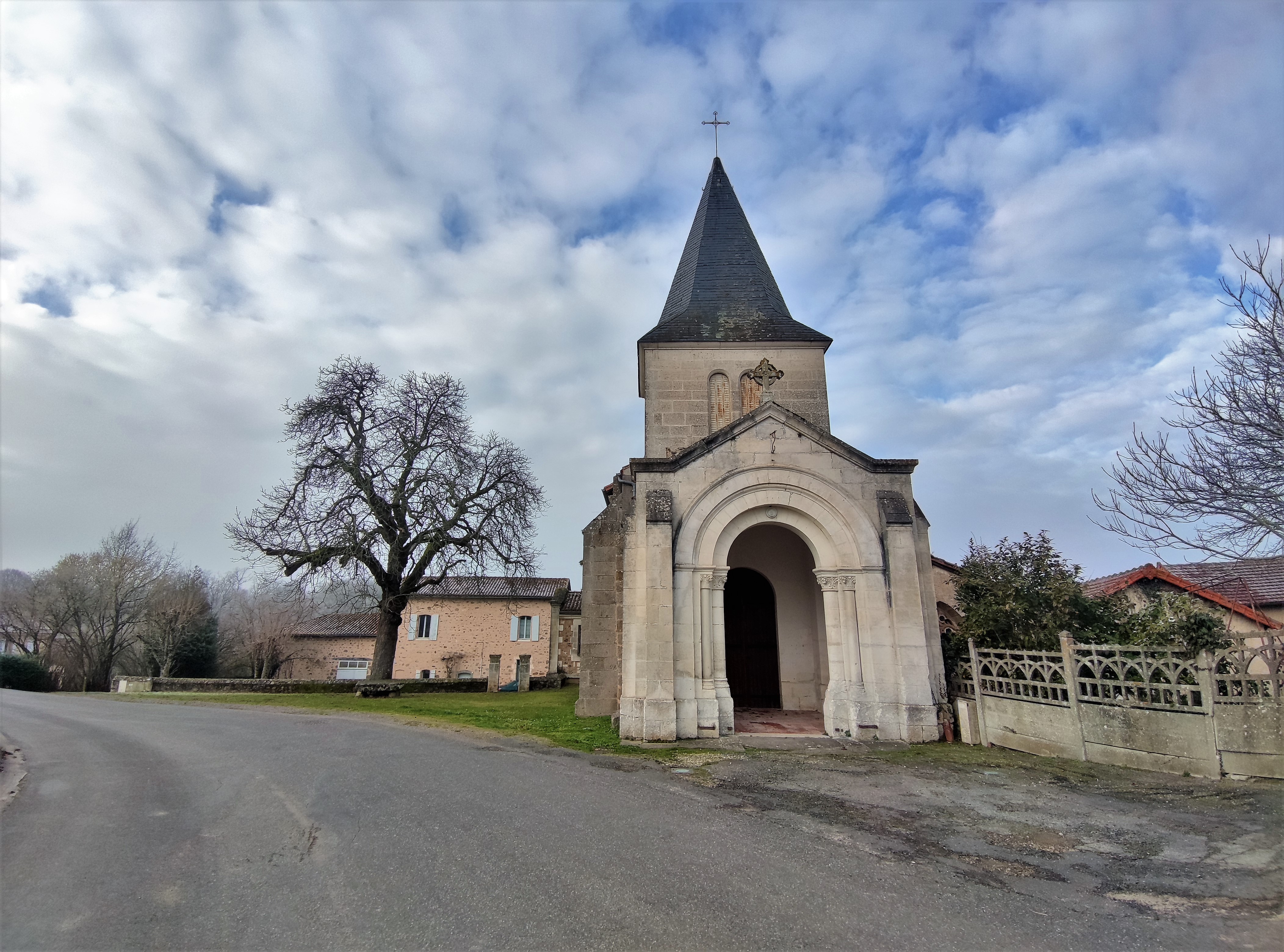 De l'église romane reste la travée sous clocher, qui est le chœur primitif, et la chapelle qui y est accolée. L'église construite au 19ème siècle est désorientée, on entre à l'Est par un porche en pierre qui s'ouvre sur le chœur roman. La chapelle du 15ème est ouverte d'une baie gothique. La nef à vaisseau unique est dotée d'une voûte de briques, en berceau, avec arcs doubleaux, les ouvertures sont en plein cintre. L'abside est ouverte de trois baies en plein cintre et voûtée en croisée d'ogives. L'ensemble des vitraux est de belle facture, l'éclairage est agréable. Il faut prendre les clés à la mairie située tout près. J'ai apprécié cette visite toute simple, le chemin de croix m'a bien plu.