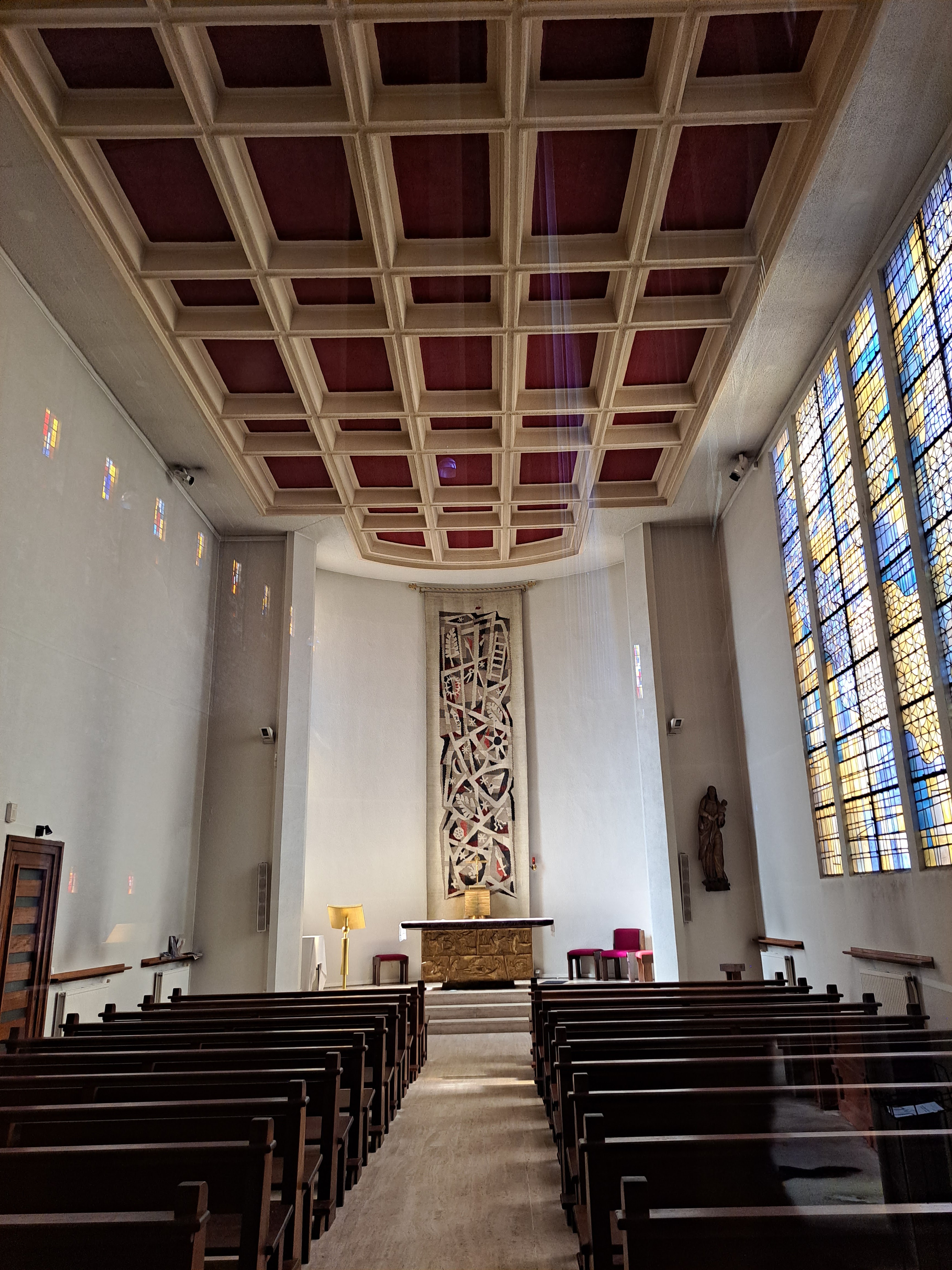 Très belle église reconstruite après la Seconde Guerre mondiale et qui surprend beaucoup par son architecture moderne et minimaliste. Dès l'extérieur, on est frappé par les volumes imposants de l'église en béton. En entrant, on découvre un vaste espace baigné de lumière naturelle, où l'absence de piliers crée un look très aéré. Les vitraux abstraits qui recouvrent les murs latéraux, aux couleurs vives et aux formes géométriques, confèrent à l'église une atmosphère unique. Je recommande cette visite !