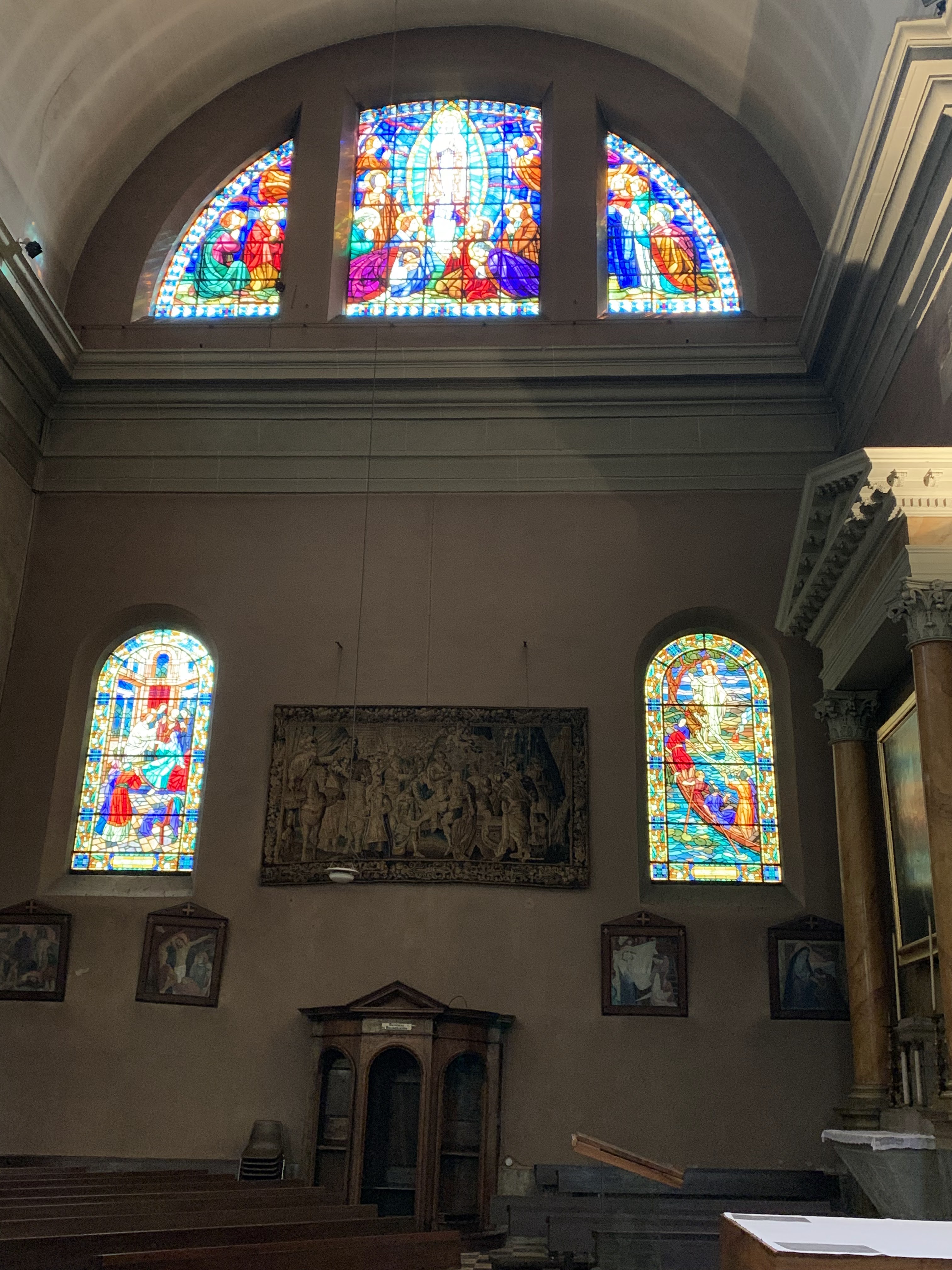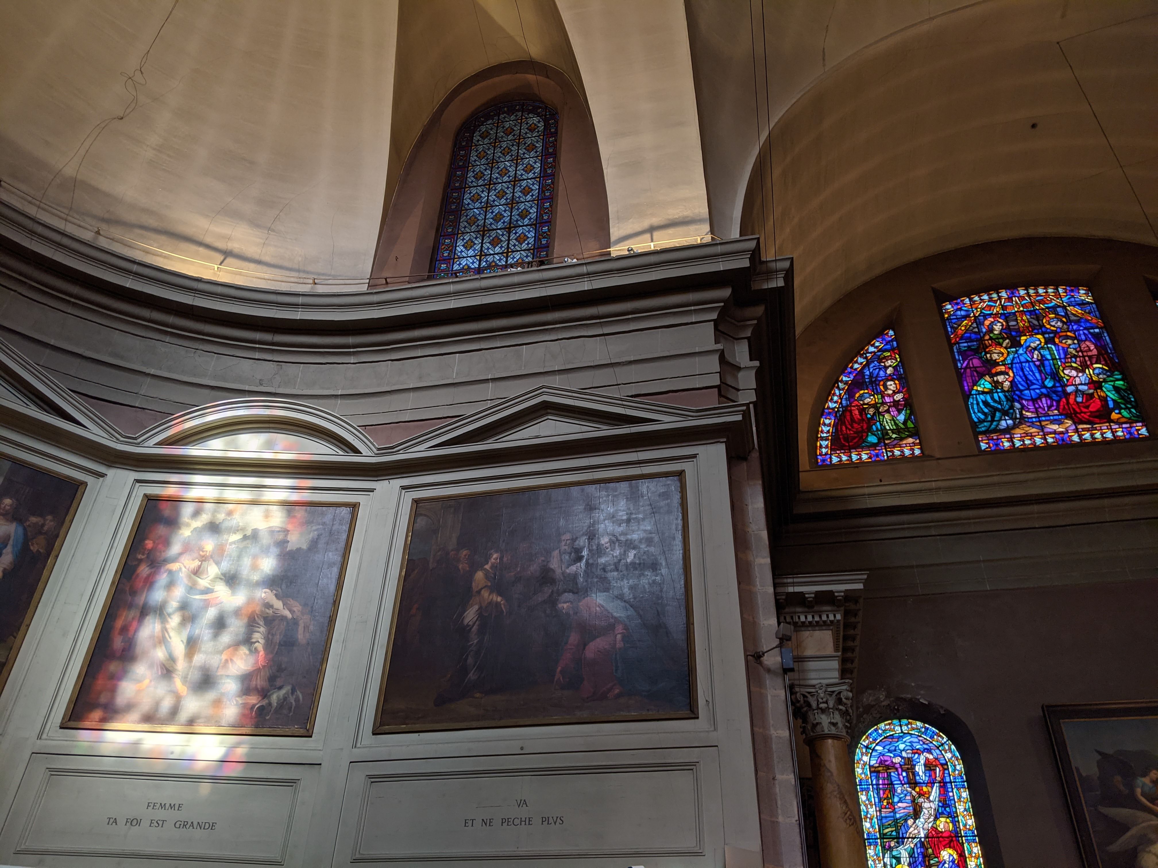 De belles peintures sur les murs. Le verre et le plomb avaient l'air très bien. Vous pourriez raconter une histoire à partir de chaque image. Un beau calme et tranquillité au milieu de la ville.
