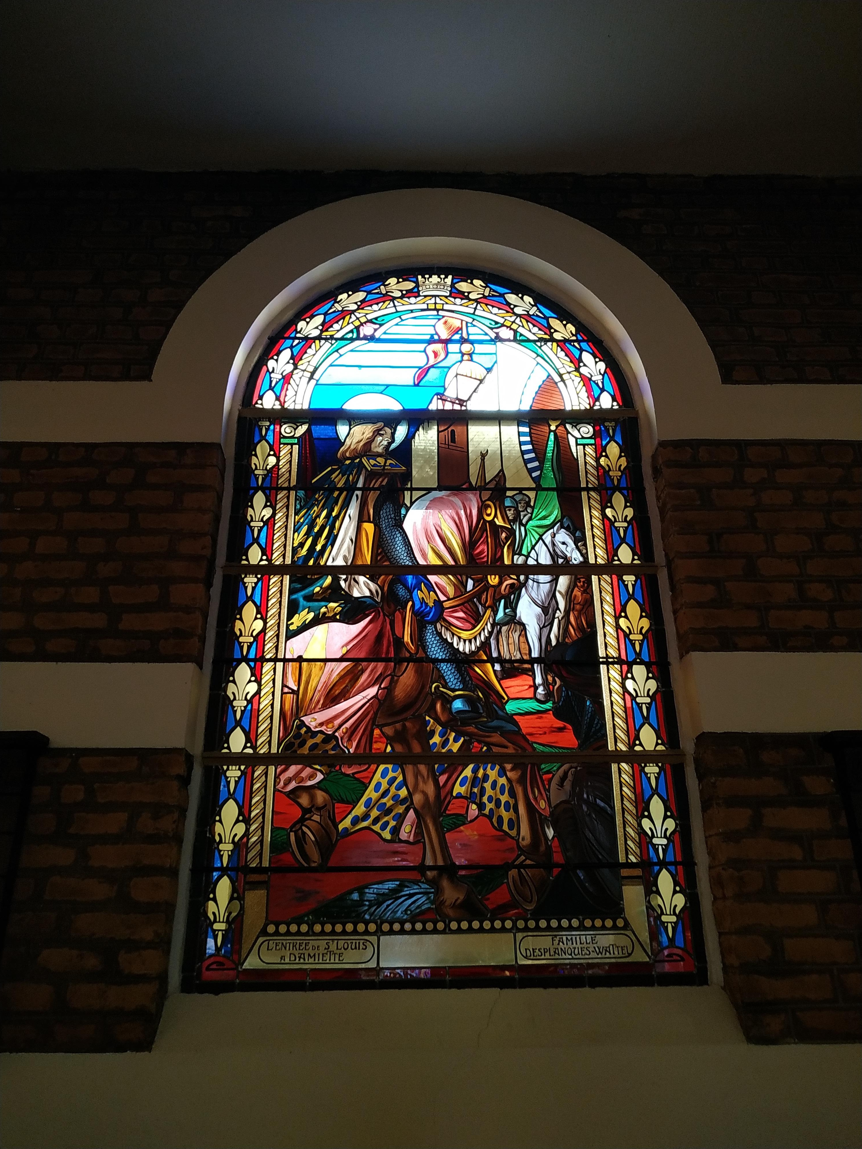 Depuis l'extérieur, cette église ne paie pas de mine, mais il faut en pousser la porte pour admirer ses superbes vitraux relatant la vie de Louis IX, alias Saint Louis. Ils sont colorés, fins, raffinés, un plaisir pour les yeux. J'ai visité l'église pour les Journées du Patrimoine et j'ai eu droit à une explication par un guide fort instruit, mais des QR codes sont présents sous chacun des vitraux, si vous voulez en savoir plus.
