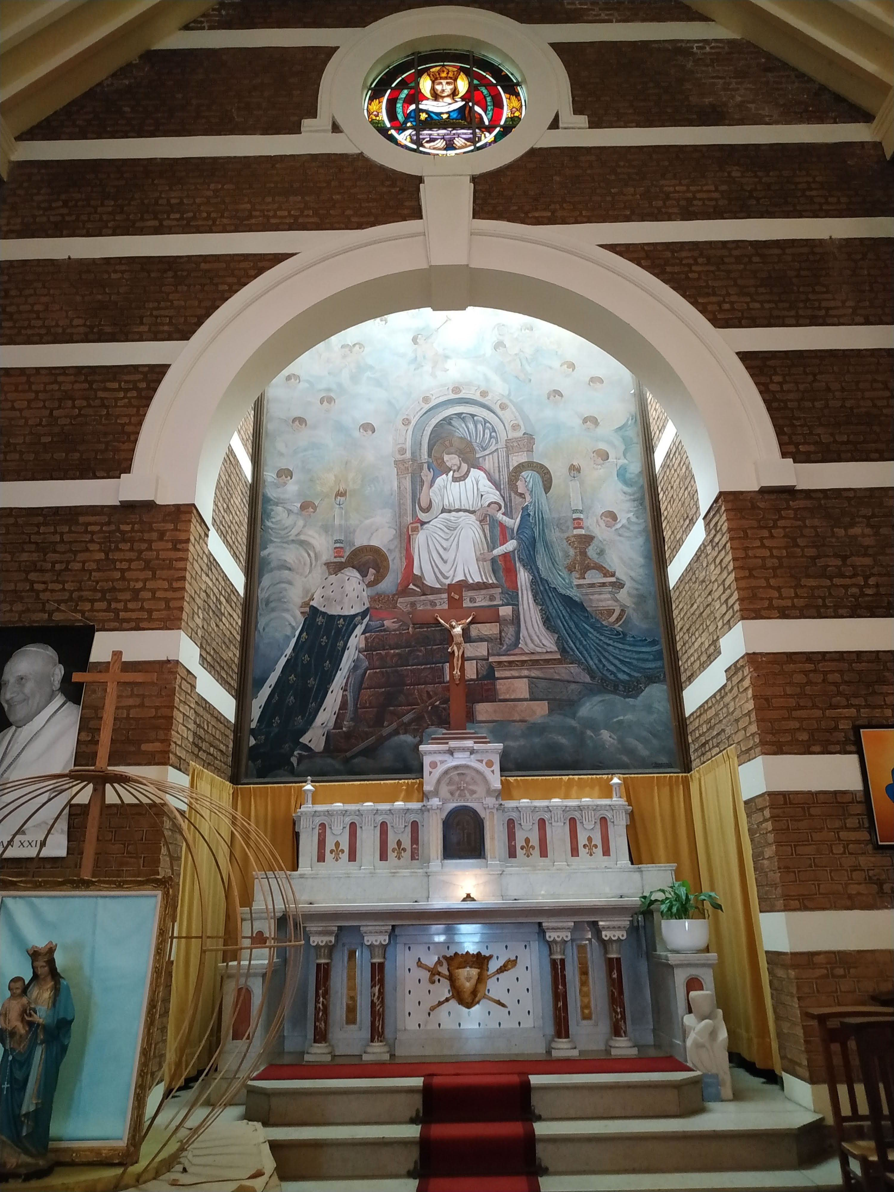 Très belle église, petite paroisse de quartier. Cependant je m'interroge sur la disposition de celle-ci qui n'est pas très conventionnelle, et qui je dois l'avouer n'est pas très pratique lorsqu'il y a du monde, pour recevoir l'eucharistie. Là où dans une église disposée traditionnellement, plusieurs rangées de chaises des deux côtés d'une allée Central tourné vers le coeur, on part de l'arrière, ceux placé à droite prennent l'eucharistie avec la personne de droite et ceux placé à gauche la prenne avec ceux placé à gauche, et on termine par l'avant en repartant sur le côté. Là, c'est compliqué étant donné que l'autel est placé en plein milieu de l'église, avec les chaises placées dans un style d'arc de cercle autour, pour la procession d'entrée, on a parfois l'impression qu'elle n'est pas fini 😅, et pour prendre l'eucharistie on ne sait jamais qui va en premier, ça se bouscule un peu pour repartir à sa place, pas le plus pratique. Donc je m'interroge réellement quant à la disposition de cette église, d'autant plus que j'ai l'impression qu'elle a été construite pour accueillir une disposition traditionnelle, à partir de quand la disposition à changer et qu'est ce qui a motivé ce changement? Mis à part ça, c'est une petite église très belle avec des vitraux magnifiques reprenant la vie de Saint-Louis. C'est à voir.