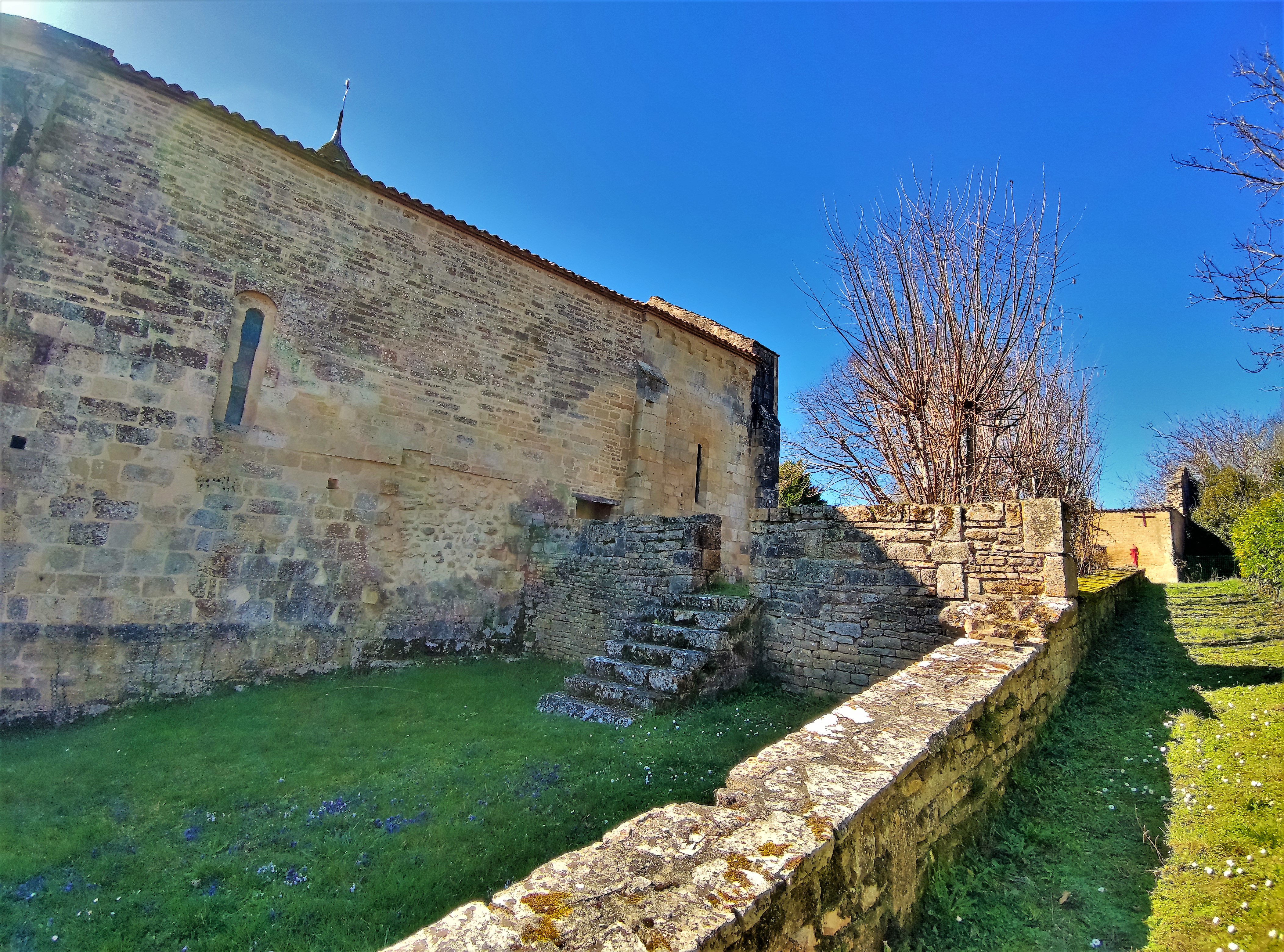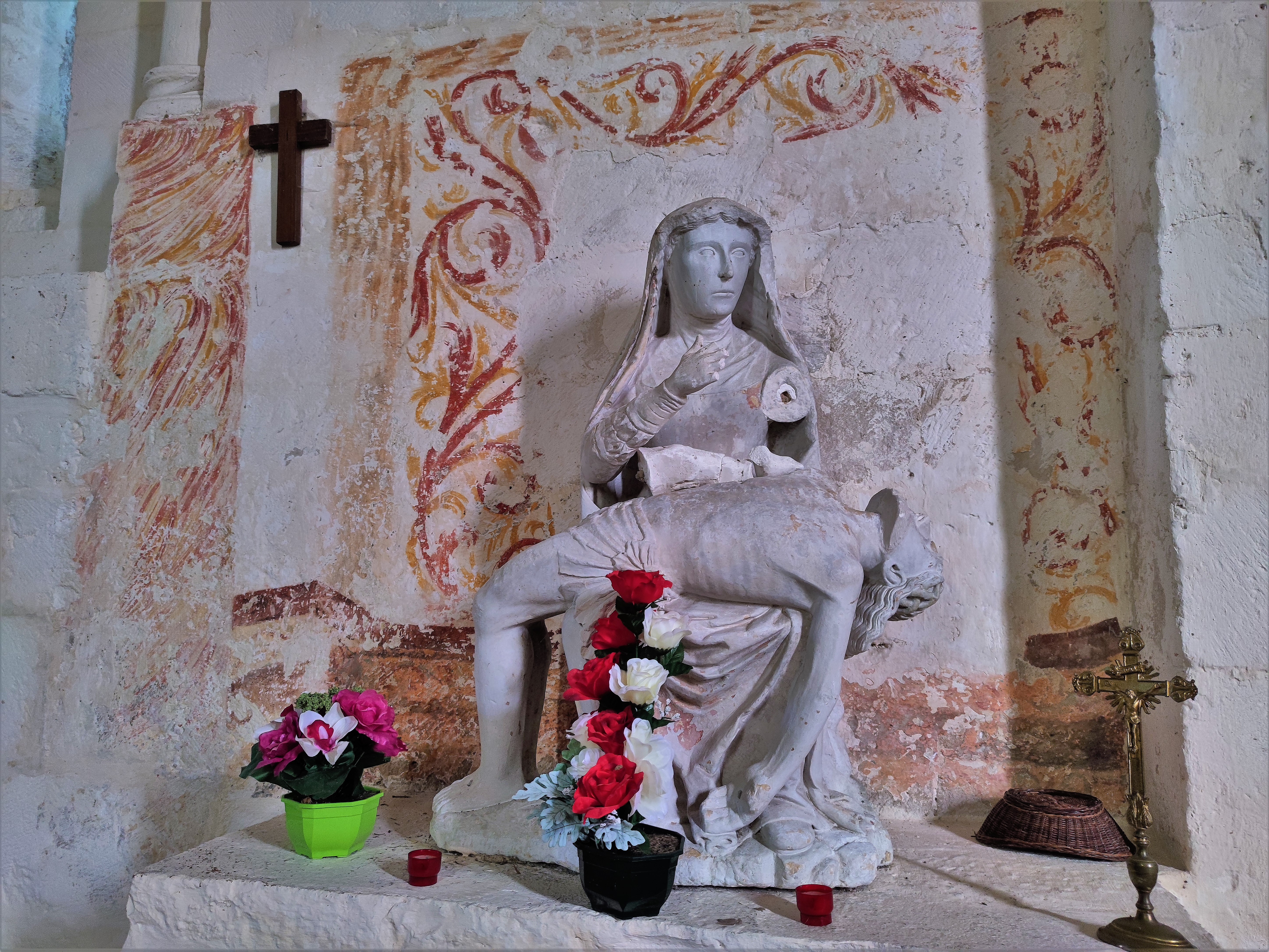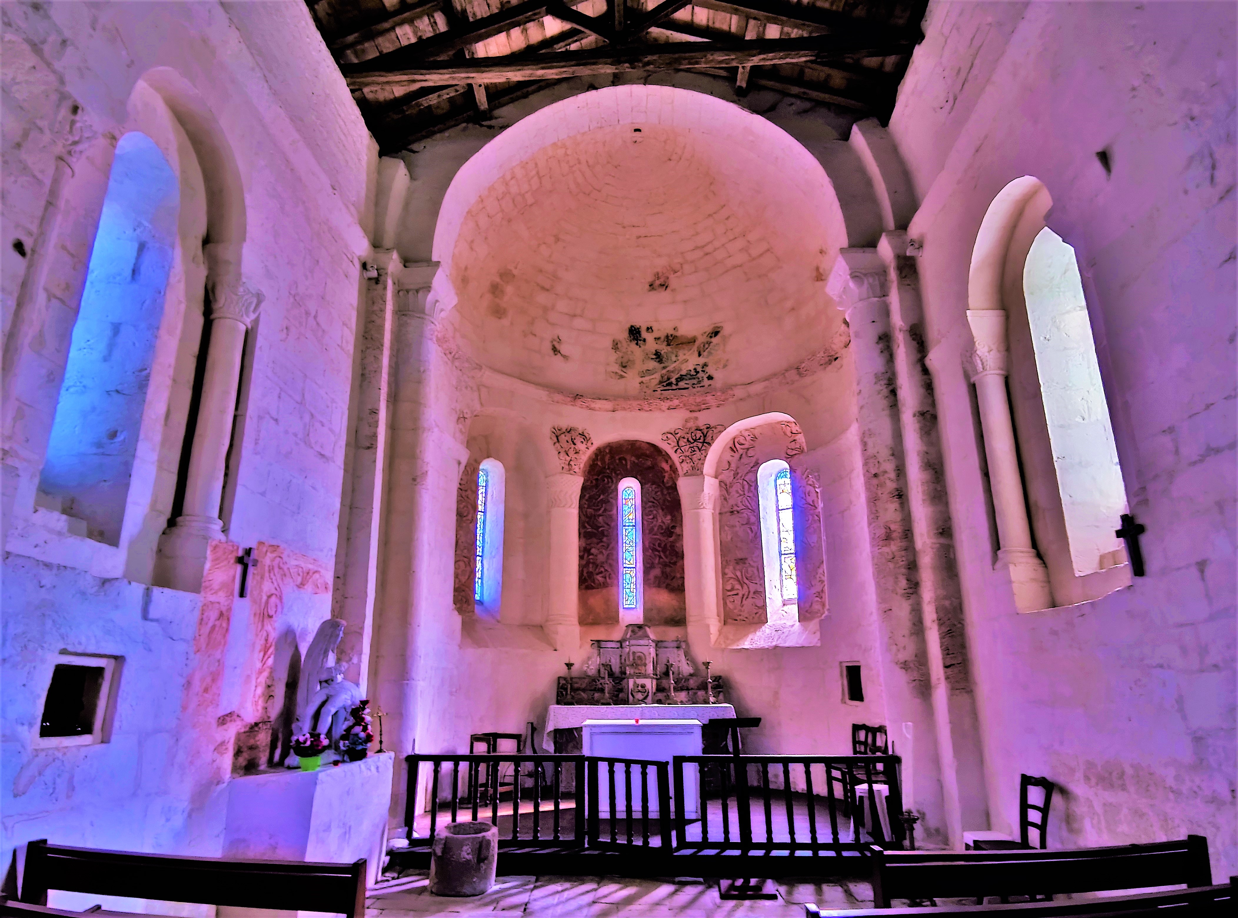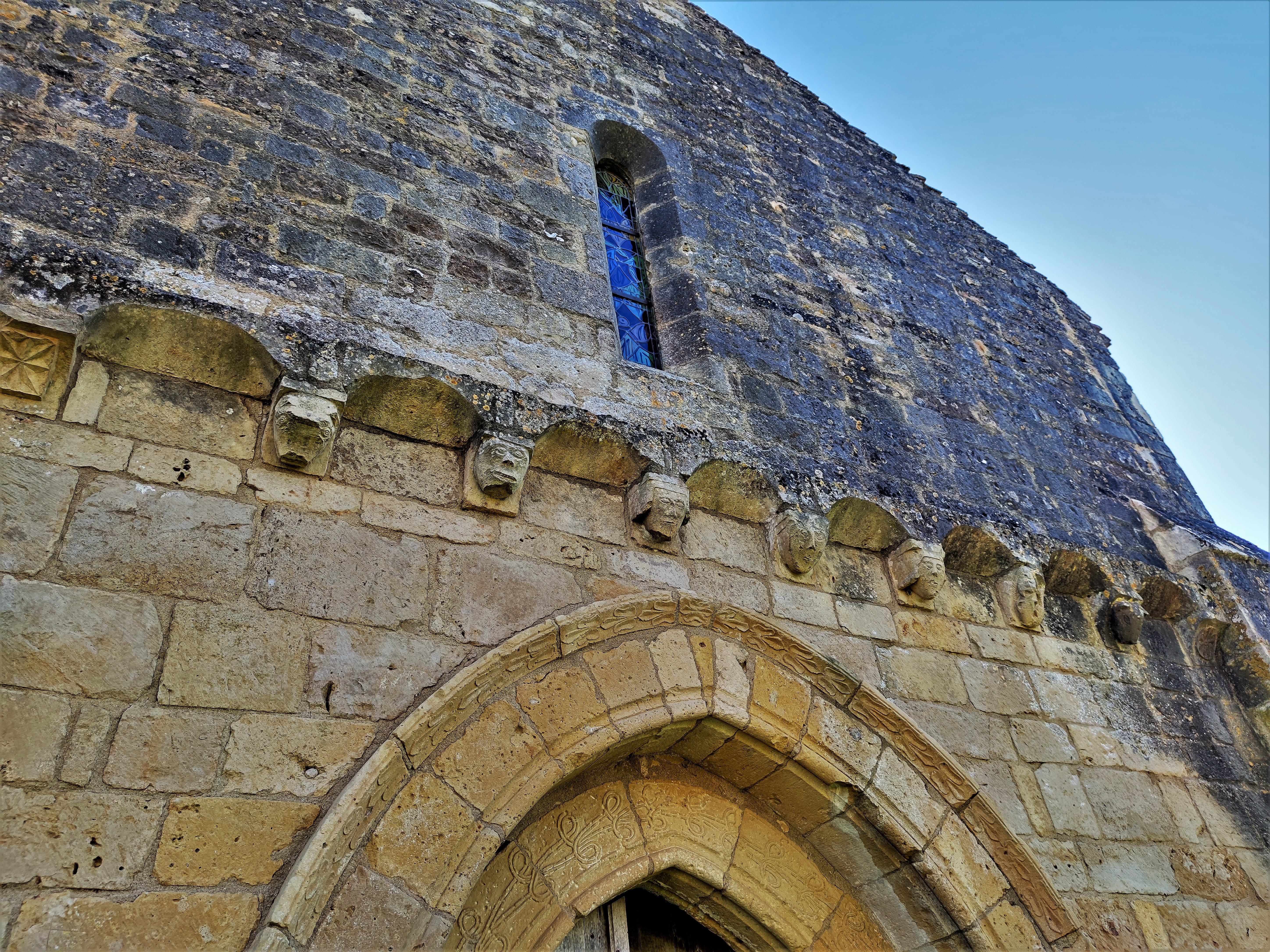 Ouverte et accueillante, cette église du 12ème siècle, typique des édifices romans ruraux de la Charente, est classée depuis 1914 par les Monuments Historiques. Sa façade à modillons, son portail en arc brisé et voussures décorées, sa nef simple et son abside couverte de lauzes calcaire sont caractéristiques. En regardant les décors sculptés, on peut penser que la fée Mélusine est représentée deux fois. En modillon sur la façade et sur le chapiteau d’une colonnette encadrant une baie dans le chœur. Dans ce bourg qui compte moins de 100 âmes aujourd'hui, (300 en 1800), la découverte de cette église est une belle surprise. Des décors peints du 15ème agrémentent le sanctuaire voûté en demi-coupole, et encadrent la Piéta posée sur l'autel de la travée du chœur. Dans la nef à charpente apparente, sont visibles les départs courbés de la voûte primitive, les piliers de l'arc triomphal et les colonnes engagées.