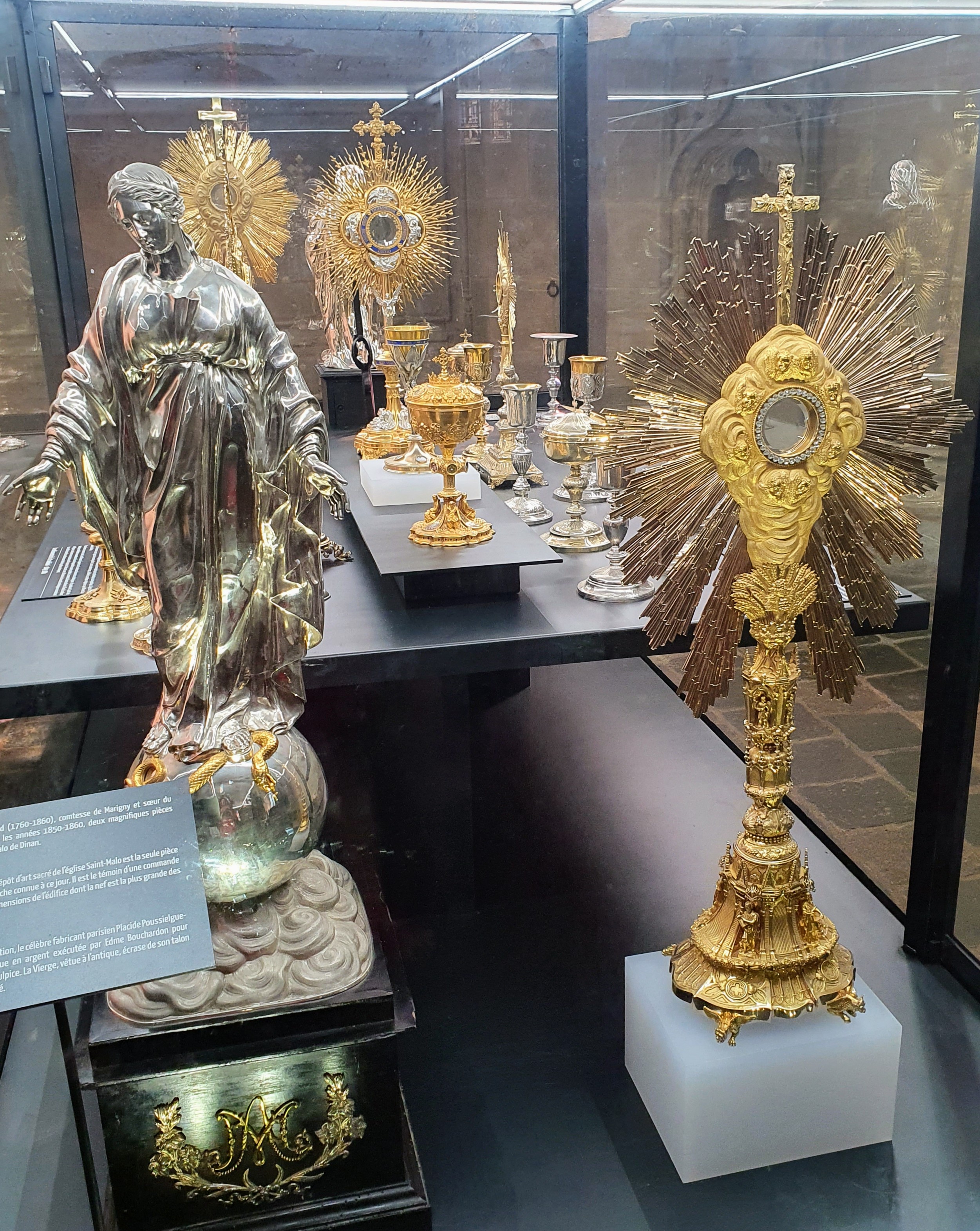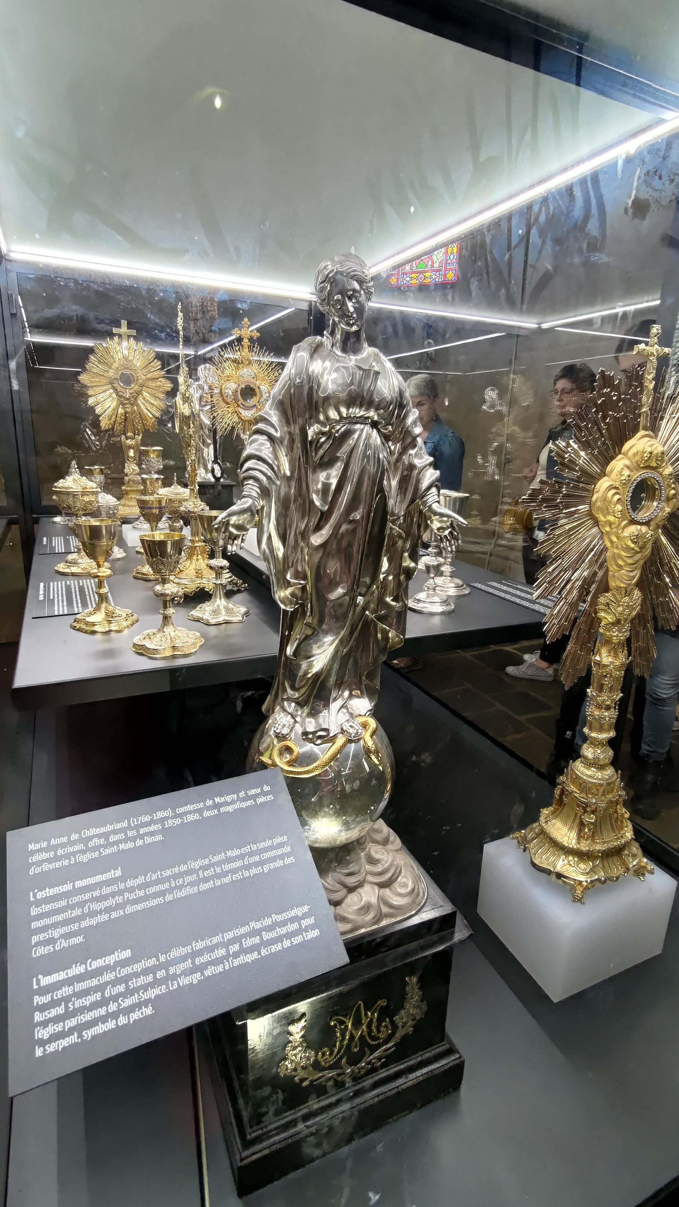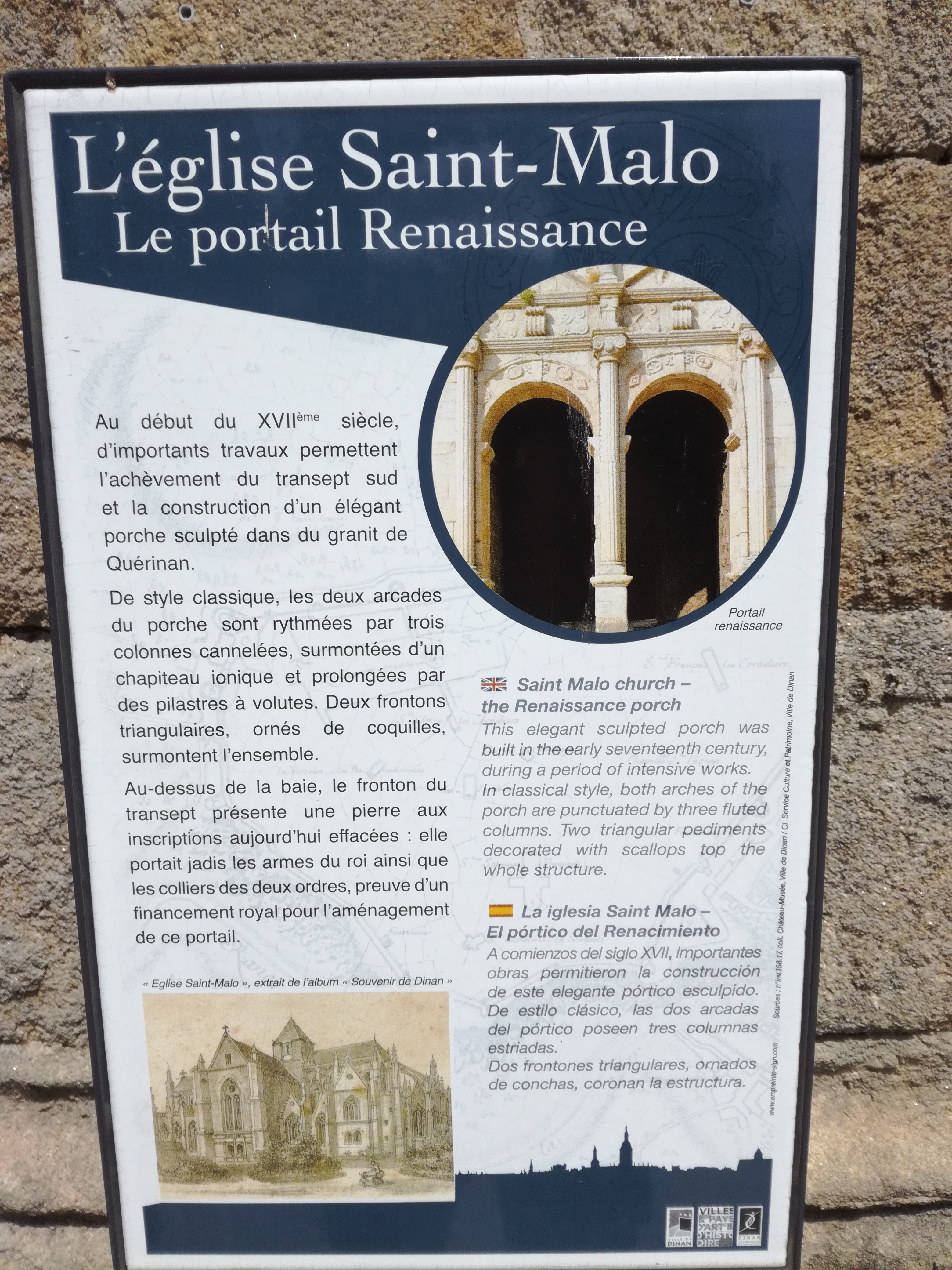 Église catholique du 15ème siècle. Très jolie vitraux. Exposition objets religieux : Marie Anne de Châteaubriand (1760-1860), comtesse de Marigny et sœur du célèbre écrivain, offre, dans les années 1850-1860, deux magnifiques pièces d'orfevrerie à l'église Saint-Malo de Dinan. L'ostensoir monumental lostensoir conservé dans le dépôt d'art sacré de l'église Saint-Malo est la seule pièce monumentale d'Hippolyte Puche connue à ce jour. Il est le témoin d'une commande prestigieuse adaptée aux dimensions de l'édifice dont la nef est la plus grande des Côtes d'Armor. L'Immaculée Conception Pour cette Immaculée Conception, le célèbre fabricant parisien Placide Poussielgue Rusand s'inspire d'une statue en argent exécutée par Edme Bouchardon pour l'église parisienne de Saint-Sulpice. La Vierge, vêtue à l'antique, écrase de son talon le serpent, symbole du péché.
