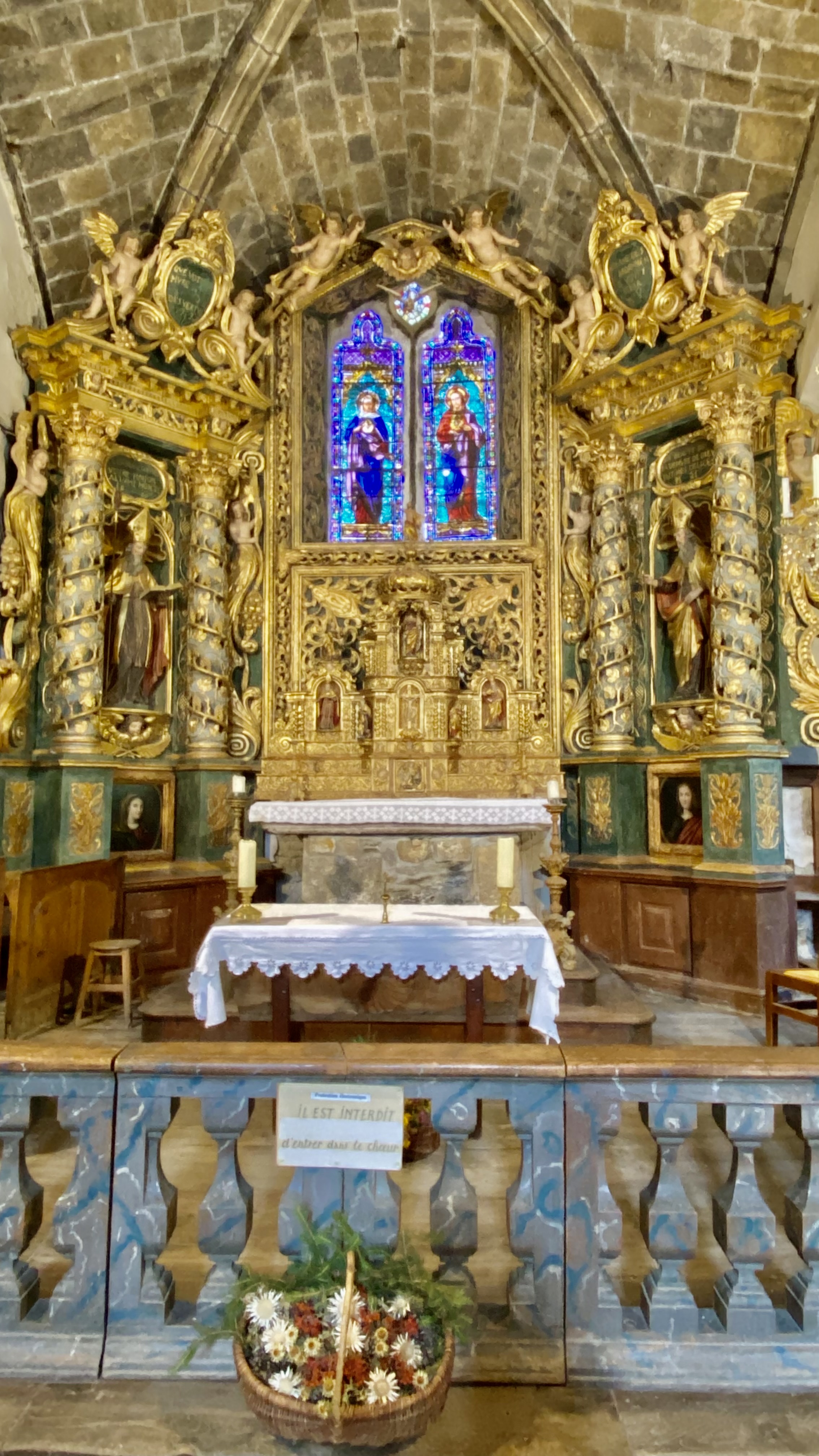 Jolie église de village avec un retable en bois doré un baptistère conique fermé un escalier étroit conduisant ... et sa porte de cachot ancienne.
