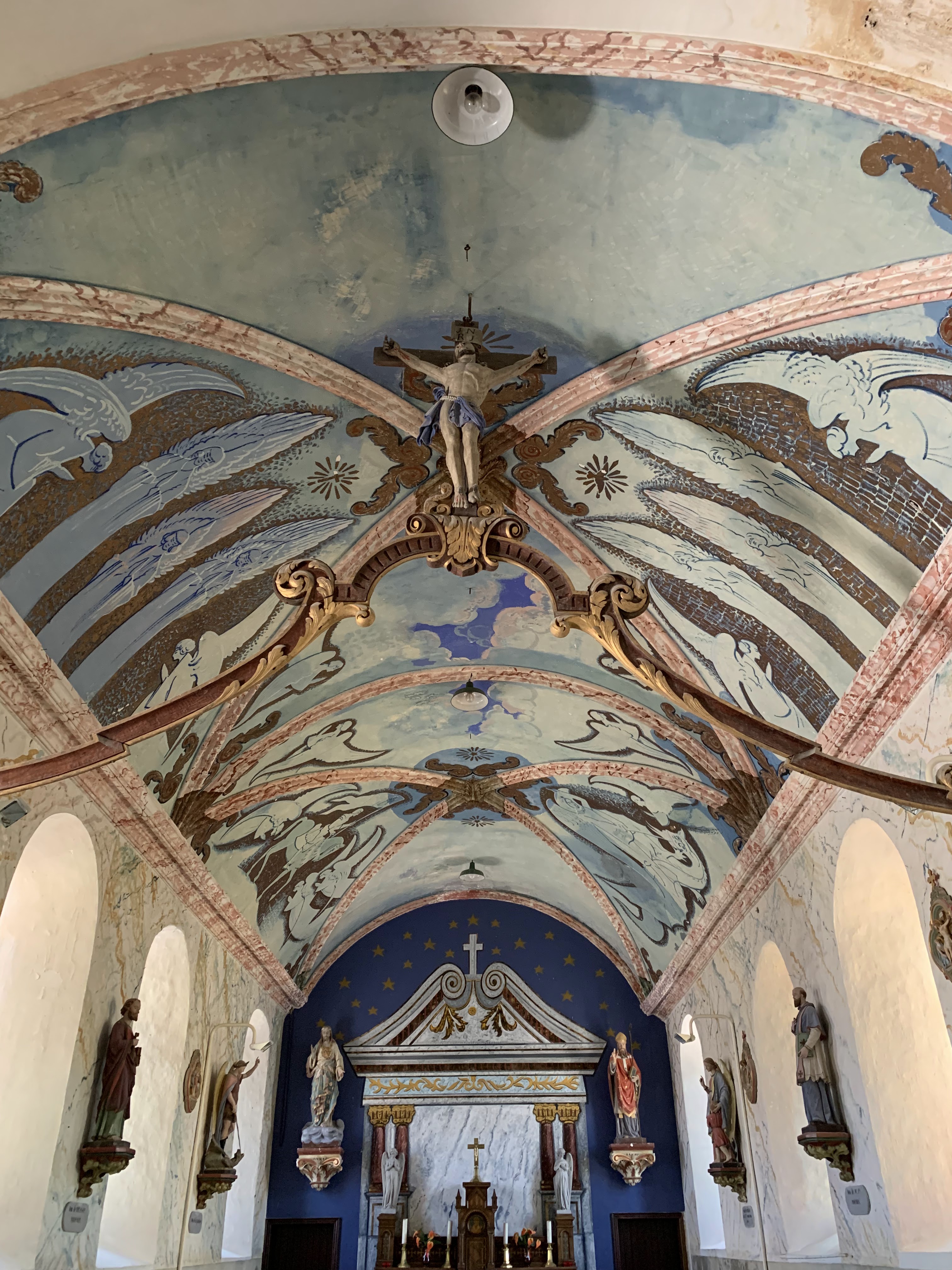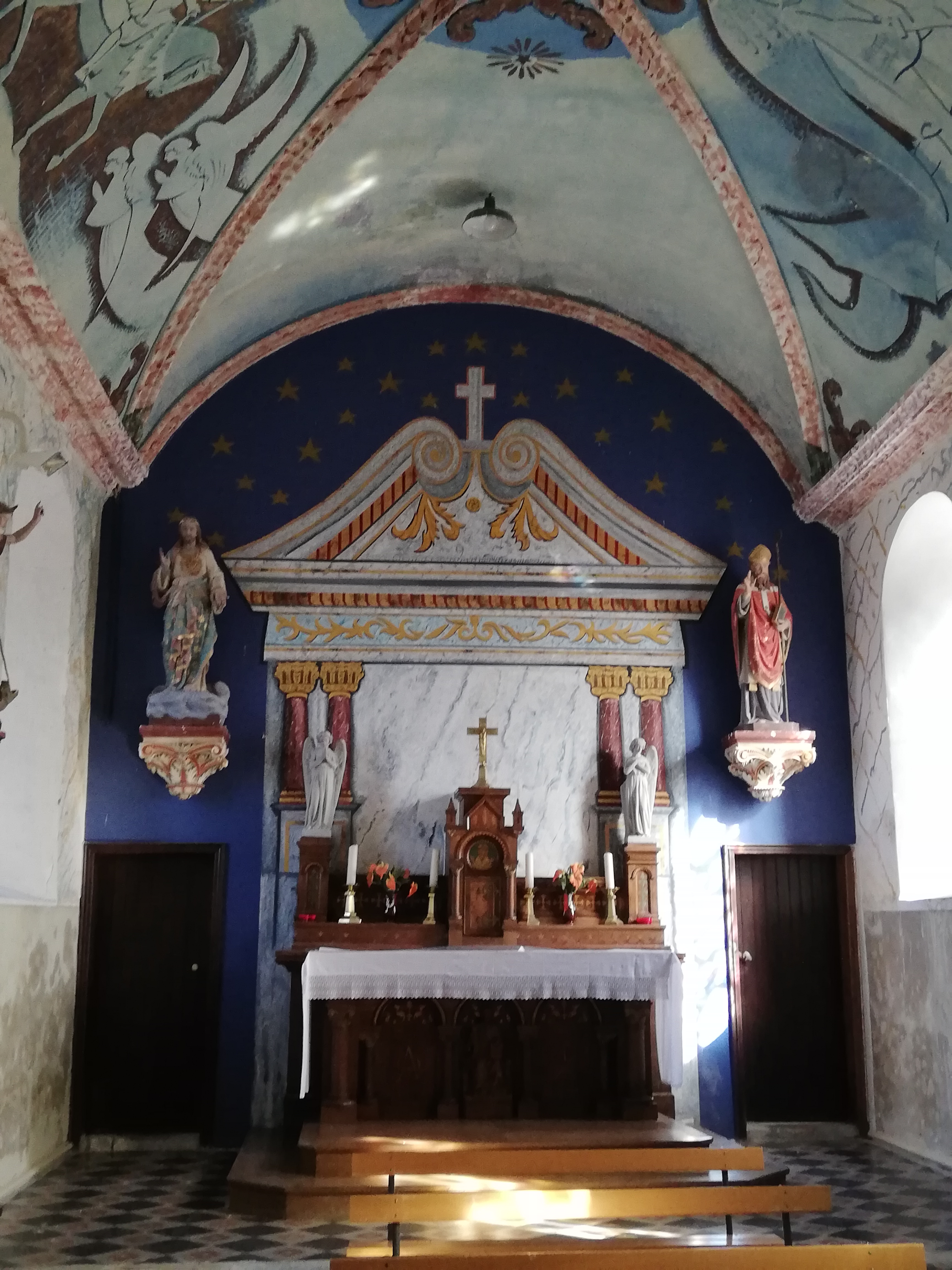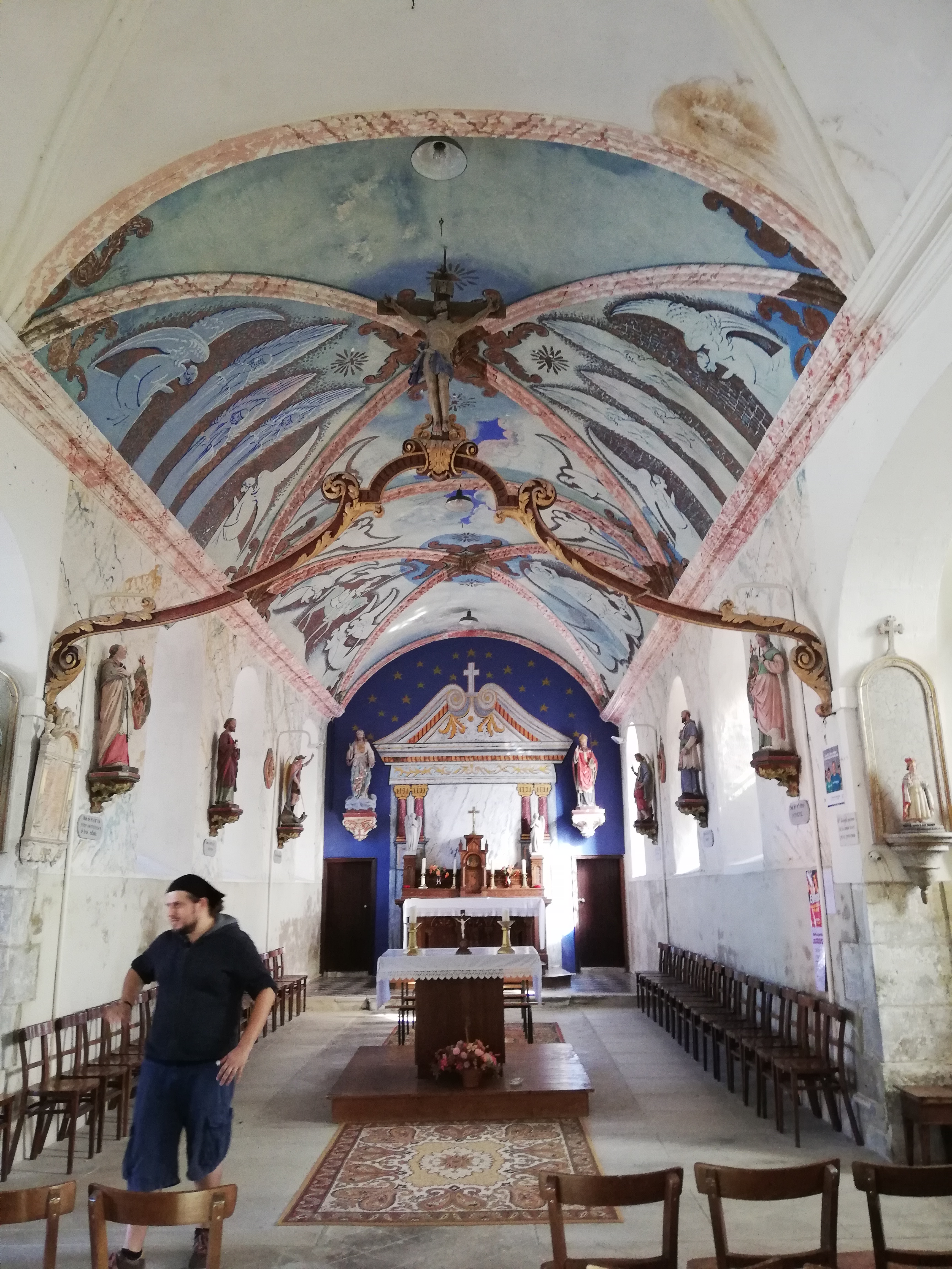 Incroyable…!!! Des fresques et des peintures le l’artiste peintre orientaliste et résistant français Marcel Gaillard ornent la voûte du chœur qui ont font un trésor unique en son genre dans toute la région. Peintes en 1943 avec l’aide du curé du village au nez et à la barbe de l’armée allemande. À découvrir absolument et vaut un curieux détour. Magnifique…!!!
