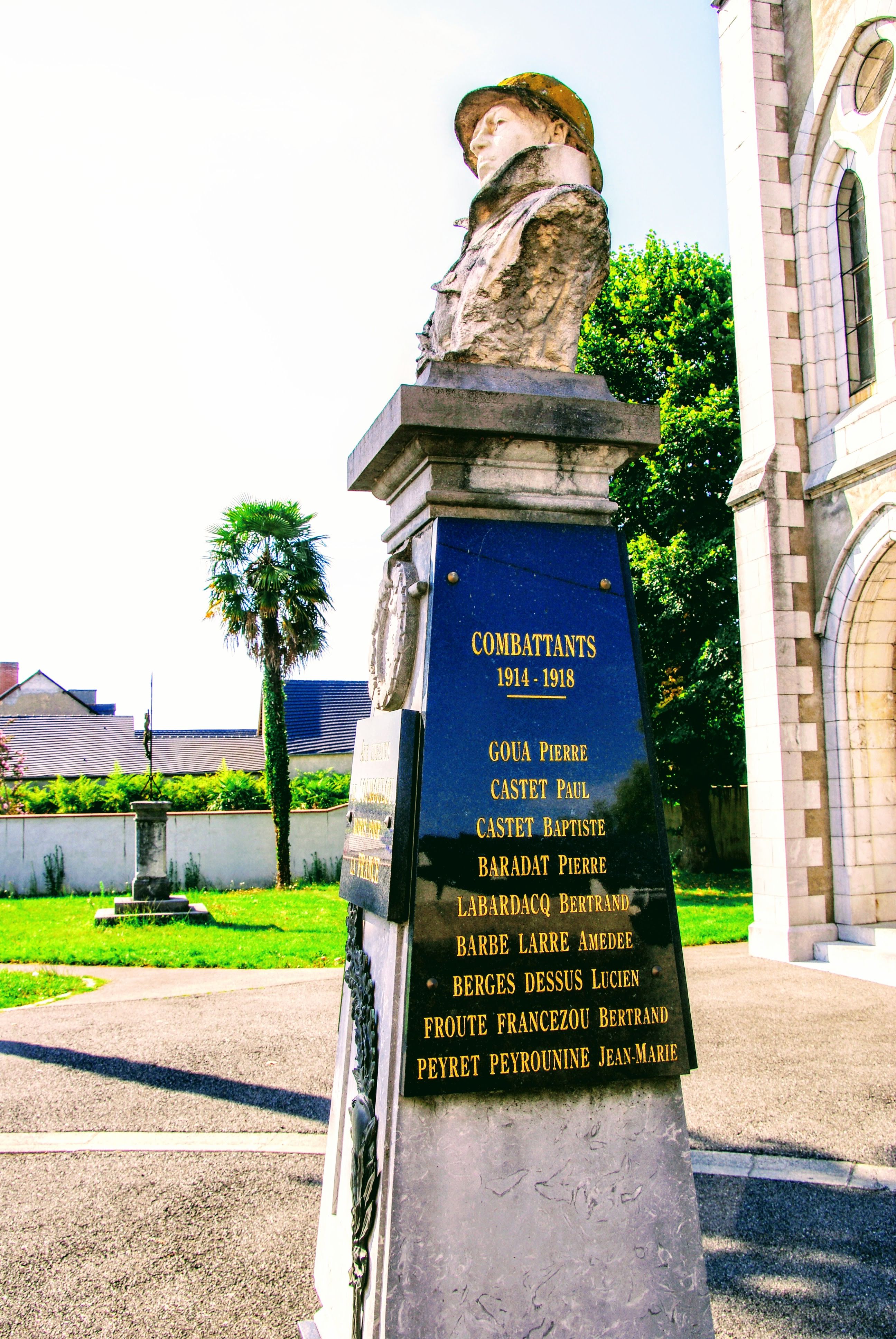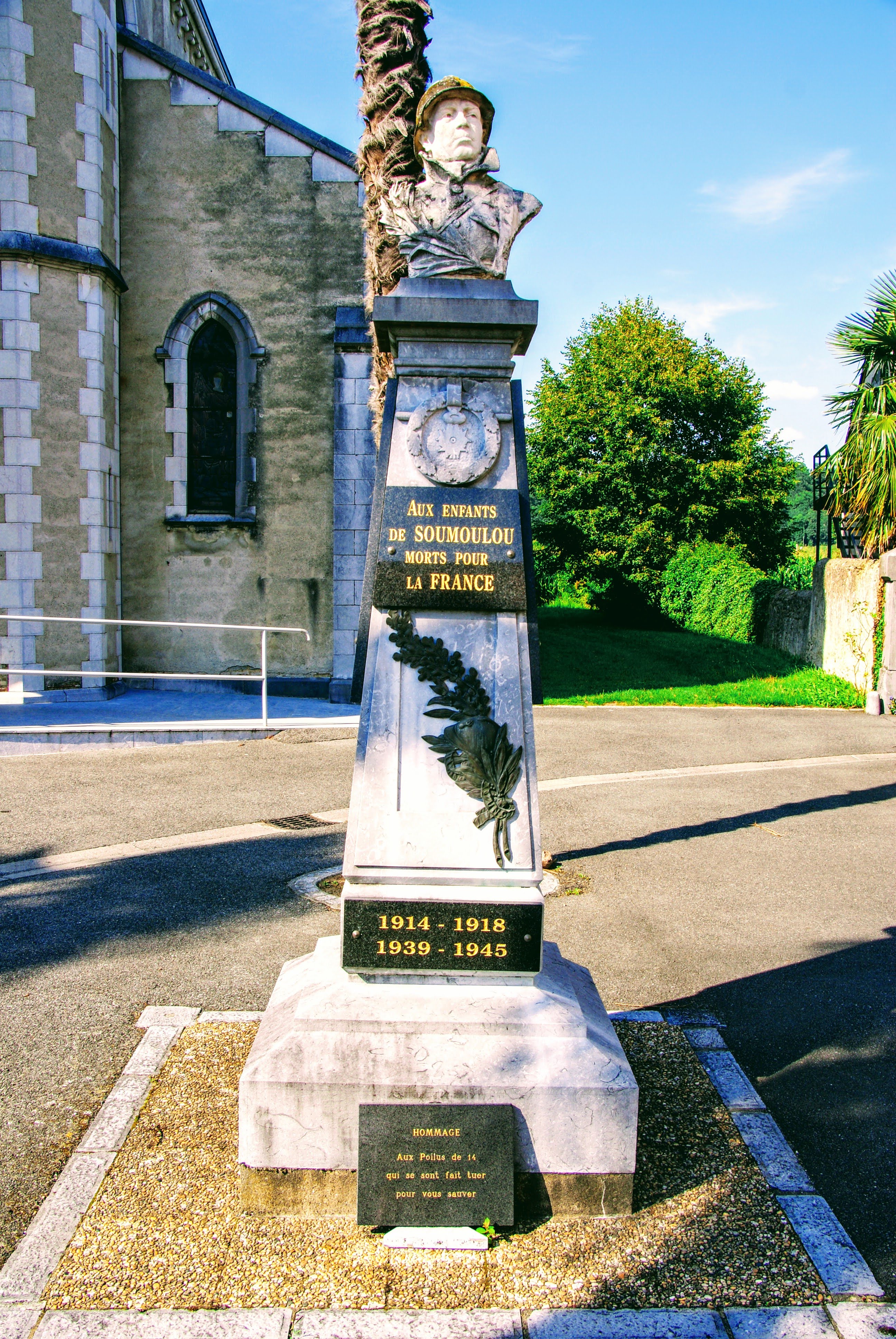 Belle église de Soumoulou, éclairée de nombreuses couleurs par ses intéressants vitraux, à l'extérieur se trouve un monument aux morts de la ville pendant la Première et la Seconde Guerre mondiale.
