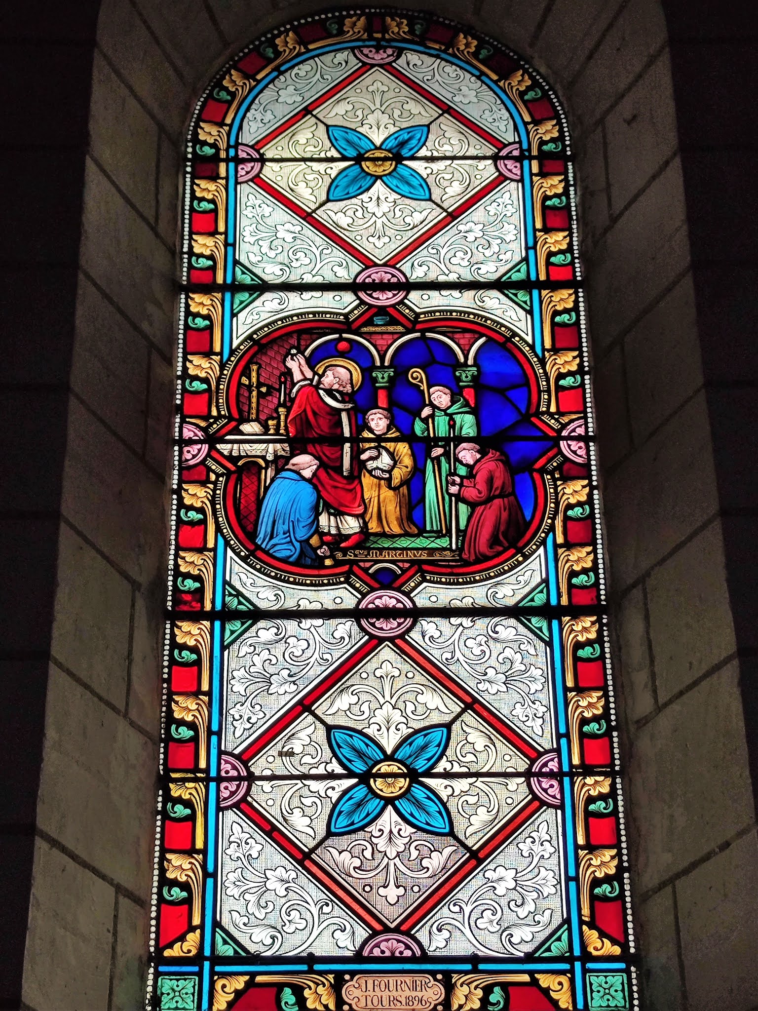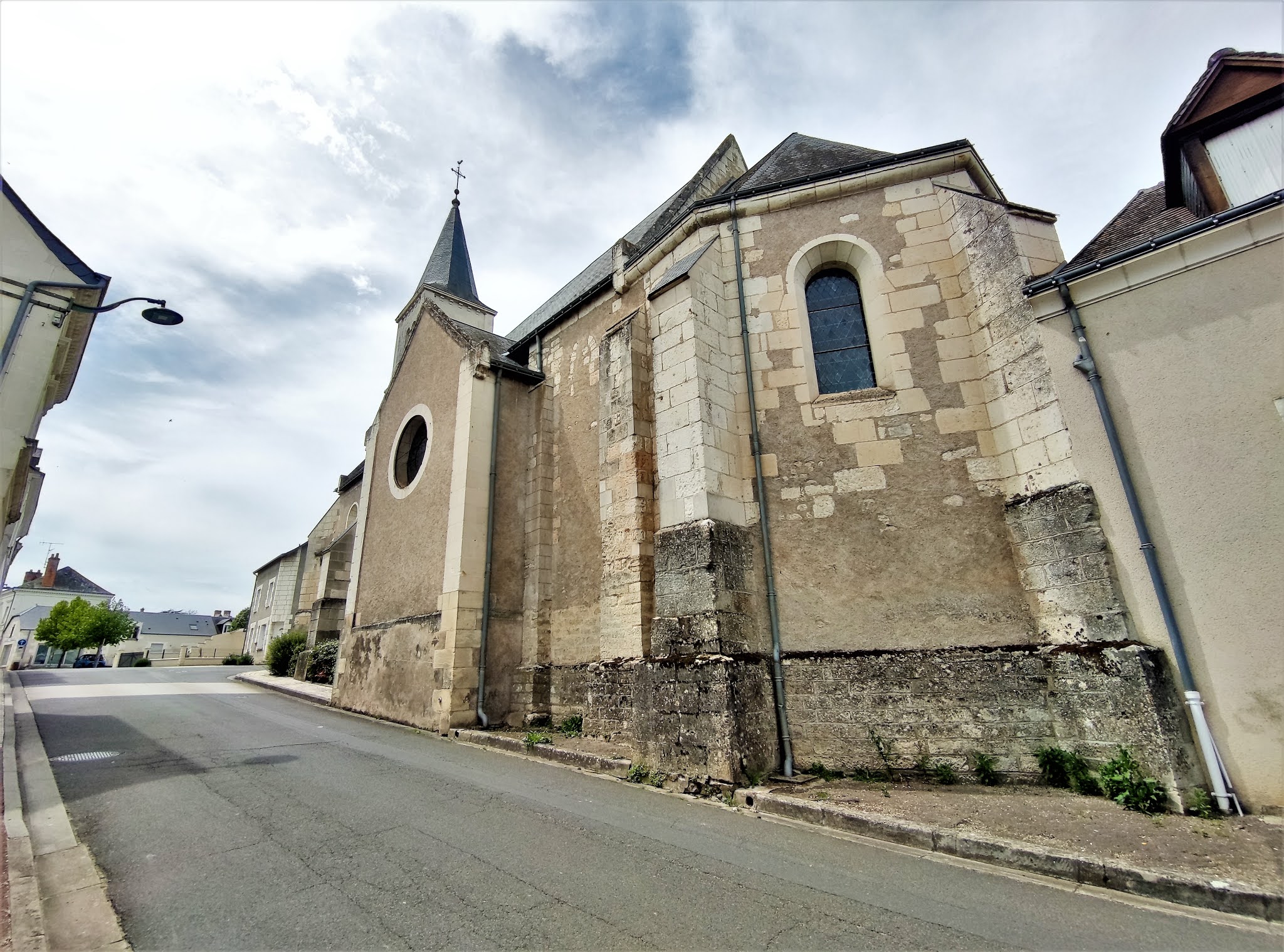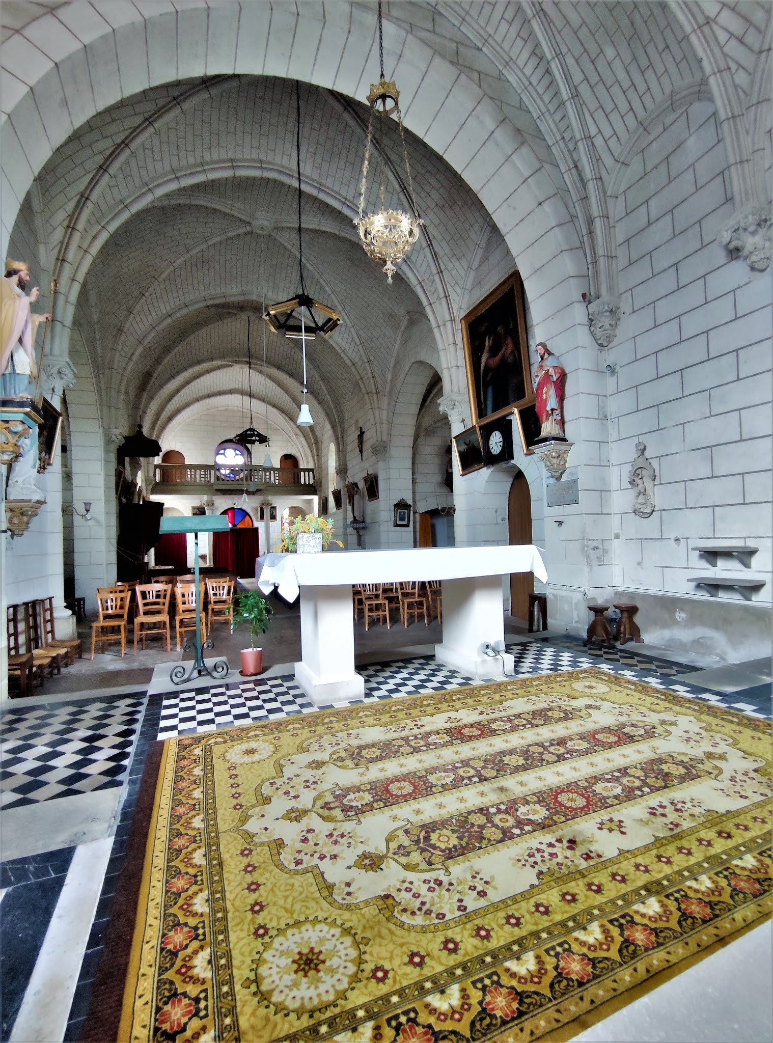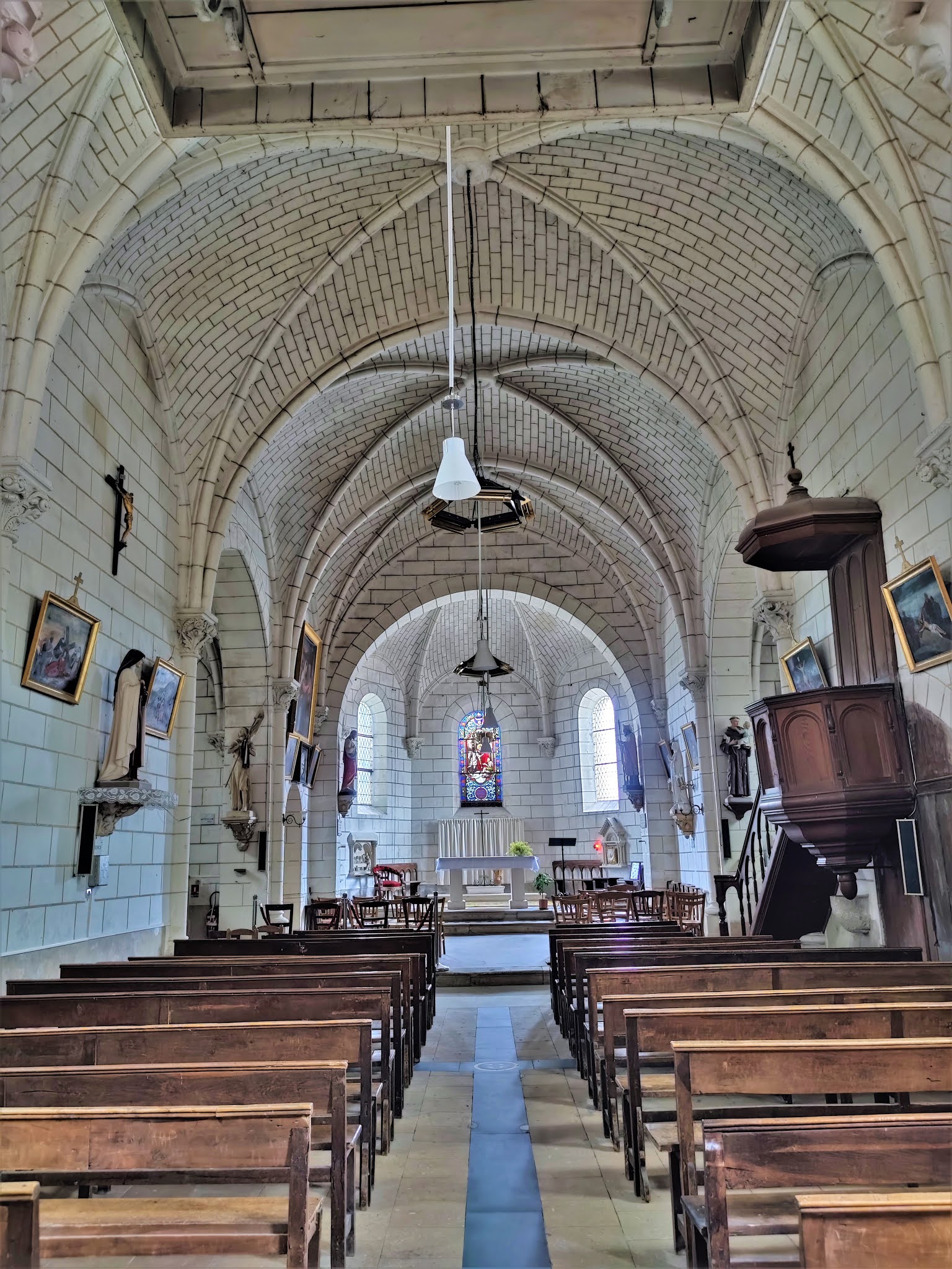 Ouverte et accueillante, en bon état, elle possède de beaux vitraux. L'église Saint-Martin fut construite au 11ème siècle, la porte du mur Sud est un vestige de l'édifice primitif. D'autres réutilisations de ce dernier seraient présentes dans les murs. L'abside à trois pans fut ajoutée au 12ème siècle. Sans-doute vers le 15ème siècle, on adjoint deux chapelles à l'édifice, offrant à ce dernier un plan en croix. Peu profondes, chacune est ouverte d'un oculus. Puis au 19ème siècle, de profondes restaurations ou/et rénovations vont entrainer des changements. Une voûte en briques, entre-autres, d'un heureux effet, donne un peu de superbe. C'est une église peu originale mais en bon état, dotée de beaux vitraux. Fort bien mise en valeur au cœur du village, c'est une église ouverte et accueillante dont j'ai apprécié la visite. En France, on dénombre 3700 églises et 14 cathédrales ayant pour Patron Saint-Martin de Tours, 220 communes portent son nom. A travers le monde, on dénombre des milliers de lieux nommés Saint-Martin, en référence à ce Saint du 4ème siècle, symbole du partage.