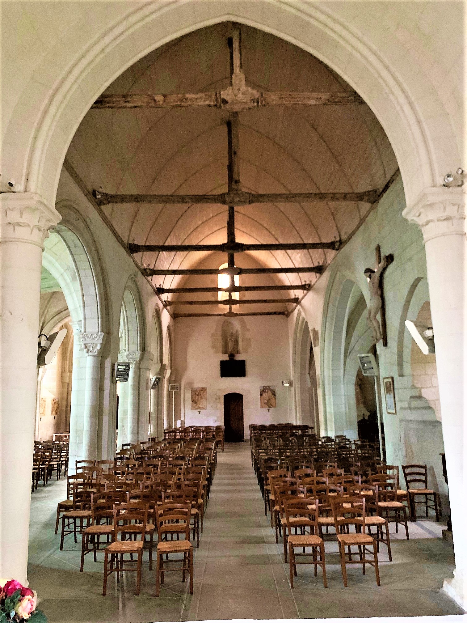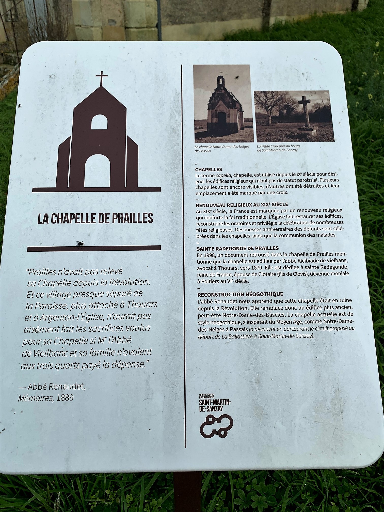 Un village de 1008 habitants en 2016, ses commerces et son église, Monument Historique. Après avoir déjeuné au restaurant, j'ai visité cette église du 12ème, agrandie et modifiée au cours des siècles, classée par les M.H. en 1910. La nef primitive était à vaisseau unique, l'adjonction de deux travées au sud, sans doute au 13ème, puis de deux autres au nord, au 15ème, lui donne l'aspect d'une nef à trois vaisseaux. Le chœur et le chevet arrondi en abside datent du 12ème siècle. Chaque adjonction est marquée par le style architectural de l'époque de sa construction, on retrouve donc les styles roman, gothique, gothique flamboyant, et donc des voûtes en demi-coupole, en berceau ou à croisés d'ogives. L'ensemble est malgré-tout harmonieux et mérite une visite. La chapelle Sainte Radegonde de Prailles, située à quelques kms, a été reprise par l'église orthodoxe qui y célèbre des messes.Son histoire est lié à la Commanderie de Prailles et à la cité de Saint-Martin-De-Sanzay. Quel bonheur de trouver un village comme Saint-Martin-De-Sanzay, vivant et accueillant, riche de trois commerces sur la place centrale et son église. Cela devient rare dans les campagnes françaises.