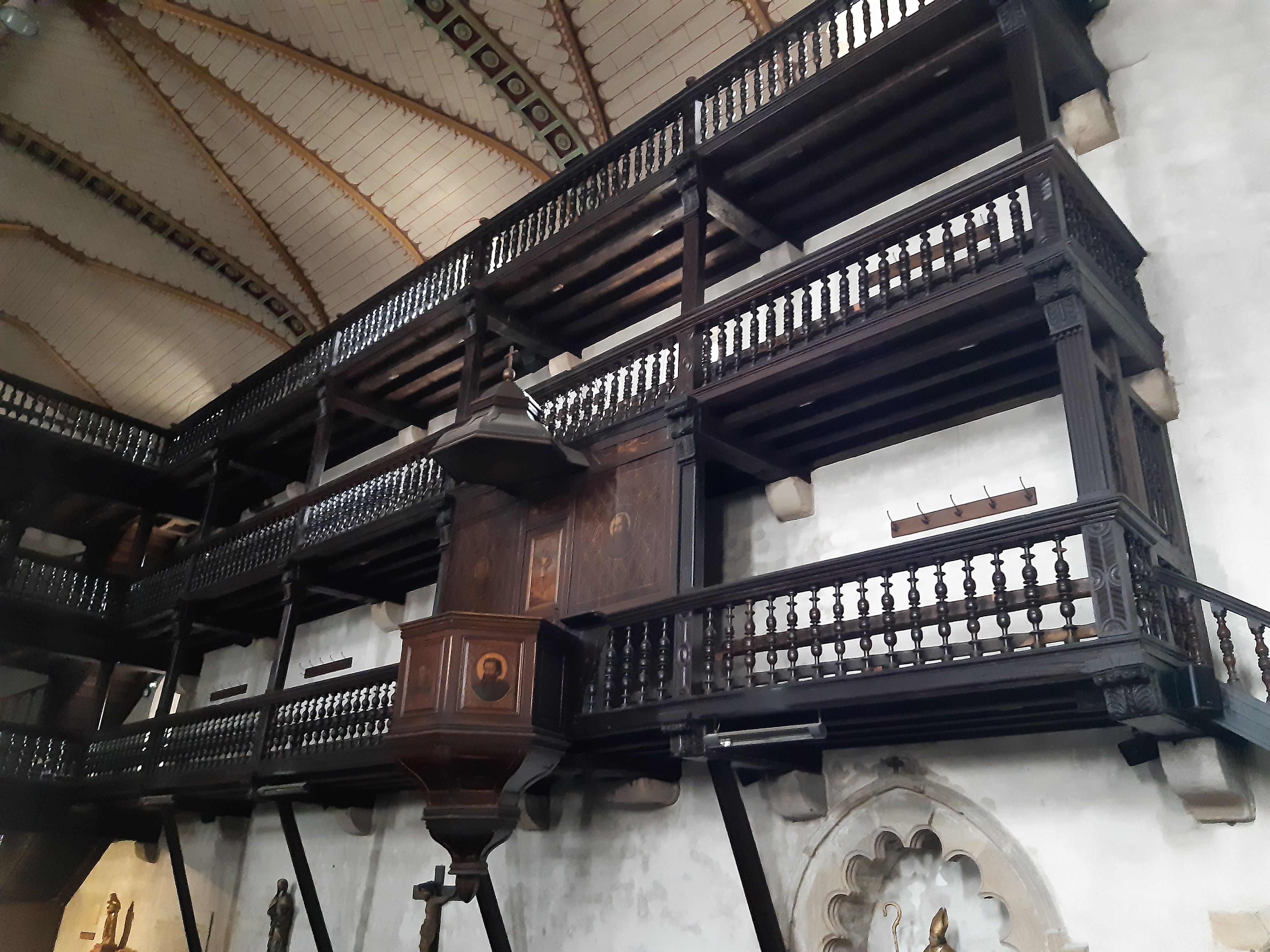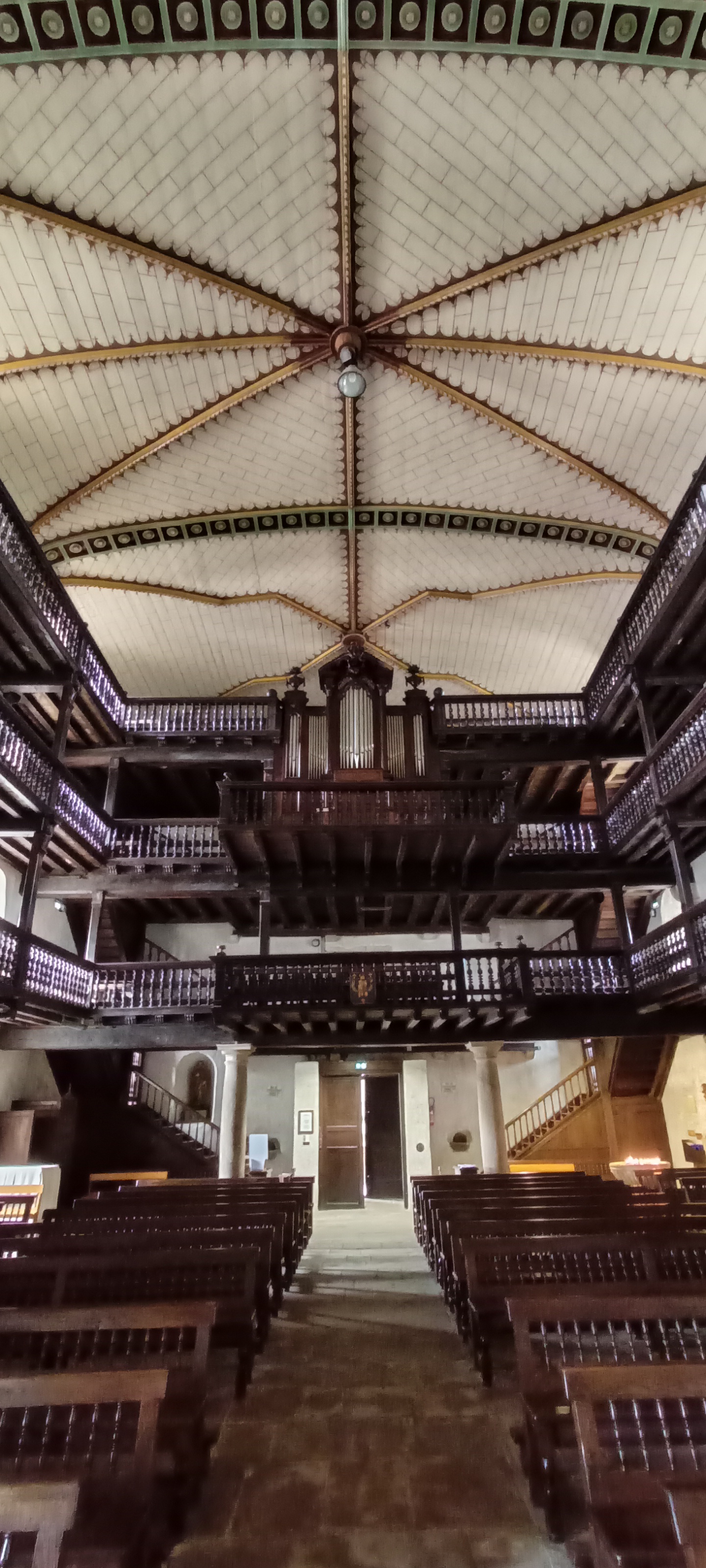 L'extérieur n'attire peut-être pas autant l'attention, même si le fait qu'il ait des rangées de fenêtres est déjà étrange quand on le voit, mais le meilleur se trouve à l'intérieur, trois étages de terrasses, comme des boîtes, sur les côtés de la nef, construites en le bois, vraiment, beau et impressionnant. Pour ne pas le manquer. Entrée gratuite pendant la période d'ouverture de l'église.