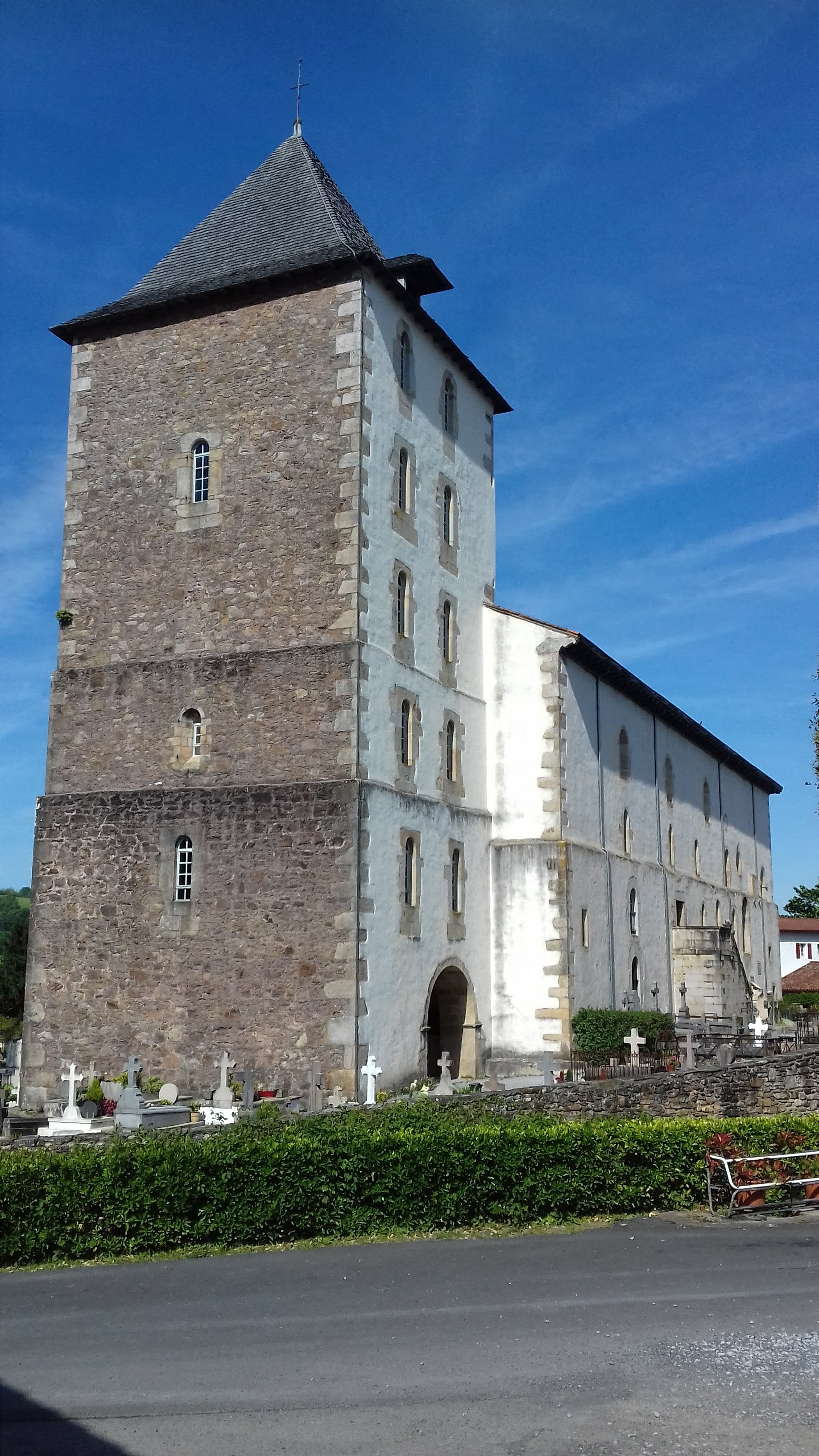 Magnifique église basque fortifiée a noter les 3 niveaux de galerie. Le cimetière qui le touche est très caractéristique du pays.