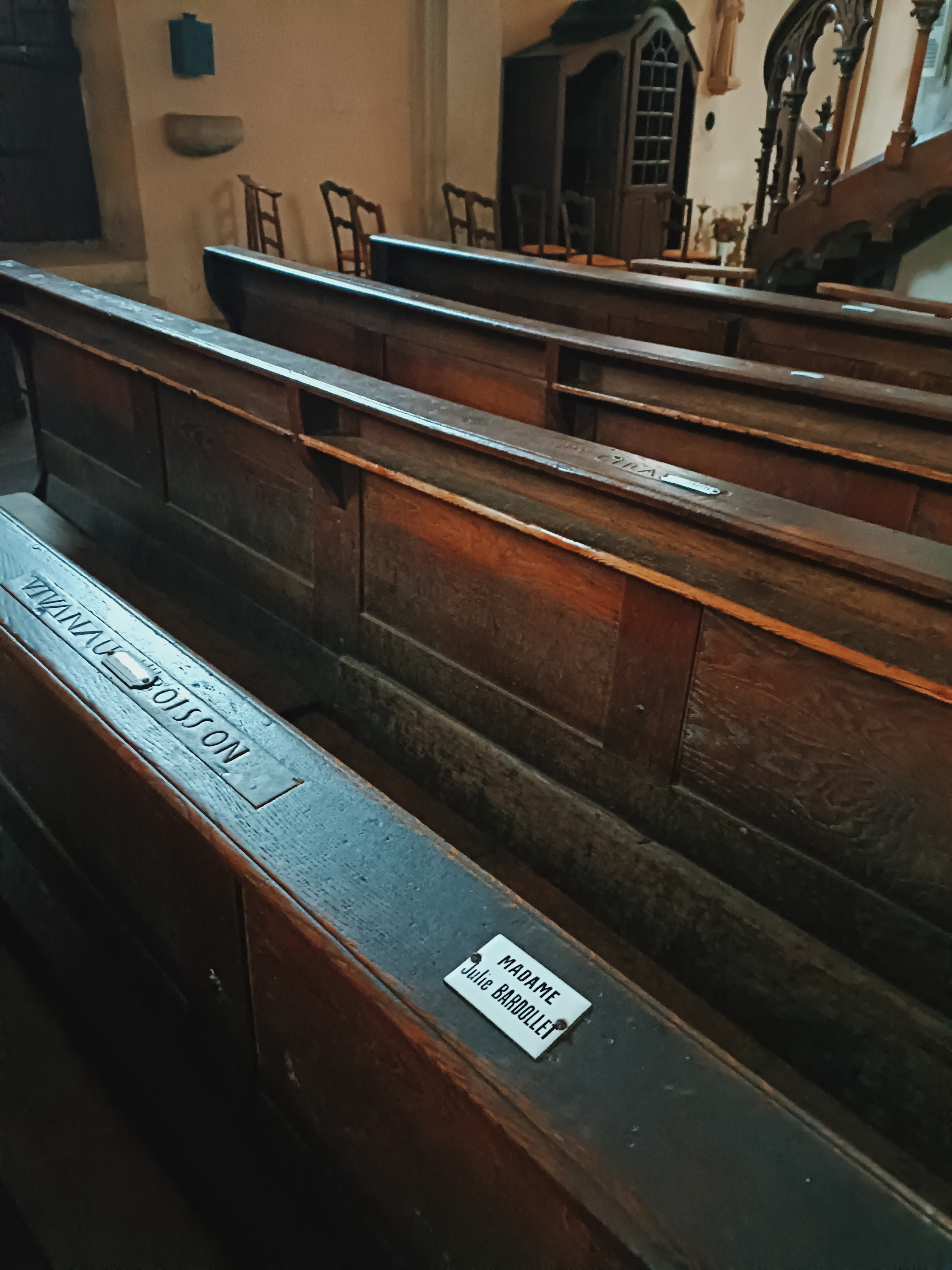 Église à visiter, où les notables de la villes avaient/ont leurs noms sur les bancs
