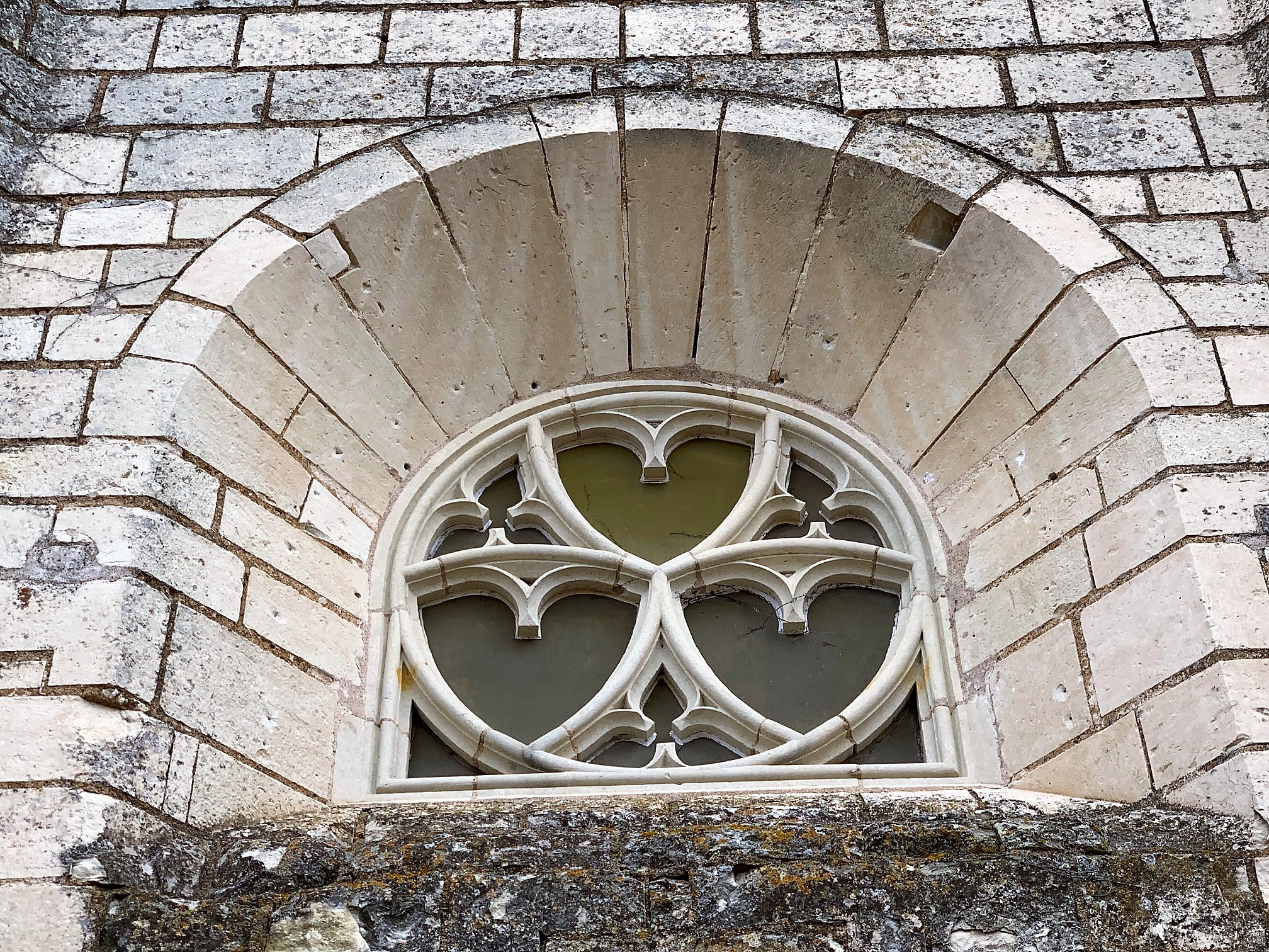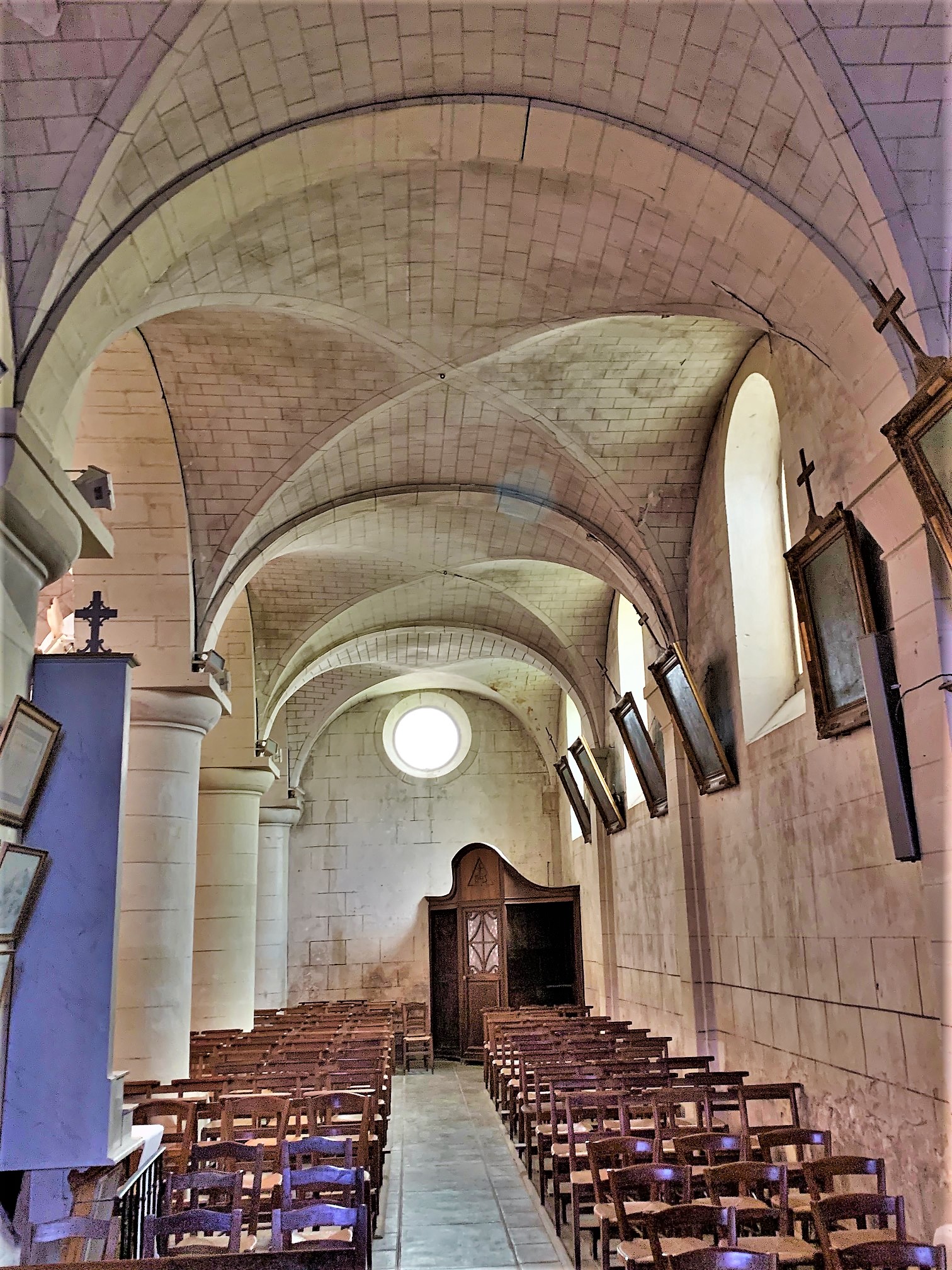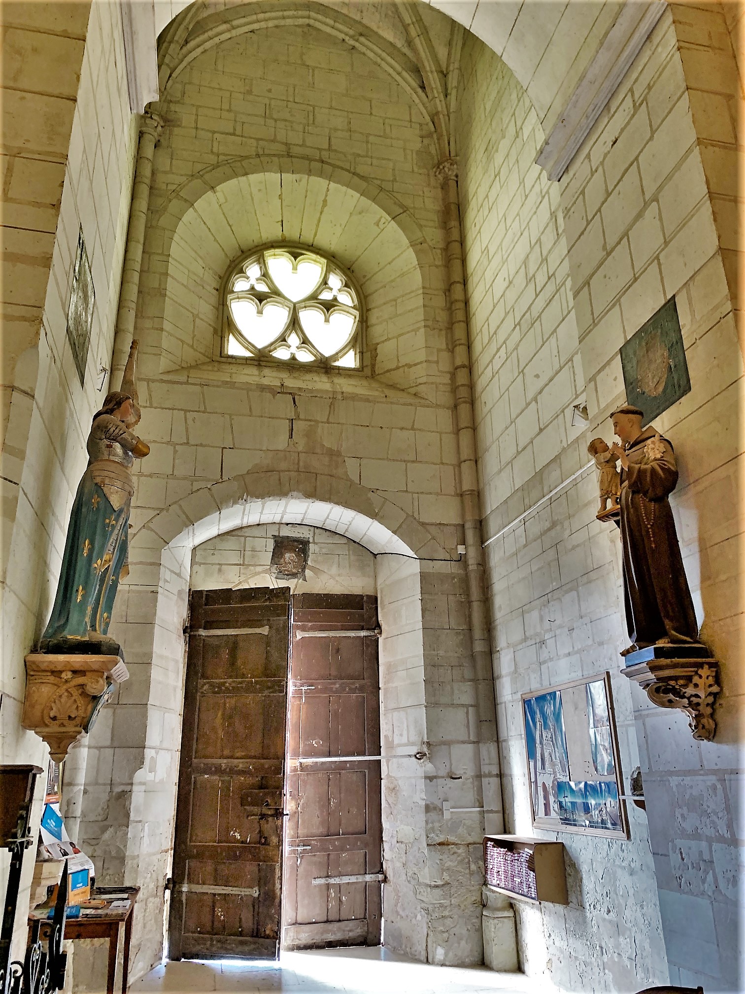 La flèche en tuffeau qui domine le clocher est imposante. L'église éponyme de la place qui l’accueille, est bien mise en valeur côté ouest, mais il est impossible d'en faire le tour et d'accéder au chevet. L'église Saint-Martin date du 12ème siècle, la nef de l'édifice primitif avait un seul vaisseau. Durant le 19ème siècle, on lui adjoint une deuxième nef au nord, l'édifice étant trop petit après la réunion de la commune d'Angliers et celle de Saint-Cassien. Après une démarche à la mairie, une dame de la Paroisse m'a permis de la visiter. La nef du 12ème est en meilleur état que celle du 19ème, quelques tableaux, des objets de cultes et sculptures sont à voir. Deux vitraux m'ont intéressé, particulièrement celui de la baie axiale, situé derrière le maître-autel, qui traite de Saint-Martin. Le second, est situé dans la nef nord, il représente une annonciation. Ces deux vitraux datent du début du 20ème siècle.
