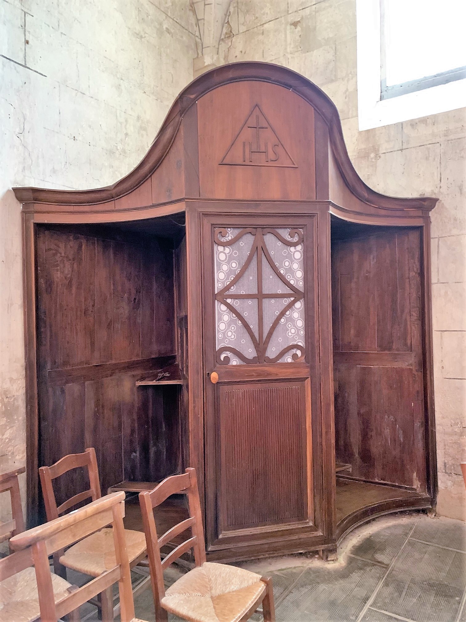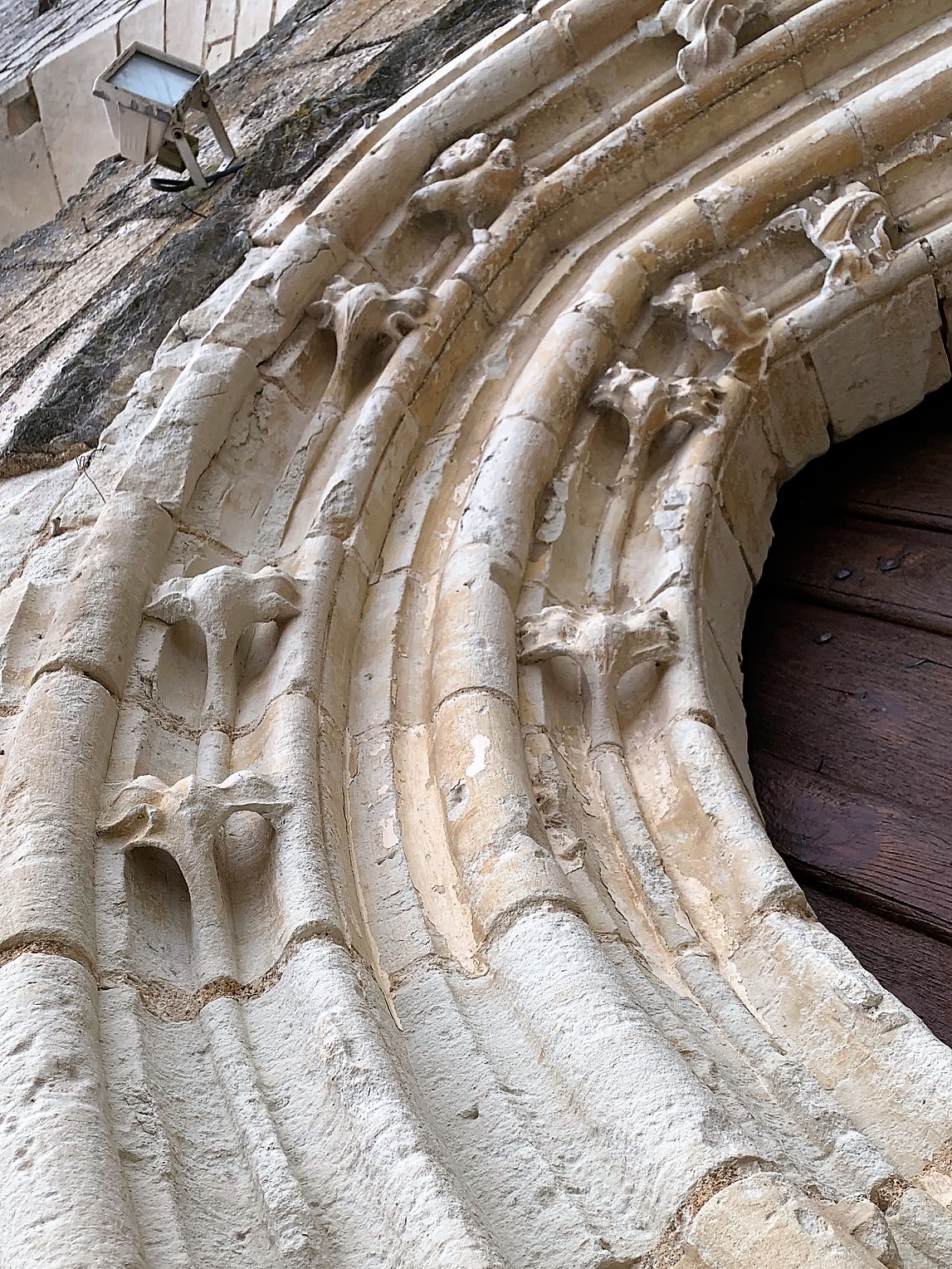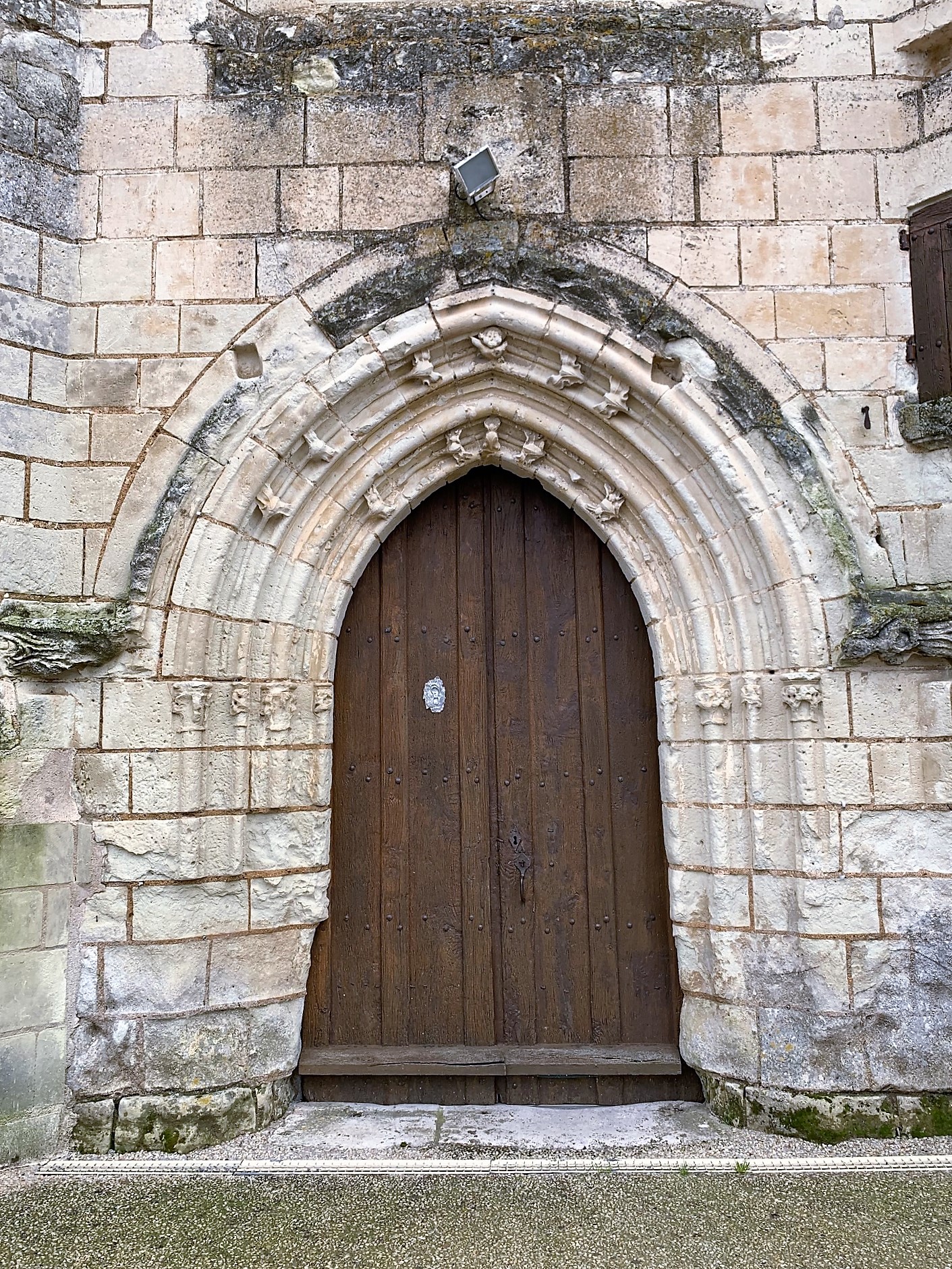 La flèche en tuffeau qui domine le clocher est imposante. L'église éponyme de la place qui l’accueille, est bien mise en valeur côté ouest, mais il est impossible d'en faire le tour et d'accéder au chevet. L'église Saint-Martin date du 12ème siècle, la nef de l'édifice primitif avait un seul vaisseau. Durant le 19ème siècle, on lui adjoint une deuxième nef au nord, l'édifice étant trop petit après la réunion de la commune d'Angliers et celle de Saint-Cassien. Après une démarche à la mairie, une dame de la Paroisse m'a permis de la visiter. La nef du 12ème est en meilleur état que celle du 19ème, quelques tableaux, des objets de cultes et sculptures sont à voir. Deux vitraux m'ont intéressé, particulièrement celui de la baie axiale, situé derrière le maître-autel, qui traite de Saint-Martin. Le second, est situé dans la nef nord, il représente une annonciation. Ces deux vitraux datent du début du 20ème siècle.
