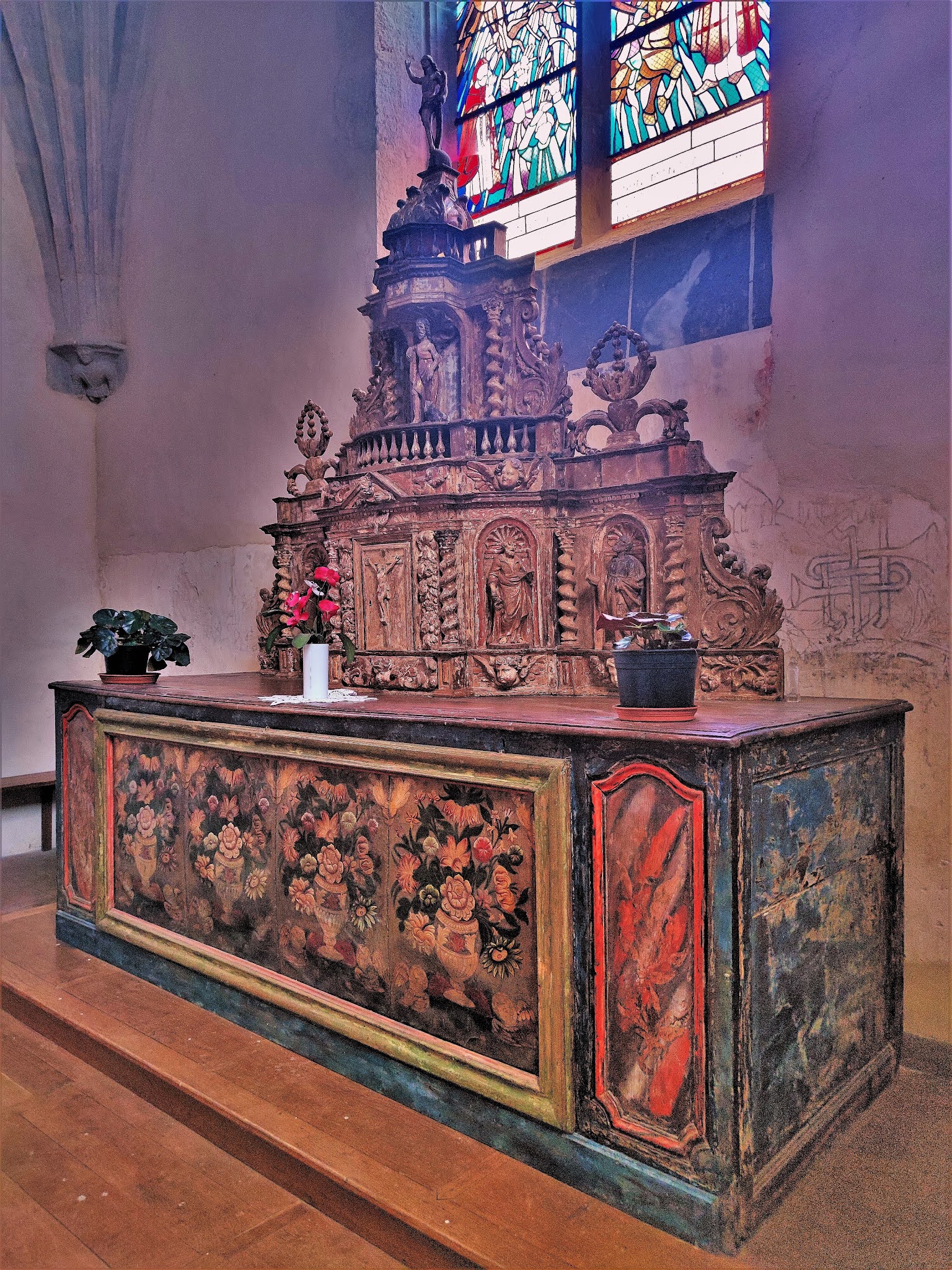 Vue de l'extérieur, cette église est assez étrange, plusieurs éléments lui donnent une allure singulière. D'une part, la façade semble avoir été amputée au Sud, les arcades du clocher-mur qui la surplombe sont dissimulées par une construction en bois, en porte à faux au dessus du portail. D'autre-part, le chœur est plus haut que la nef. Cette dernière semble pénétrer dans le sanctuaire à travers une ancienne façade ayant conservée ses contreforts d'angle. En fait, ces particularités résultent de l'histoire de l'édifice, qui fut la réunion d'une église paroissiale et d'une prieurale. Un édifice roman du 12ème dont la nef est le vestige et un chœur gothique du 15ème. La nef unique est charpentée de lambris, elle était probablement voûtée comme le laissent supposer les colonnes engagées. La voûte du chœur est en 16 parties, son élégance magnifie les lieux. La statuaire, les vitraux, le mobilier, les décors sculptés et/ou peints sont autant de choses à découvrir, ils offrent un sympathique voyage à travers les siècles, du 12ème à la période contemporaine.