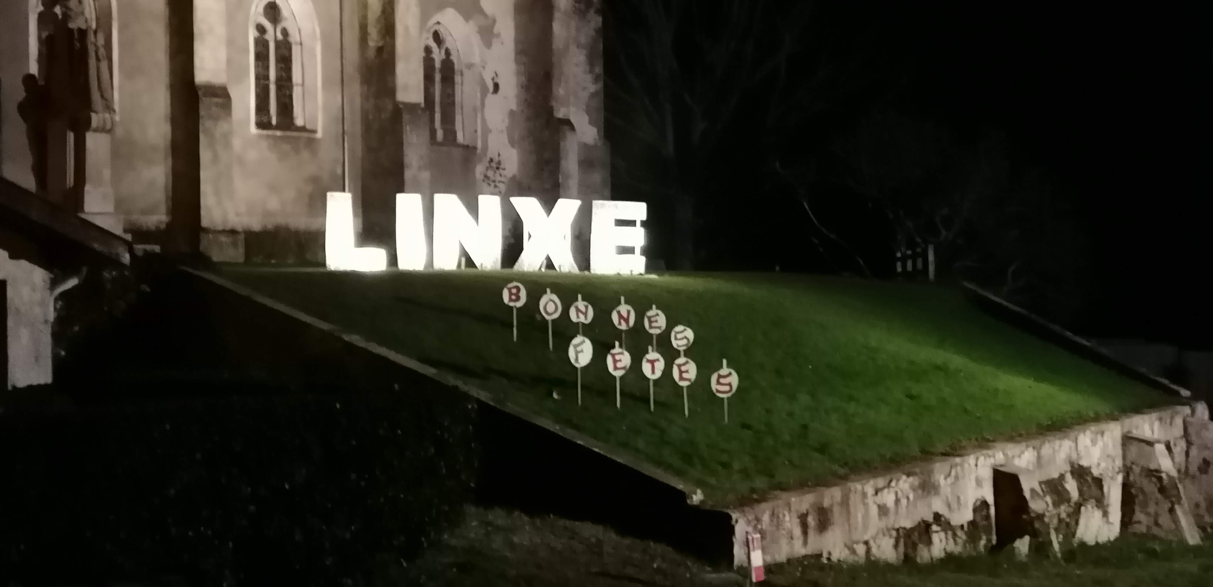 Église Saint Martin à Linxe de nuit avec les décorations de Noël. Magnifique initiative ! Ça vaut vraiment le déplacement. Superbe. À voir absolument.