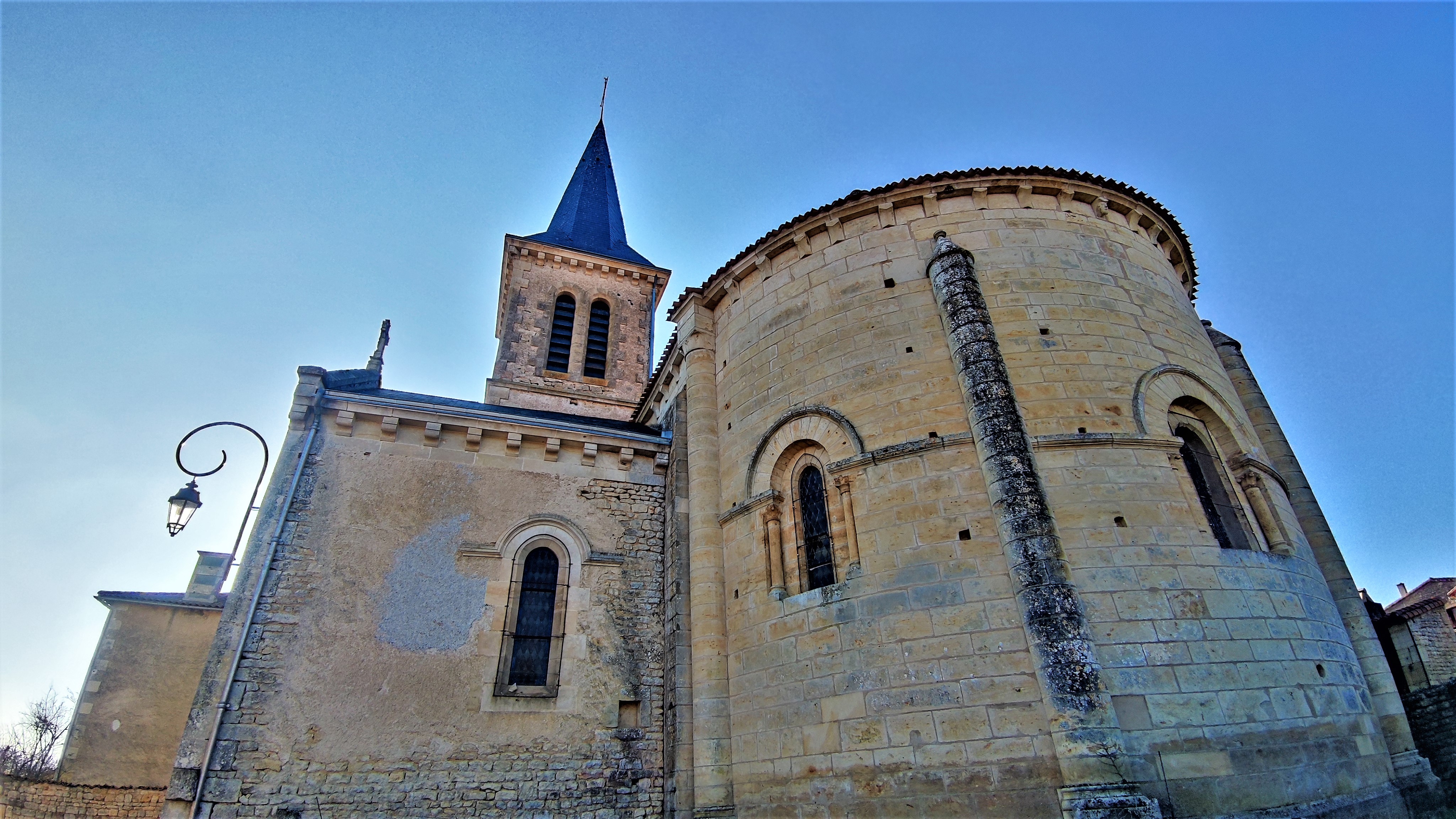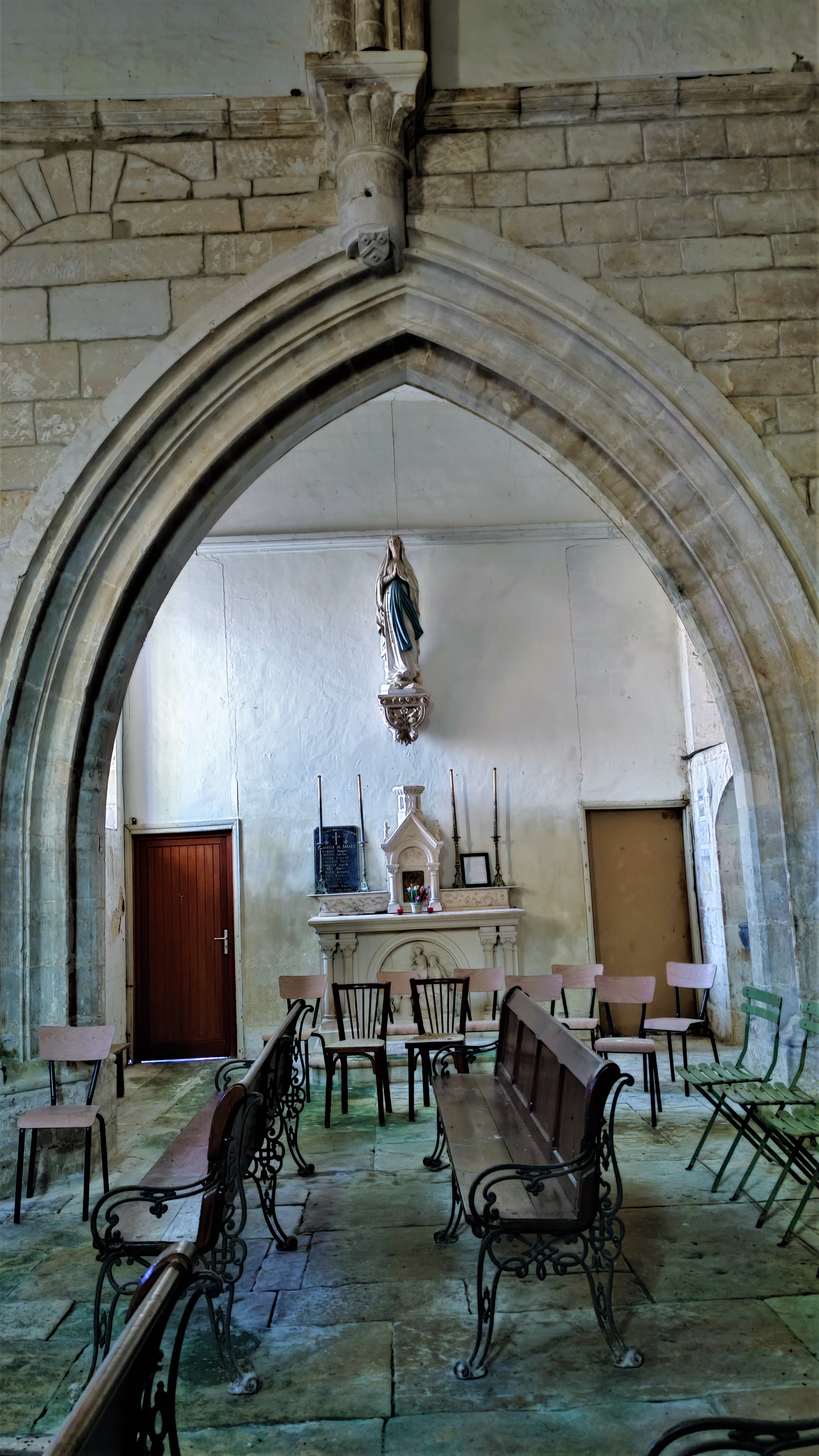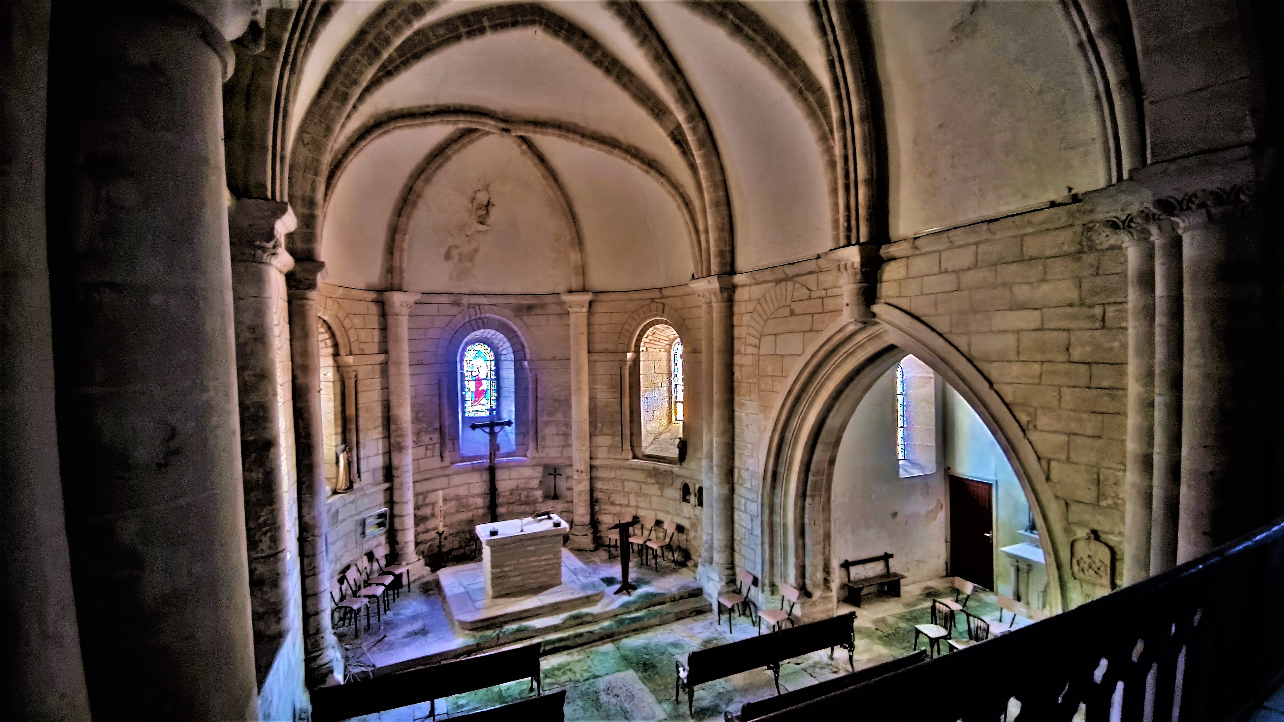 Partie orientale d'une église du 12è, l'architecture est une merveilleuse représentation du passage du Roman au Gothique. De la partie occidentale, seule une travée de la nef a subsisté, le reste est devenu maison d'habitation. A la révolution, l'église est mise en vente en 2 lots, elle échappe à la disparition complète par miracle, le lot (chœur chapelle) est racheté par 5 familles. Logée dans une rue peu accessible, cette église n'est pas vraiment mise en valeur. Pour y entrer, il faut s'adresser à la mairie toute proche. On pénètre dans le clocher construit au 19è, siècle qui a vu également la restauration de la chapelle seigneuriale du 15è. L'architecture du chœur et de l'abside est une merveilleuse représentation du passage du Roman au Gothique. La voûte en berceau brisée est renforcée par de grosses nervures qui se croisent, renfort que l'on retrouve sur la voûte en demi-coupole de l'abside.