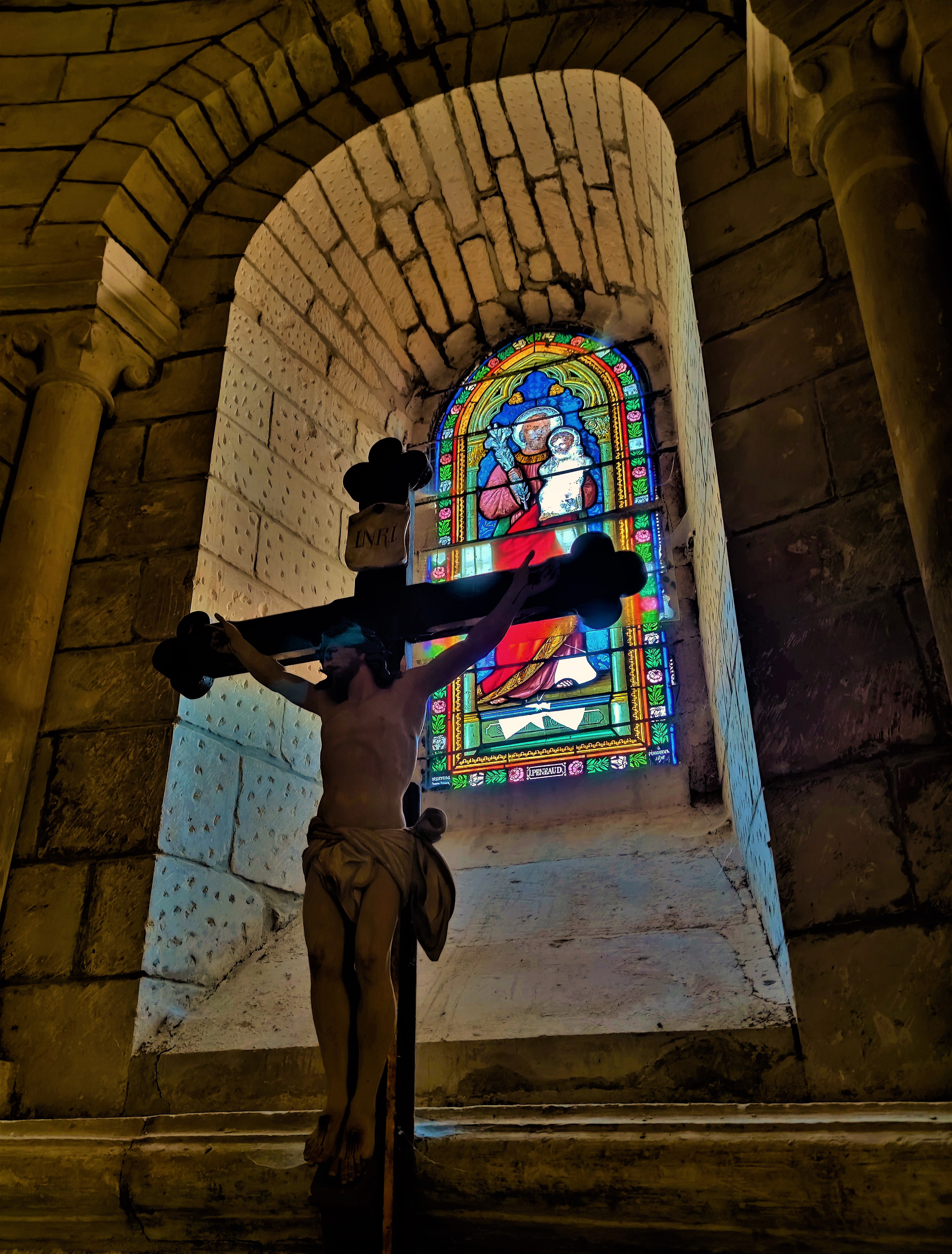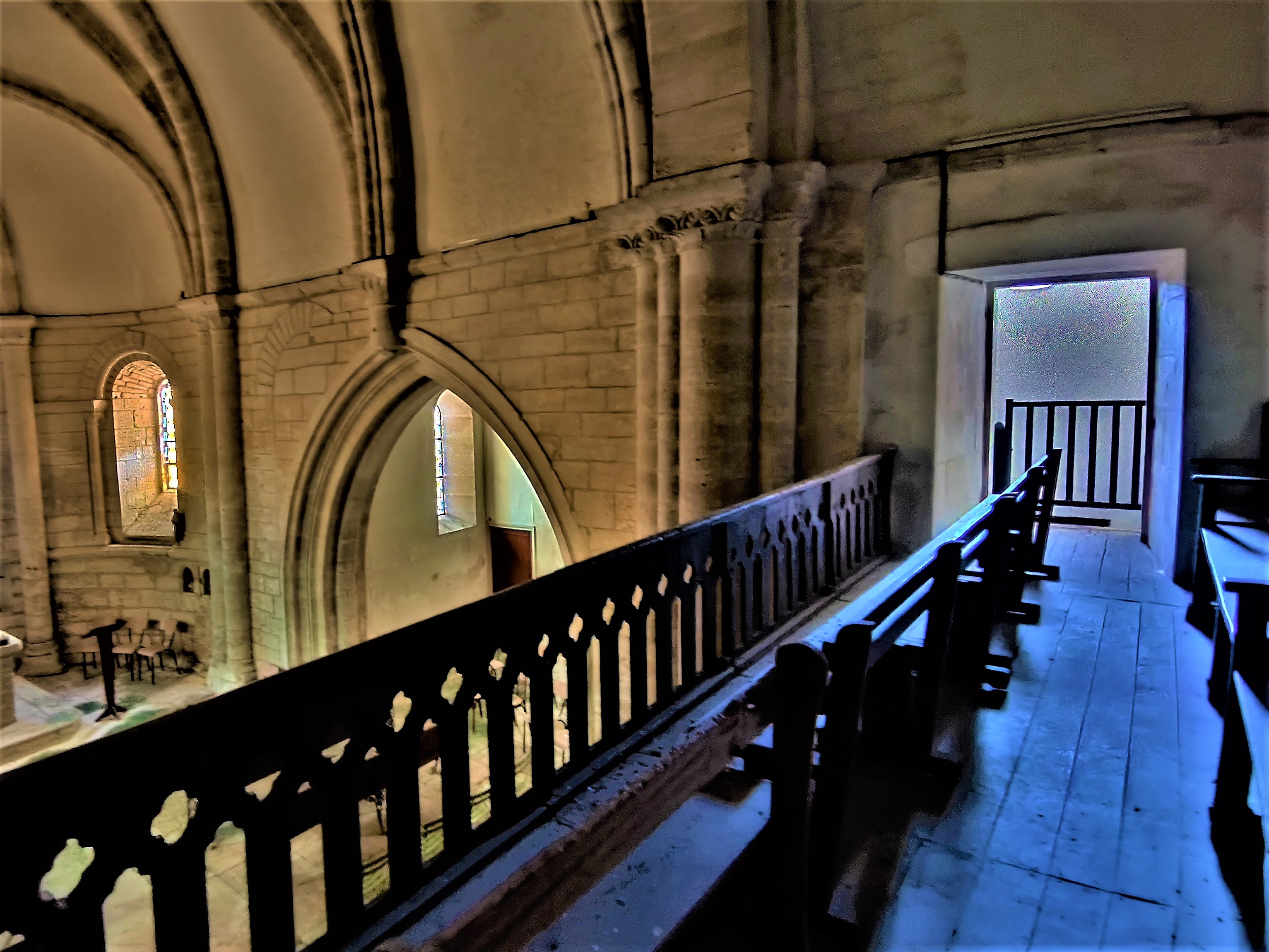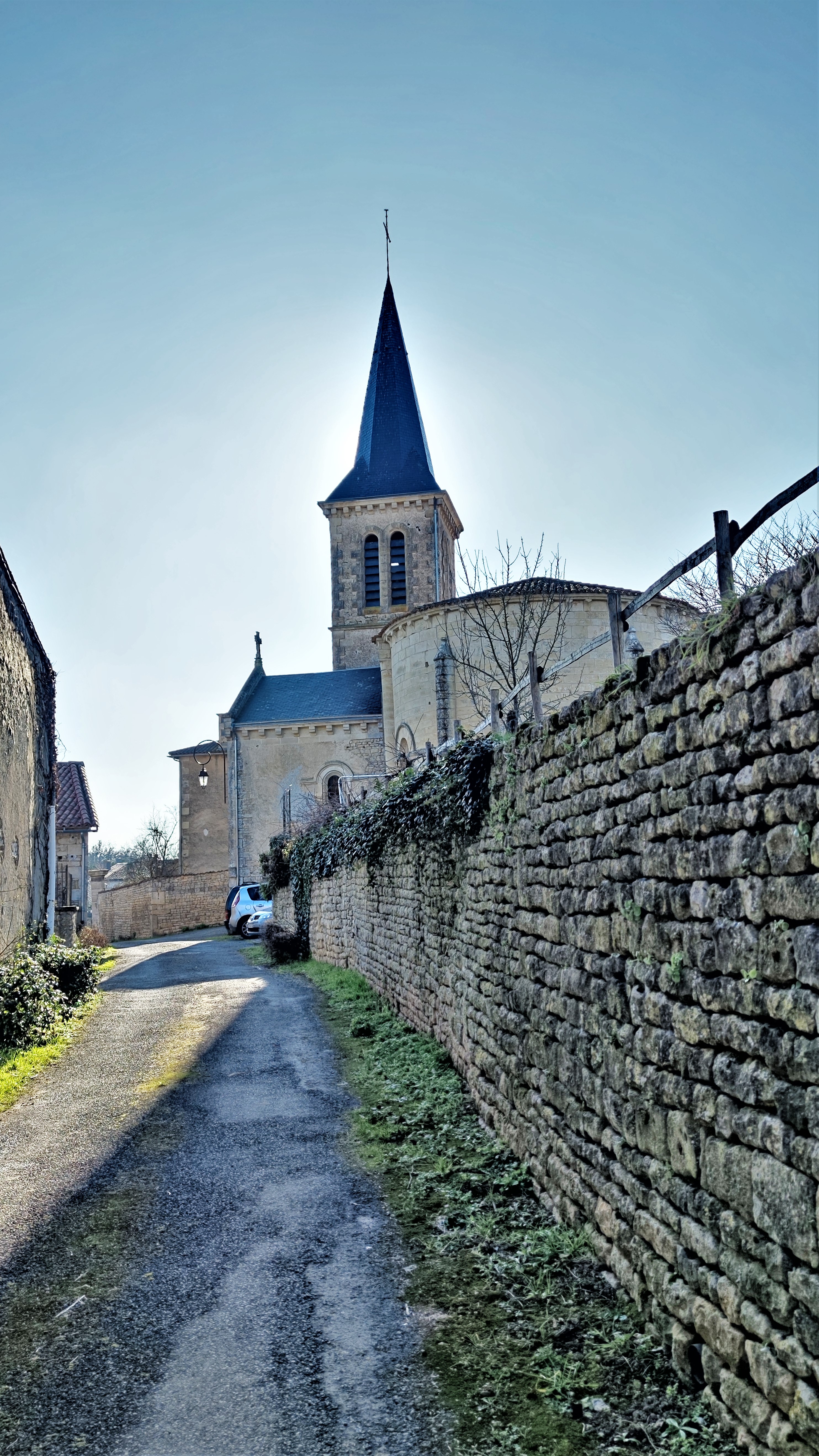 Partie orientale d'une église du 12è, l'architecture est une merveilleuse représentation du passage du Roman au Gothique. De la partie occidentale, seule une travée de la nef a subsisté, le reste est devenu maison d'habitation. A la révolution, l'église est mise en vente en 2 lots, elle échappe à la disparition complète par miracle, le lot (chœur chapelle) est racheté par 5 familles. Logée dans une rue peu accessible, cette église n'est pas vraiment mise en valeur. Pour y entrer, il faut s'adresser à la mairie toute proche. On pénètre dans le clocher construit au 19è, siècle qui a vu également la restauration de la chapelle seigneuriale du 15è. L'architecture du chœur et de l'abside est une merveilleuse représentation du passage du Roman au Gothique. La voûte en berceau brisée est renforcée par de grosses nervures qui se croisent, renfort que l'on retrouve sur la voûte en demi-coupole de l'abside.