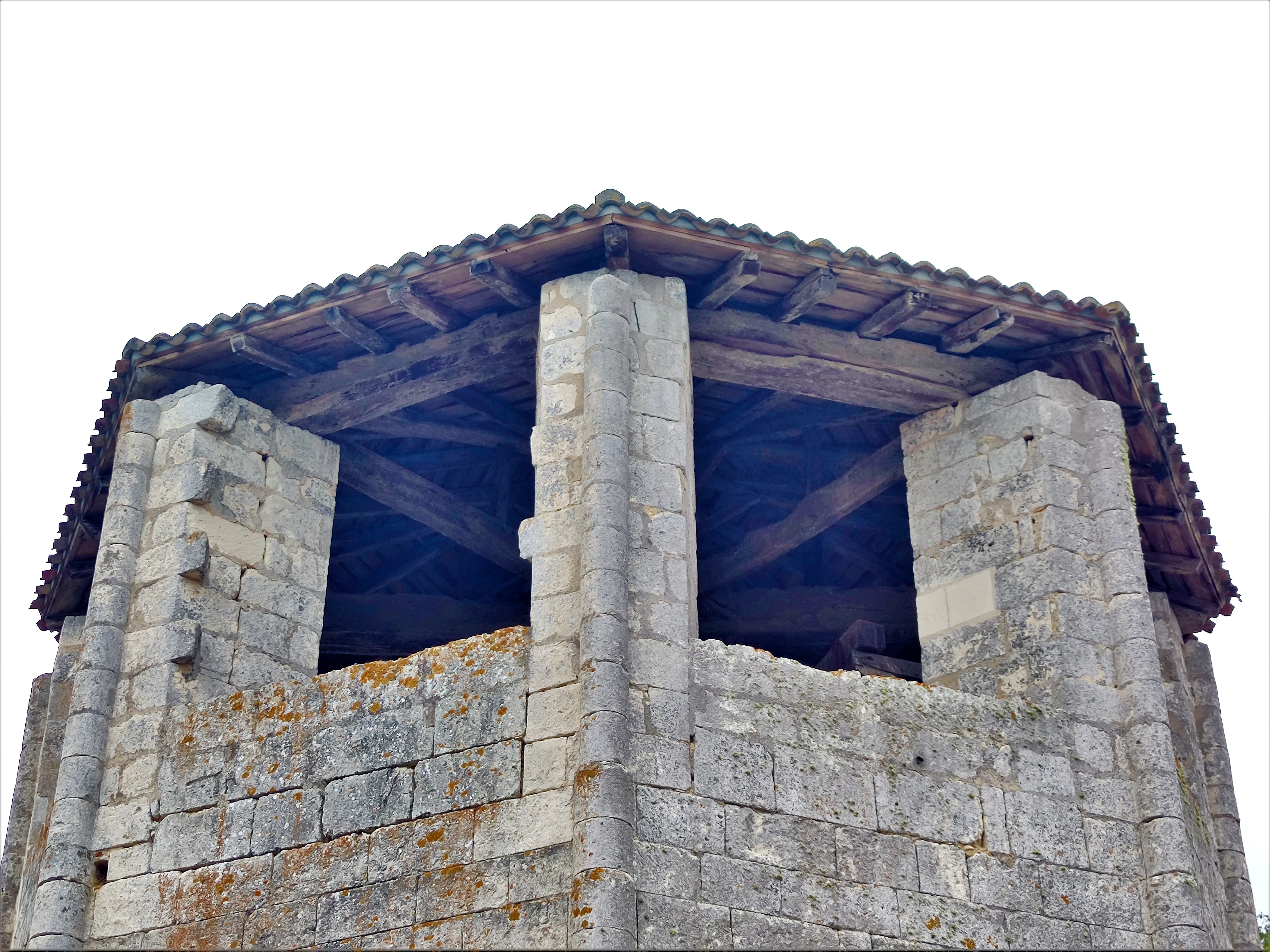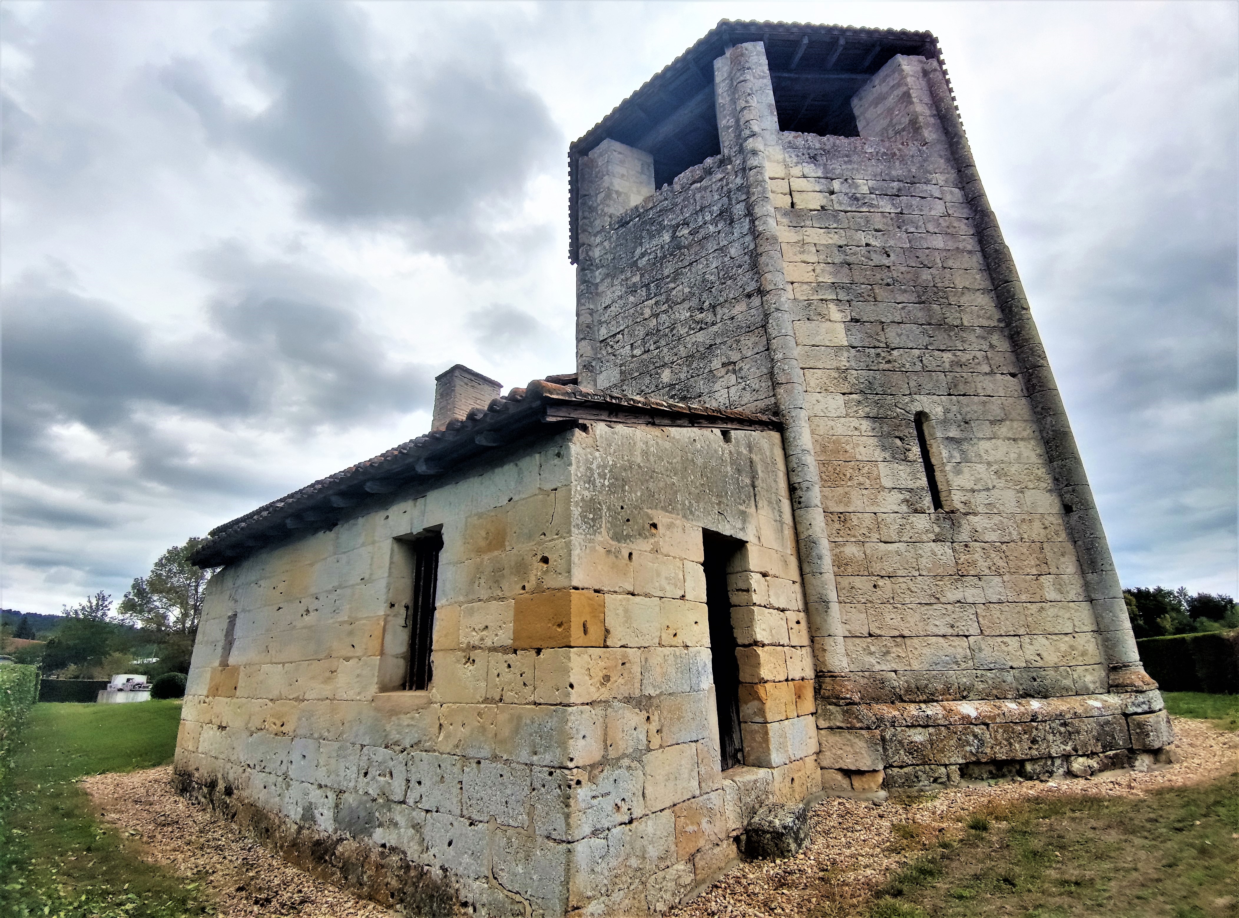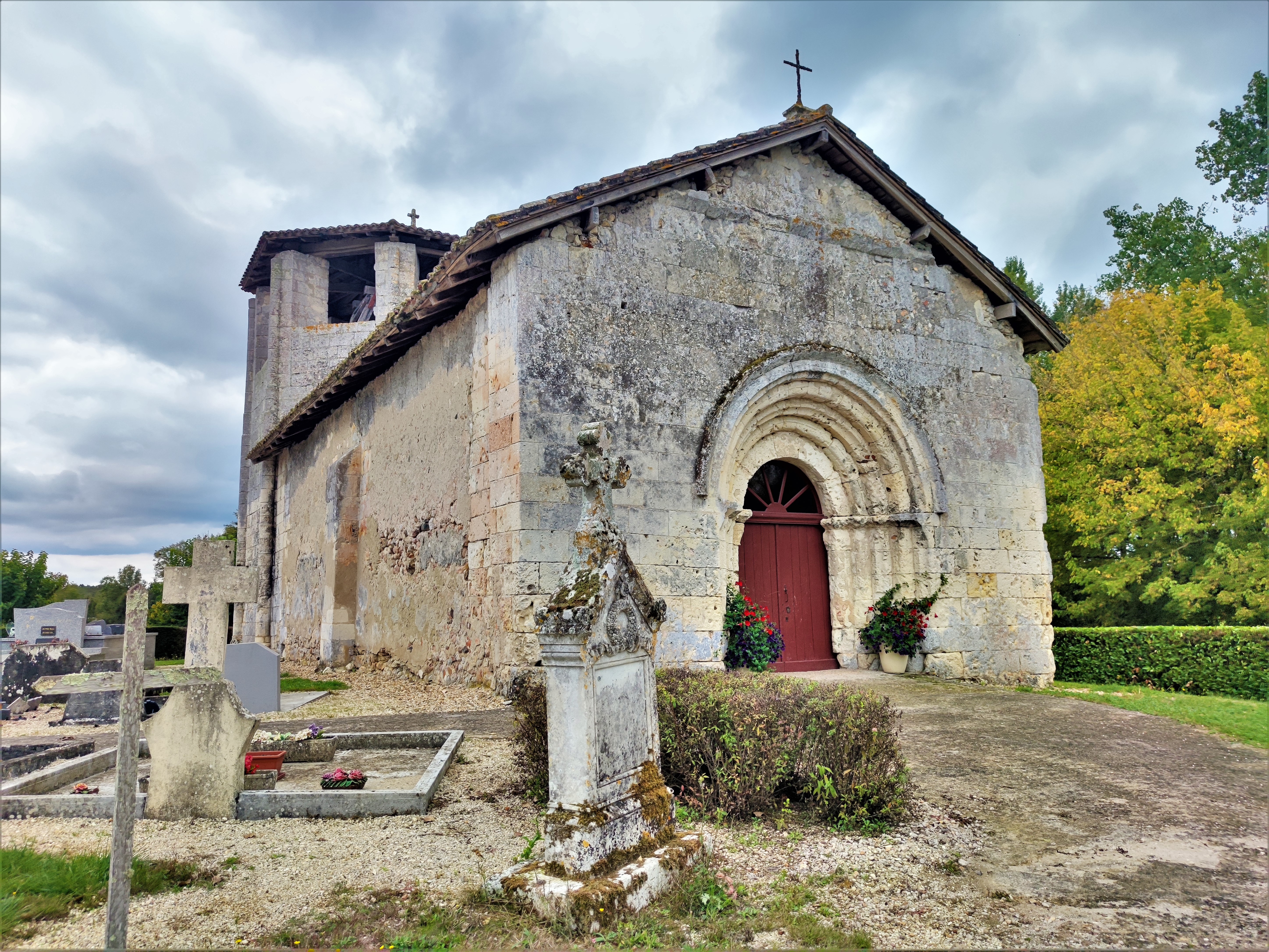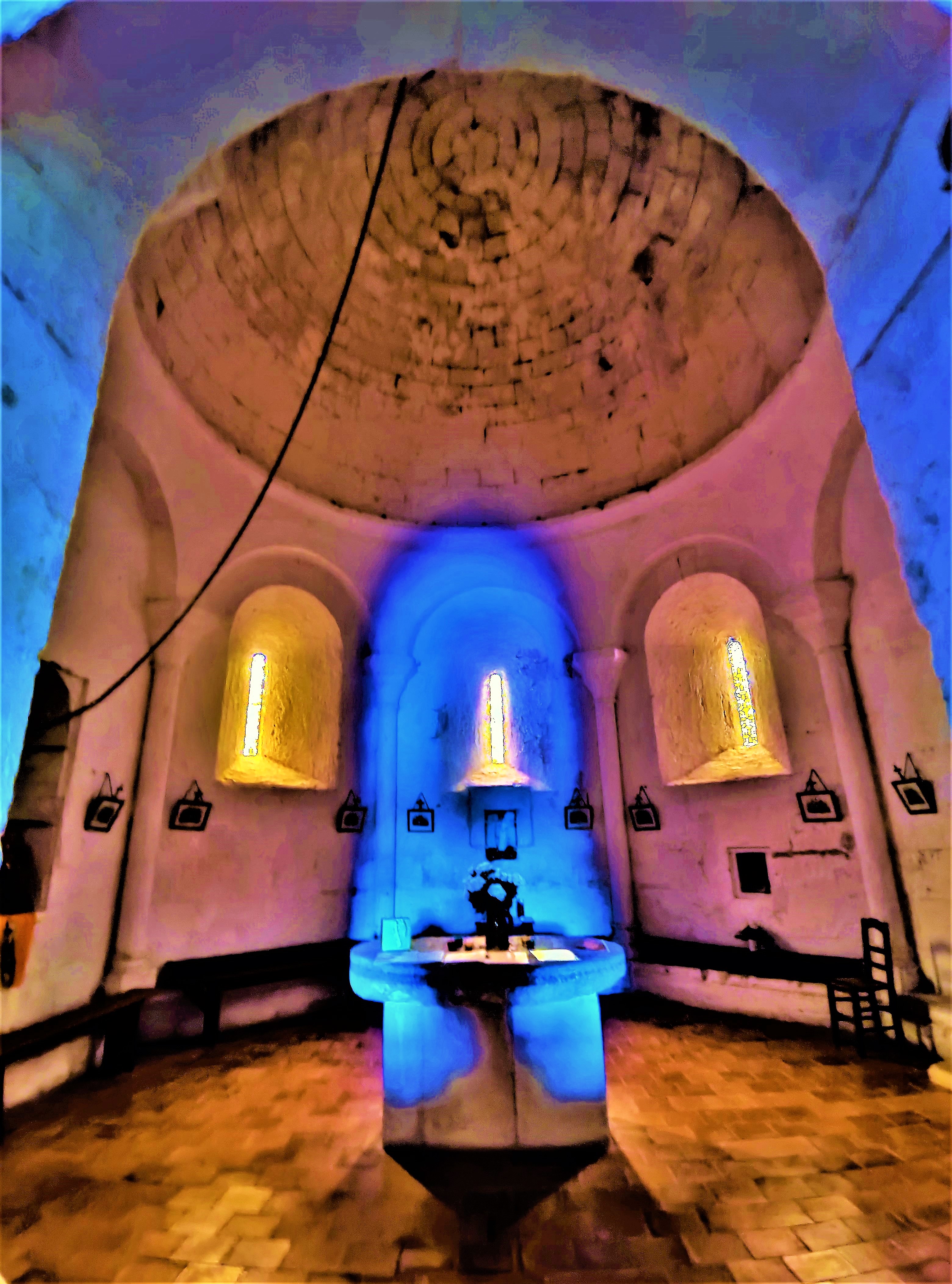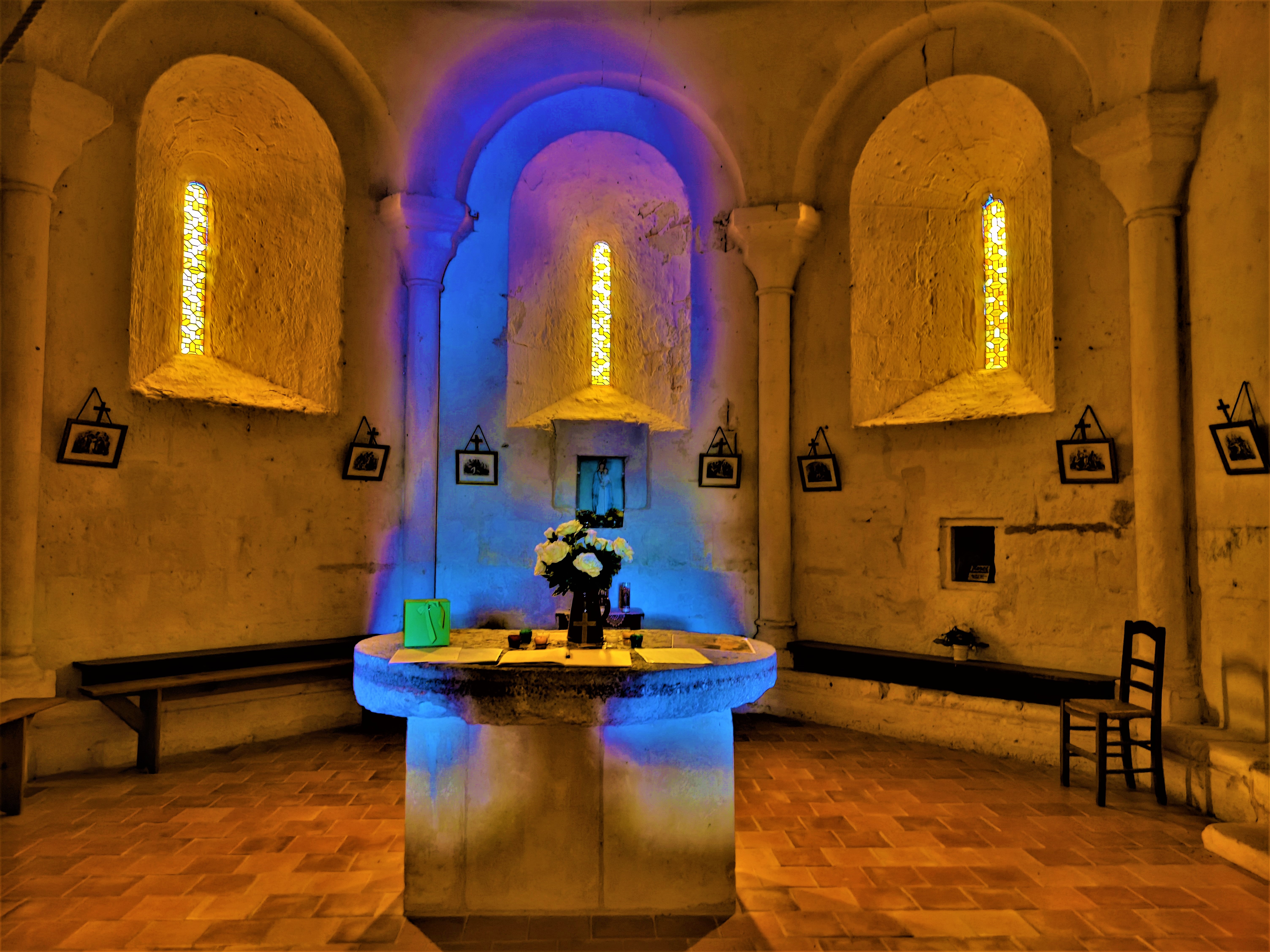 À l'écart de toute habitation, legs médiéval, cette église trône dans le cimetière situé près d'un méandre de la rivière l'Isle. Selon les sources, le chœur-clocher-tour-fanal octogonal, en forme de baptistère, daterait du 9ème ou du 12ème. Habitant Poitiers, où le baptistère Saint-Jean du 5ème montre à voir un chef-d'œuvre paléo chrétien, les similitudes entre ce baptistère et le clocher Saint-Martin me fascinent. De ces deux admirables tours octogonales, celle de l'église de Saint-Martin-l'Astier est une réalisation qui emprunte à la perfection les techniques de constructions ancestrales ; elle est magnifique, peu importe sa datation exacte. La nef est du 12ème, l'accès au chœur se fait par une petite arcade. L'impression ressentie en pénétrant sous la coupole du sanctuaire est particulière, lieu de célébration, objet de rassemblement d'une communauté chrétienne il y a mille ans. L'éclairage diffusé par les vitraux est faible mais coloré, d'où l'allure des photos jointes et la curieuse apparition d'une forme bleue au-dessus de l'autel sur les clichés.