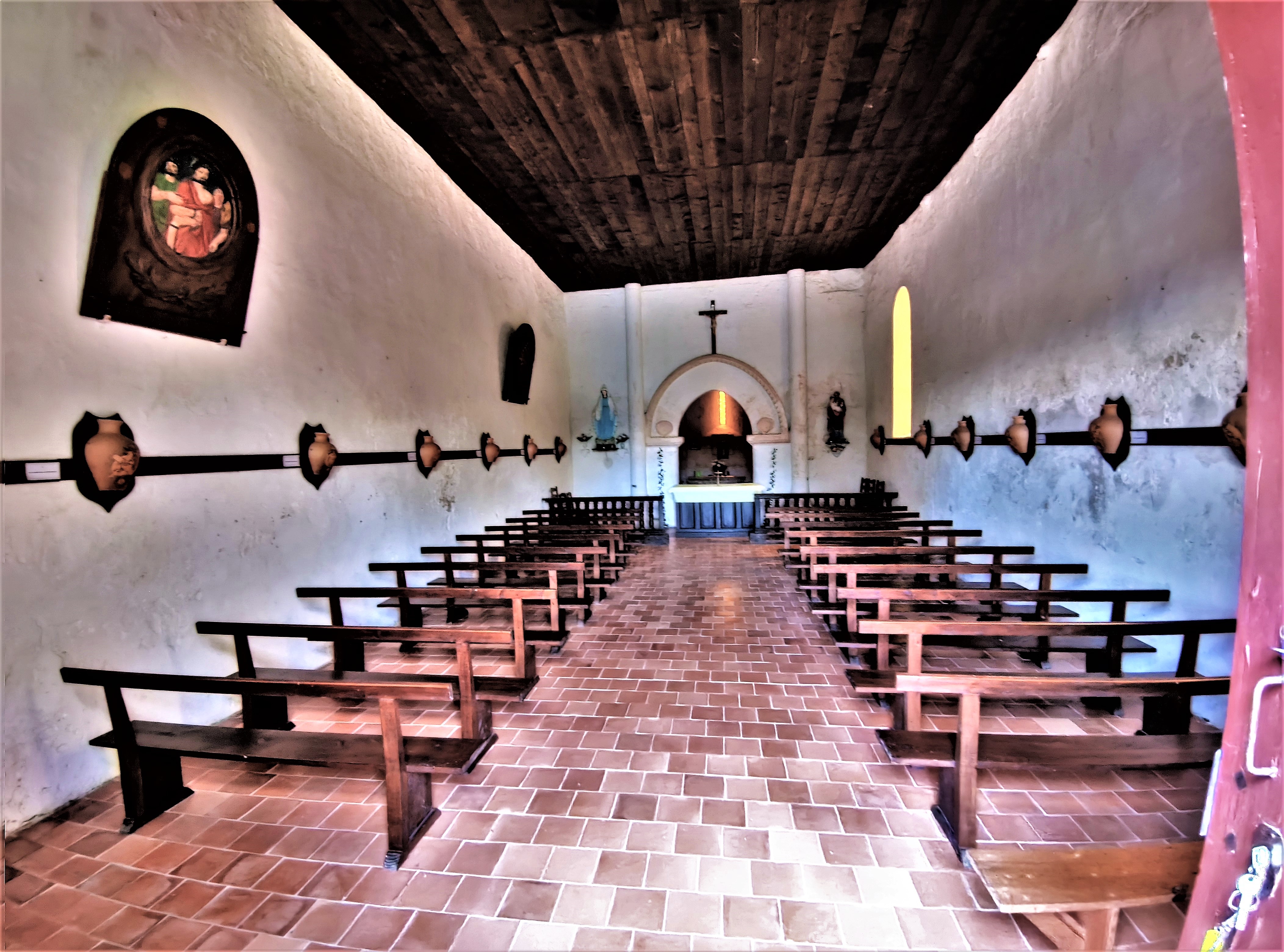 Église atypique, le clocher hexagonal permettait de faire des feux pour servir de repère (phare)... Il y a des tables et des bancs sur le côté pour le pique-nique.
