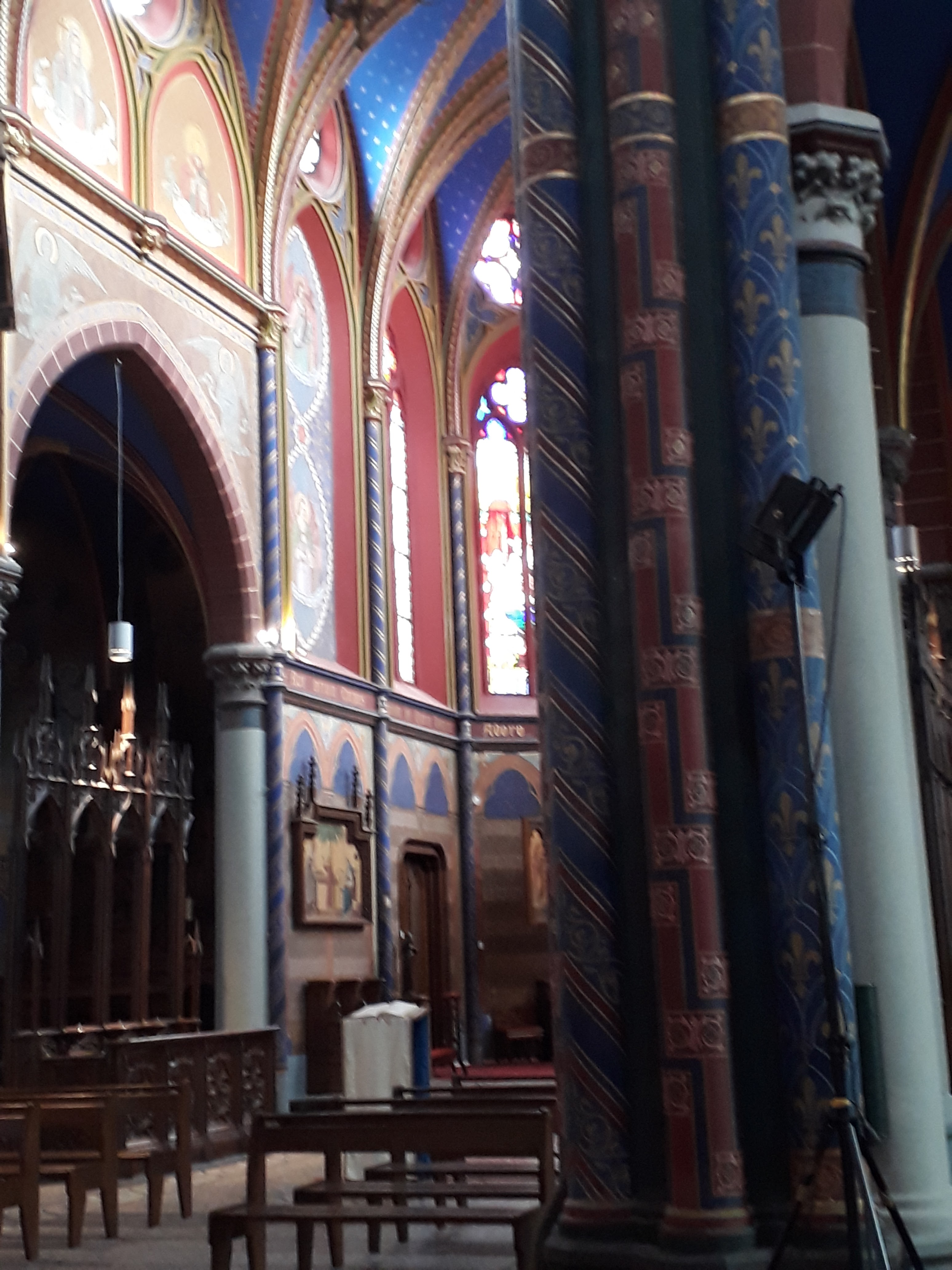 Très belle église du XIXe, avec les murs peints et de très beaux vitraux