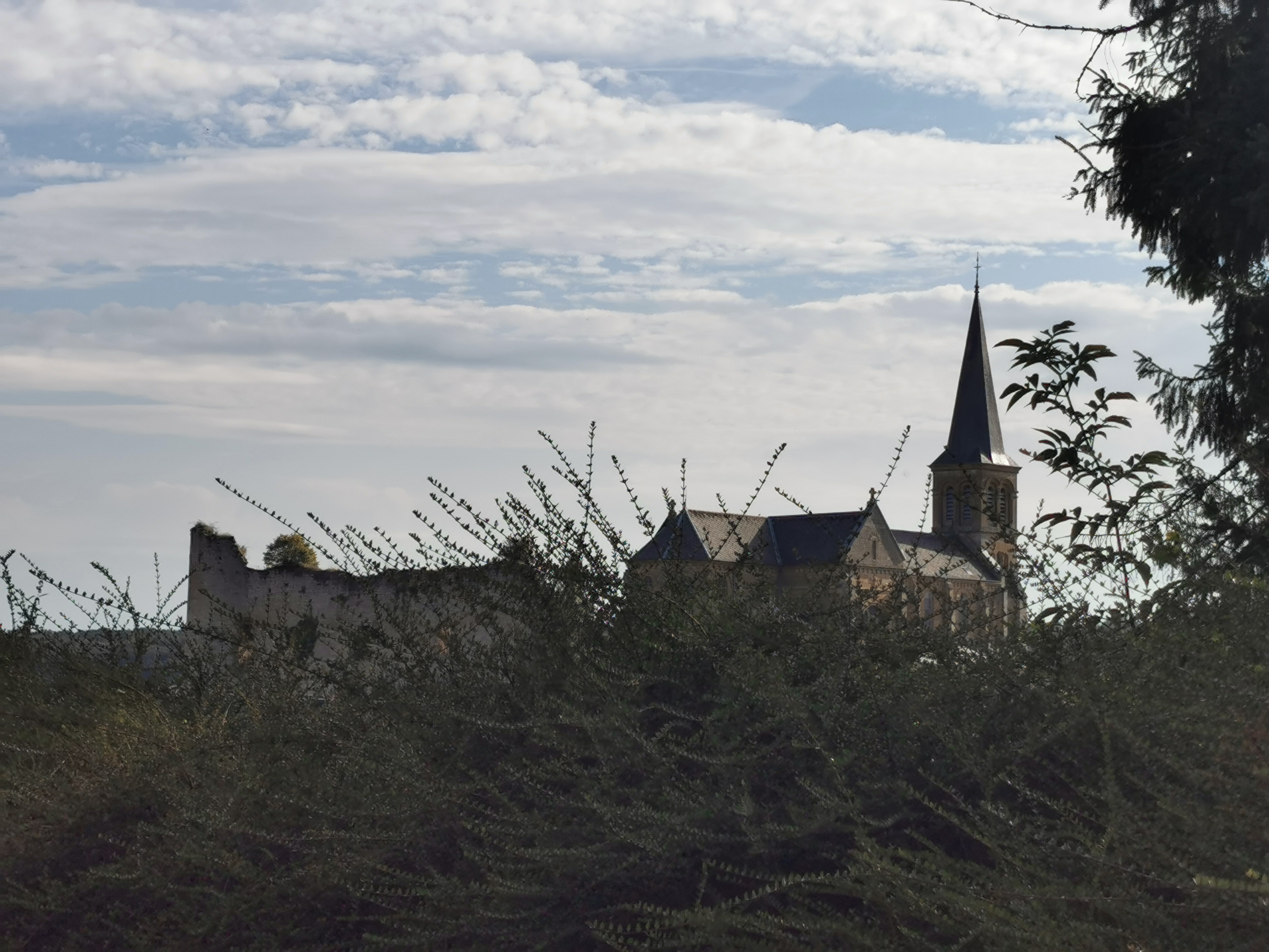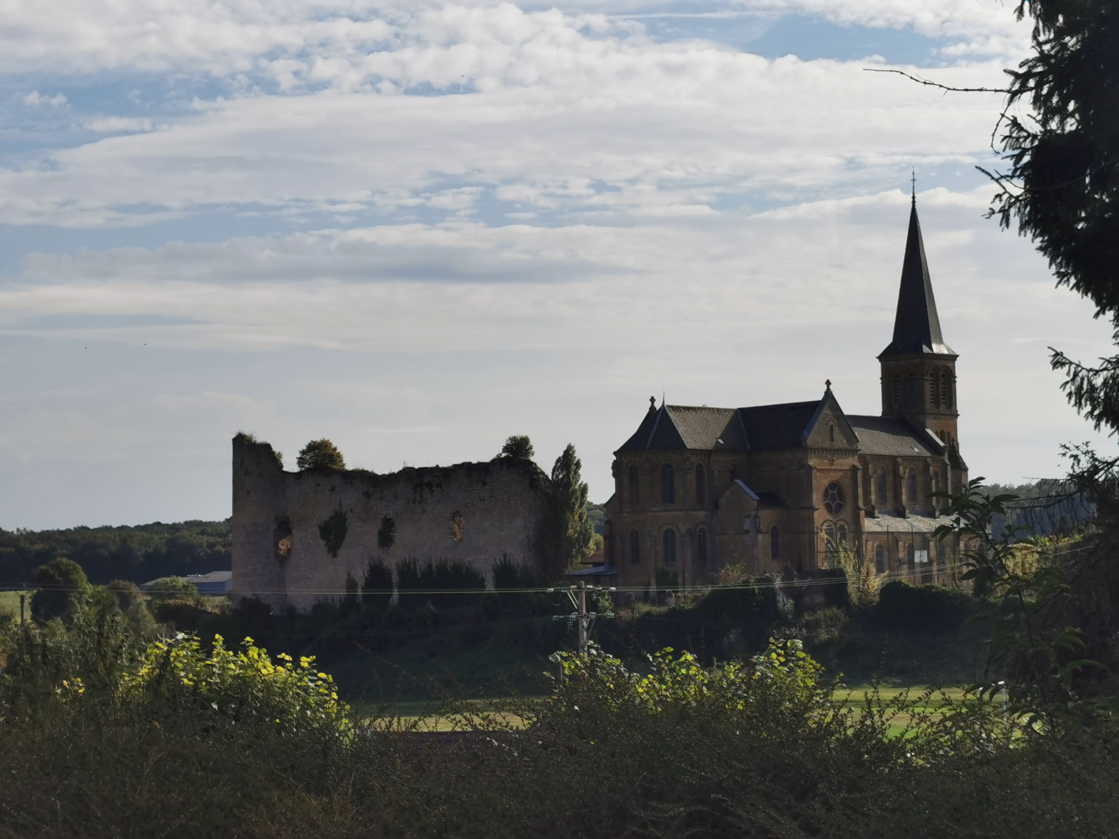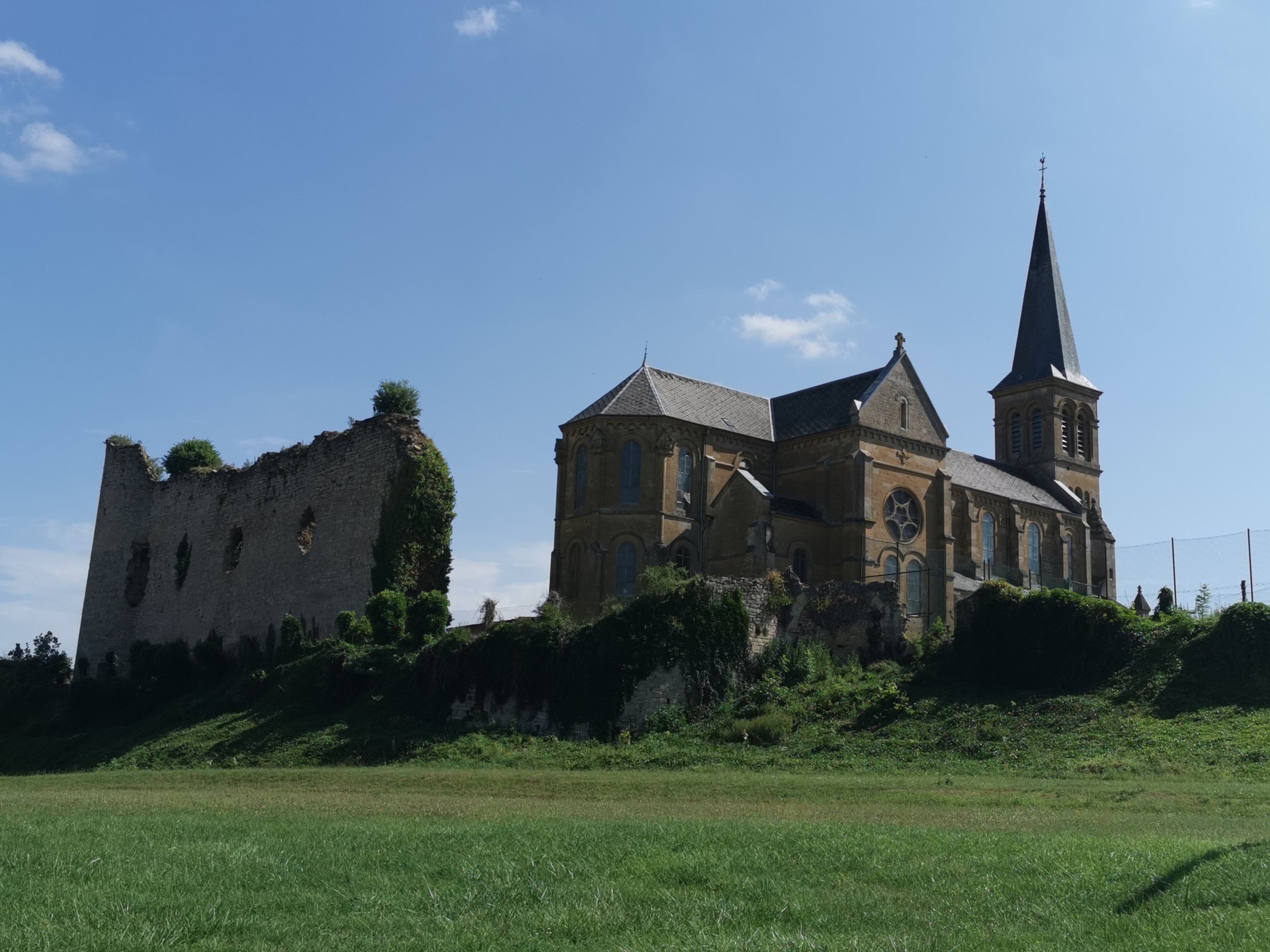 Belle église entourée des ruines d'un ancien château.