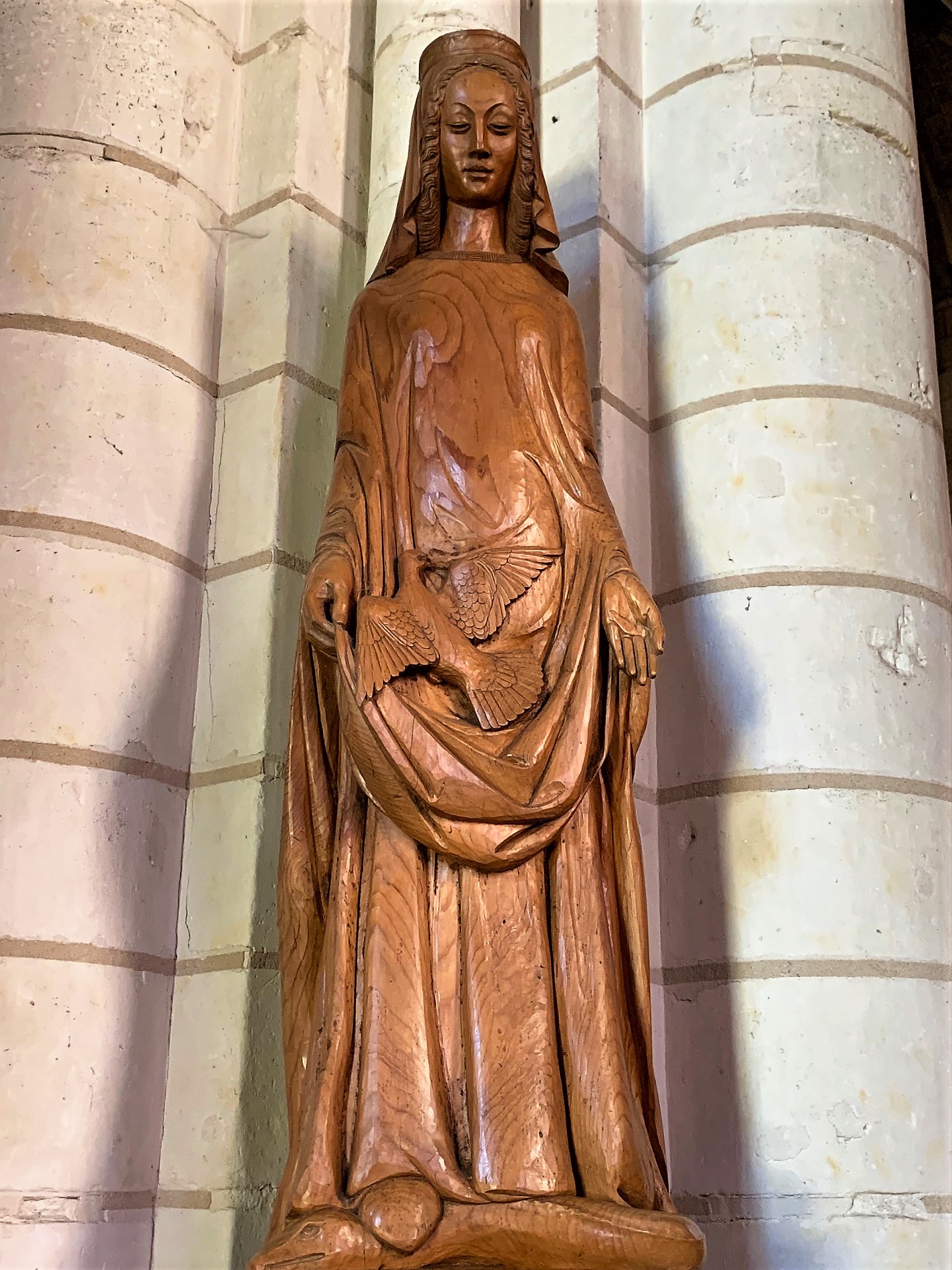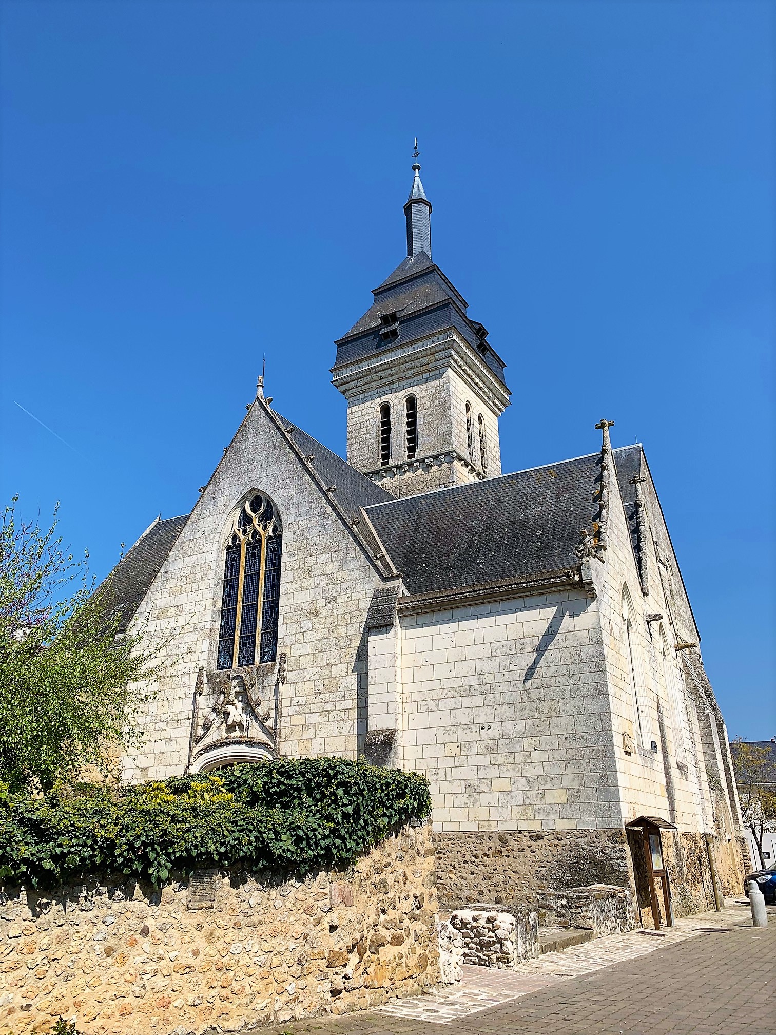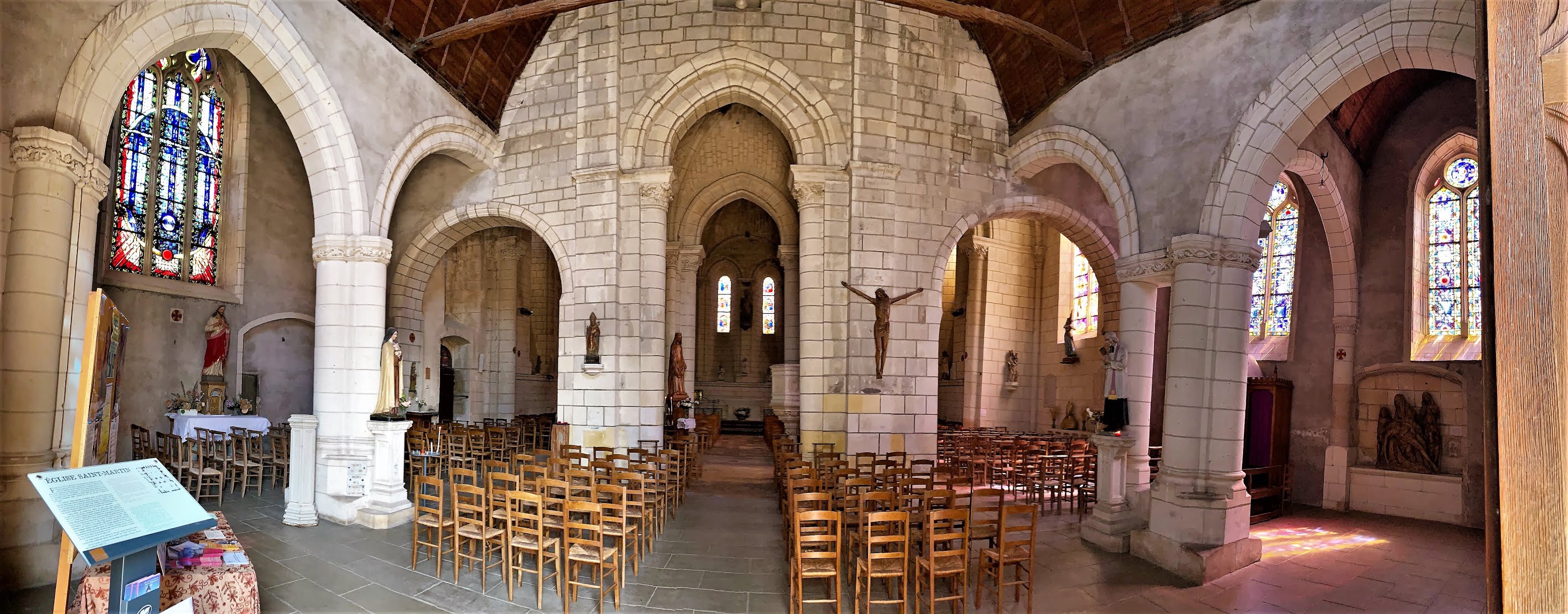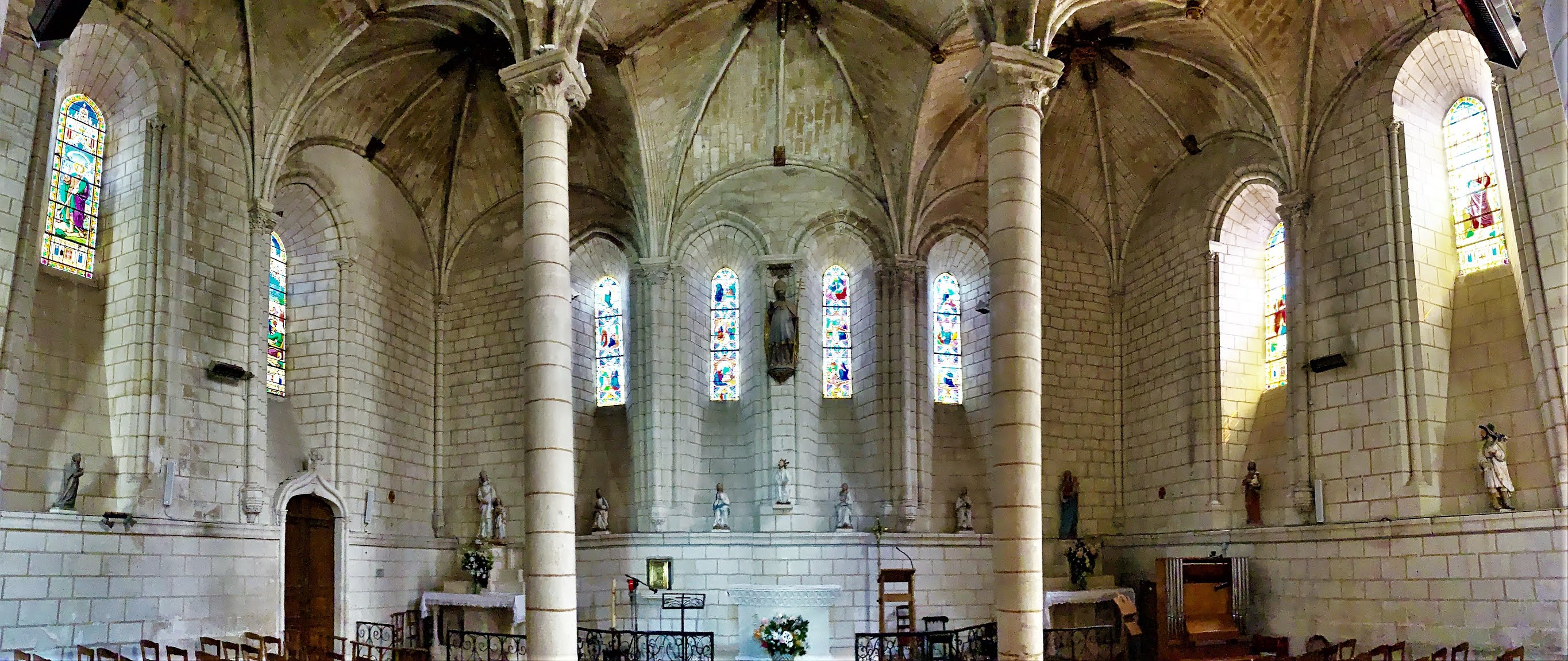 Dans le chœur roman, classé aux MH, d'élégantes colonnes soutiennent des voûtes de style Angevin. Ce chœur surprend par ses dimensions, il accueillait les moines du Prieuré. Une vingtaine d’œuvres datées du 11ème au 19ème, en plus des quelques modillons et gargouilles, constituent un ensemble statutaire remarquable qui est a découvrir à l'intérieur et un peu à l'extérieur de cette église.