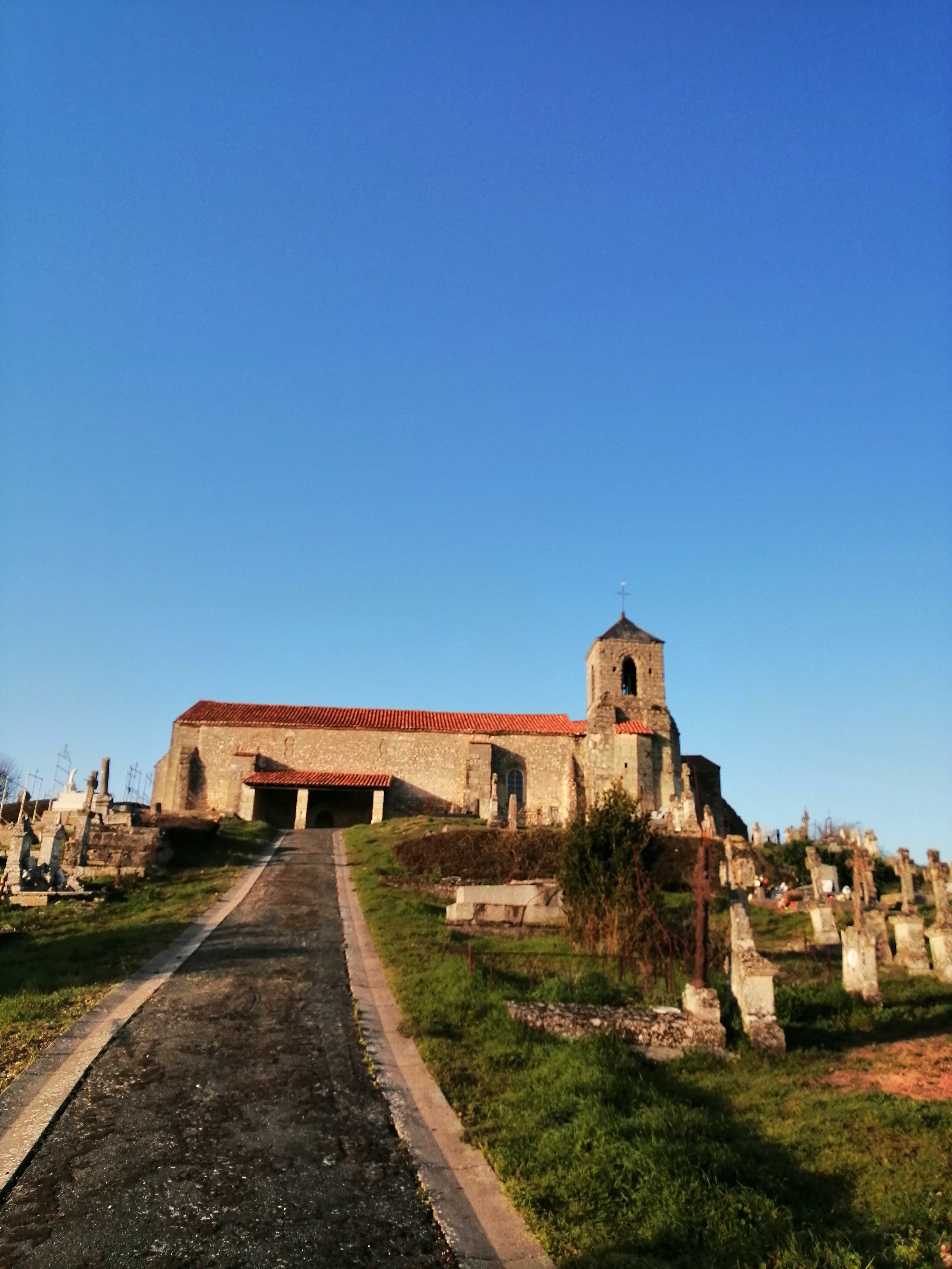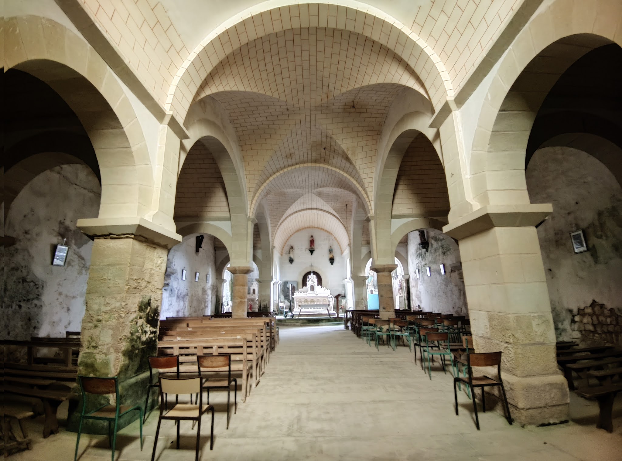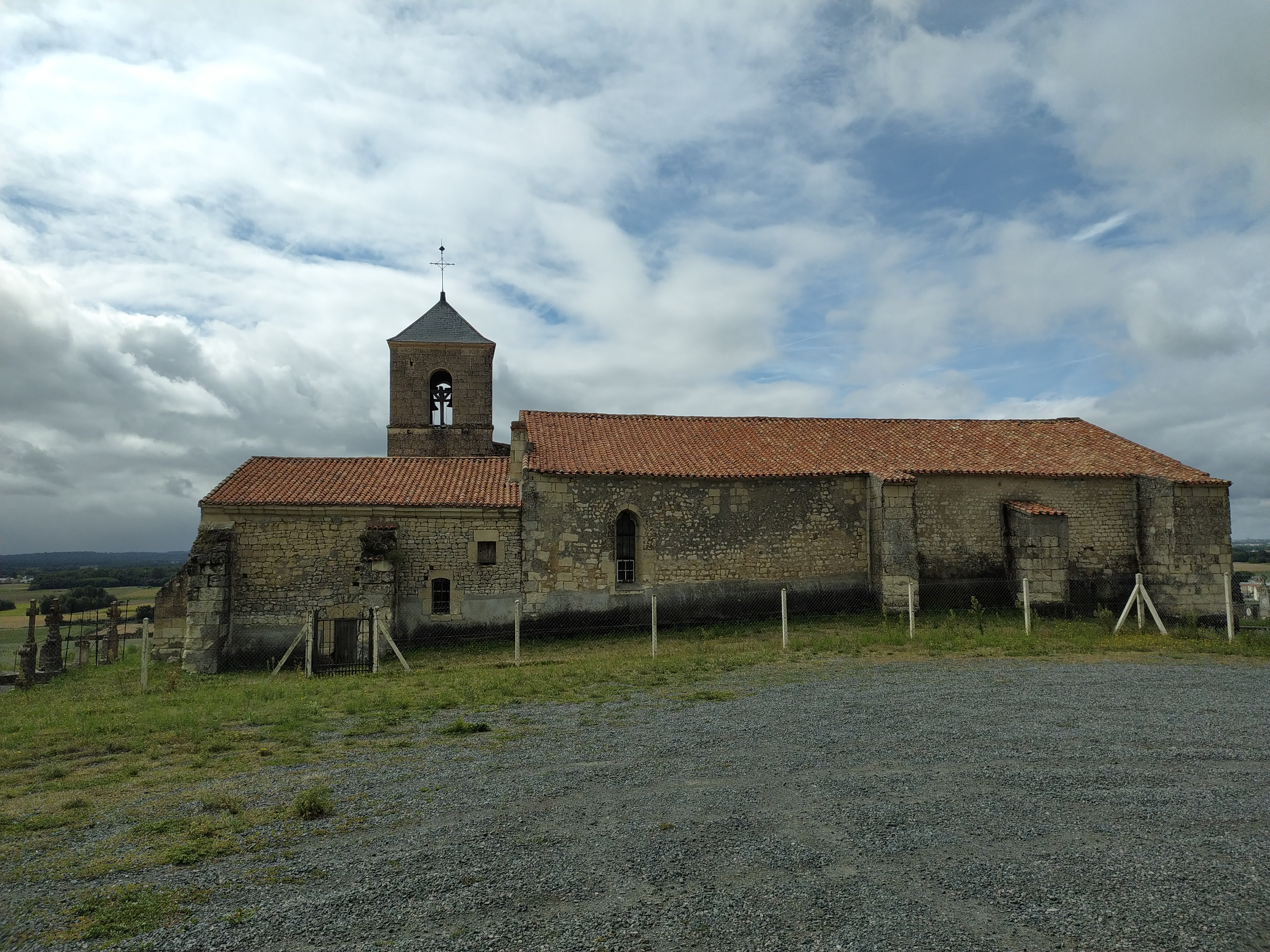 Chose fréquente dans la région de Thouars, l'église est éloignée du village, placée en hauteur au milieu du cimetière. Le panorama est superbe, le lieu figurait sur les chemins de Compostelle, l'église dépendait de l'Abbaye Saint-Martin de Tours. Construite au début du 11ème siècle, cette église intéressera les passionnés de vieilles pierres ou les curieux. Pas d'installation électrique dans cet édifice qui semble avoir beaucoup souffert même si la façade Ouest a été rénovée. Au 19ème siècle, on installe un autel dans la dernière travée de la nef, et l'on condamne le chœur primitif. On pénètre dans ce dernier en poussant les portes situées derrière le maitre-autel actuel, c'est aussi par là que l'on accède au clocher. L'état de l'ancien chœur et du bas du clocher est dégradé, cela ressemble à un abandon qui annonce la ruine de cette partie de l'édifice. L'église est trop grande pour le village, sa dimension originale s'explique par son appartenance à une puissante abbaye. L'amputation du chœur primitif m'a choqué, mais les trois vaisseaux de la nef, leurs voûtes en berceaux et d'arrêtes offrent beaucoup d'authenticité à cette église millénaire. Il faut prendre les clés à la mairie, cette visite mérite le détour, c'est un joli voyage dans le temps.