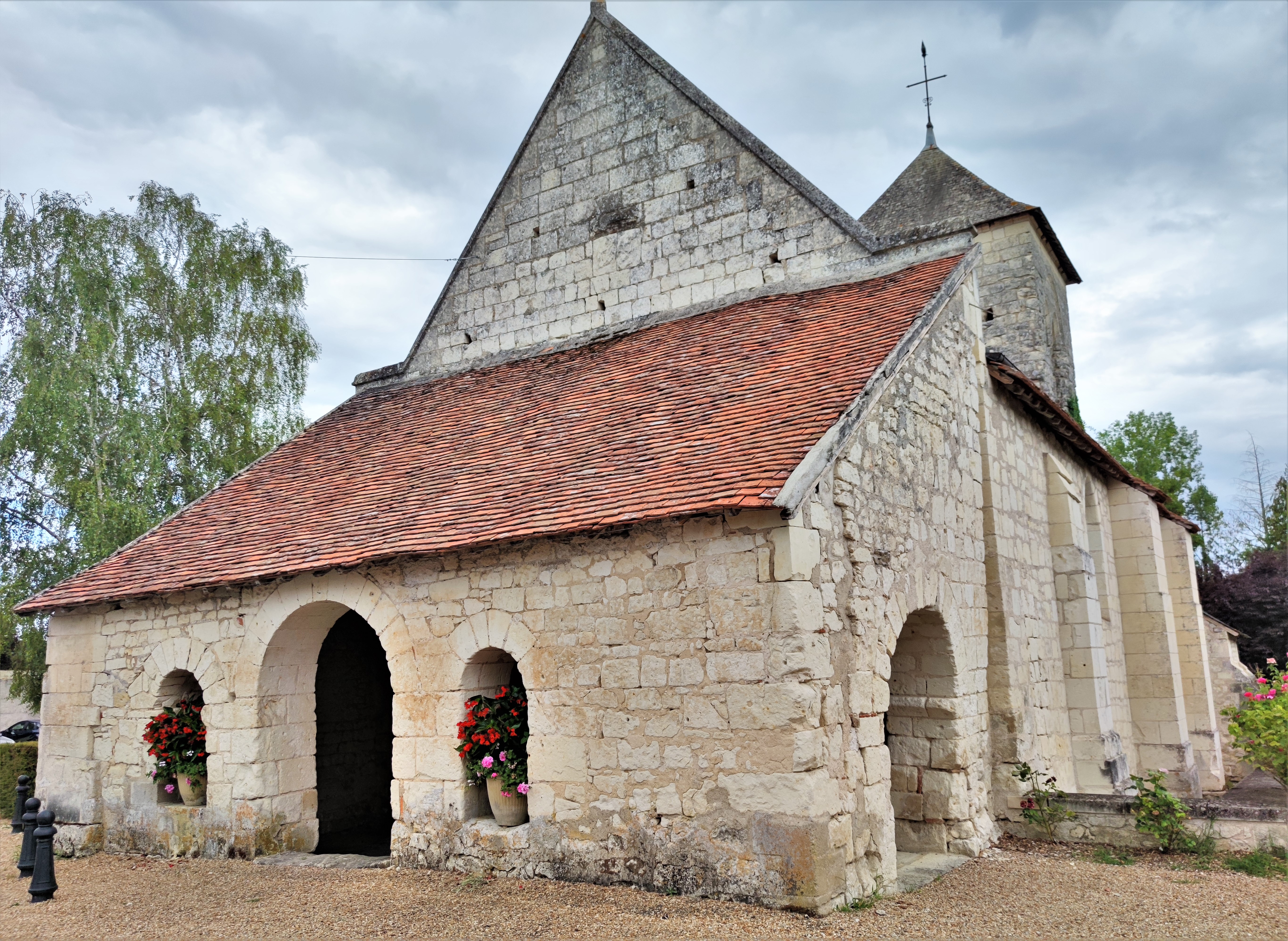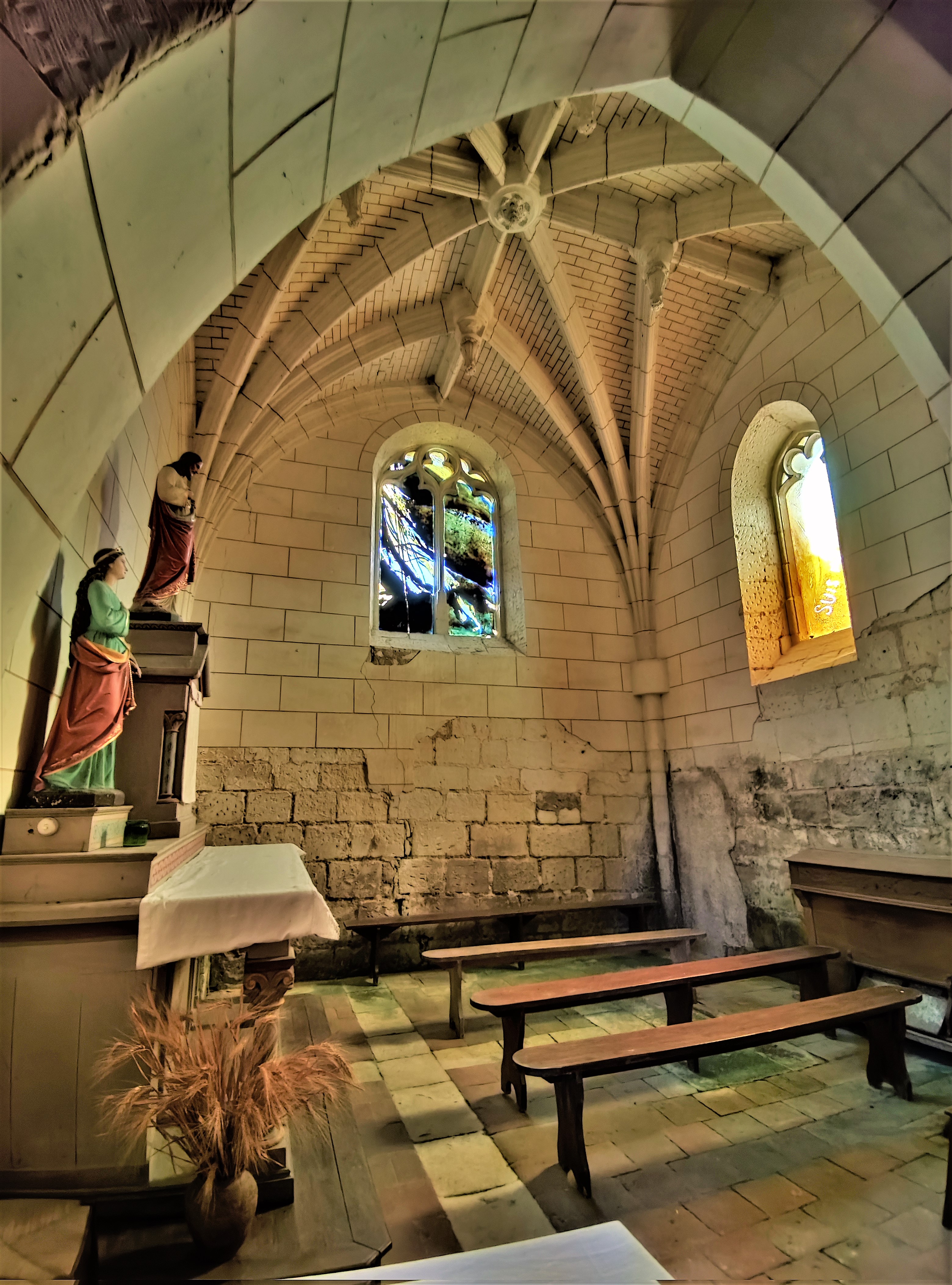 Église du 12ème, la galerie devant l'entrée invite à la rencontre, les vitraux de Norbert Pagé sont de belles créations. Le portail s'ouvre sur une nef unique plafonnée depuis le 19ème d'un solide assemblage de lattes en bois. La travée sous clocher, voûtée en croisée d'ogives, prolonge la nef, le maître-autel y a été installé. Cette travée sous clocher est limitée à l'Est et à l'Ouest par de solides murs percés d'arches en berceaux brisés. Au Sud, elle s'ouvre sur la chapelle seigneuriale du 15ème, au Nord sur une chapelle renaissance du 16ème. Restaurée au 17ème, cette église est en bon état, elle était ouverte, je l'ai trouvée très accueillante. En 2003, Norbert Pagé (1938-2012) a créé les vitraux, réalisés par Hervé Debitus, Maître Verrier à Tours.