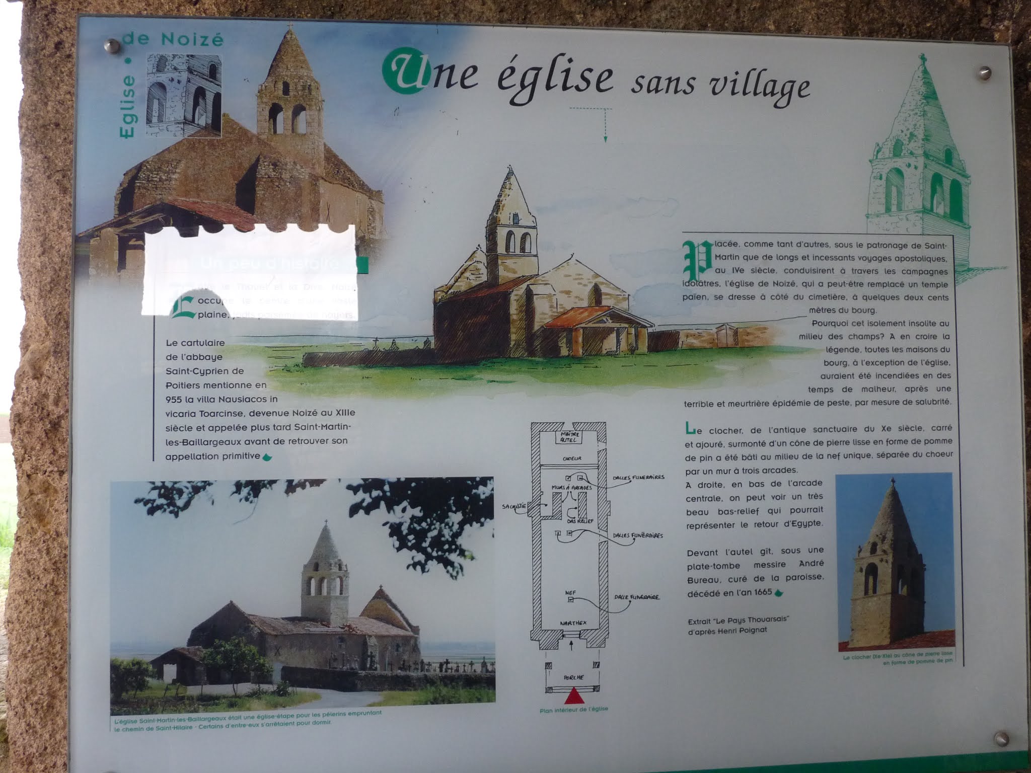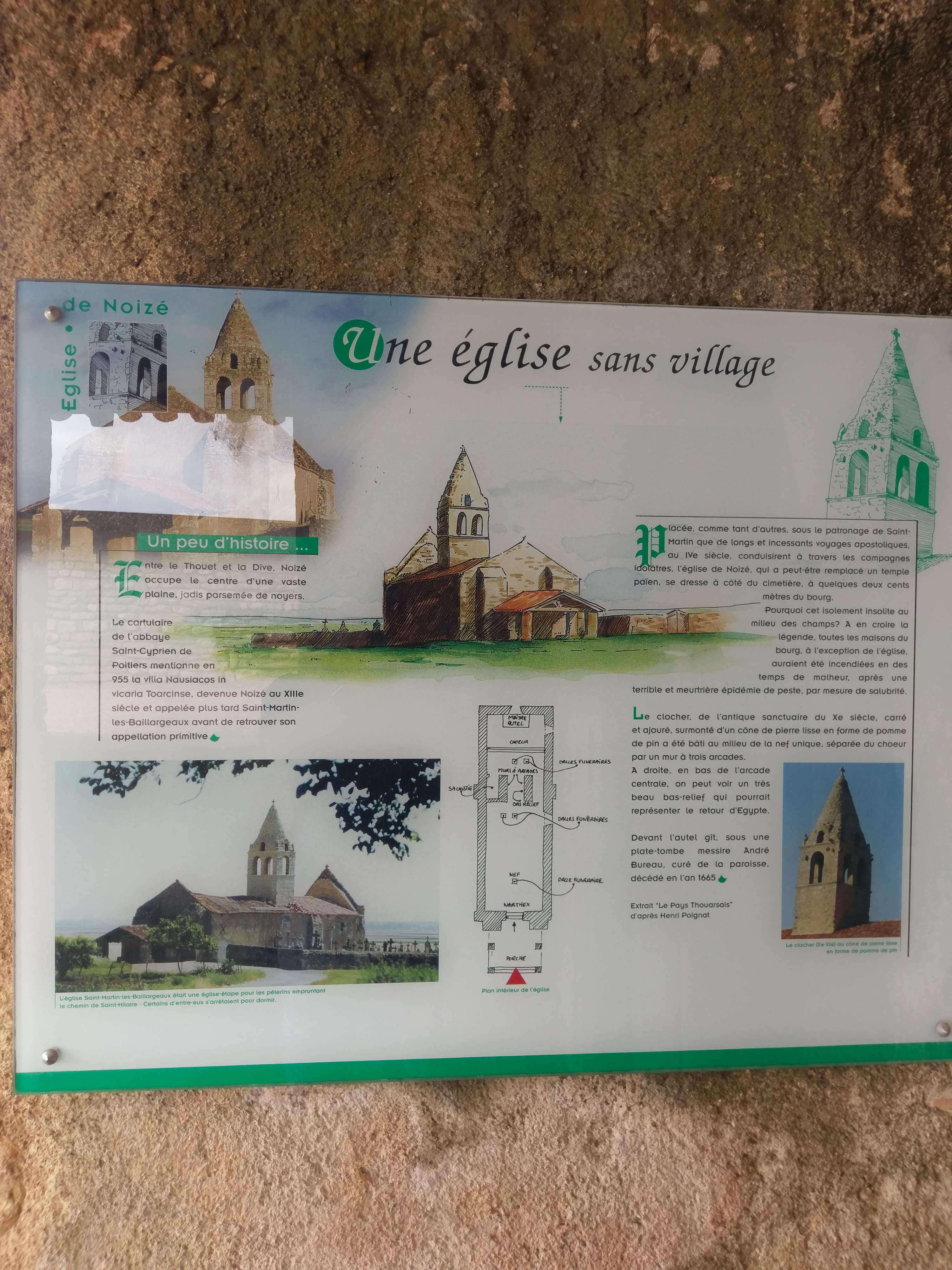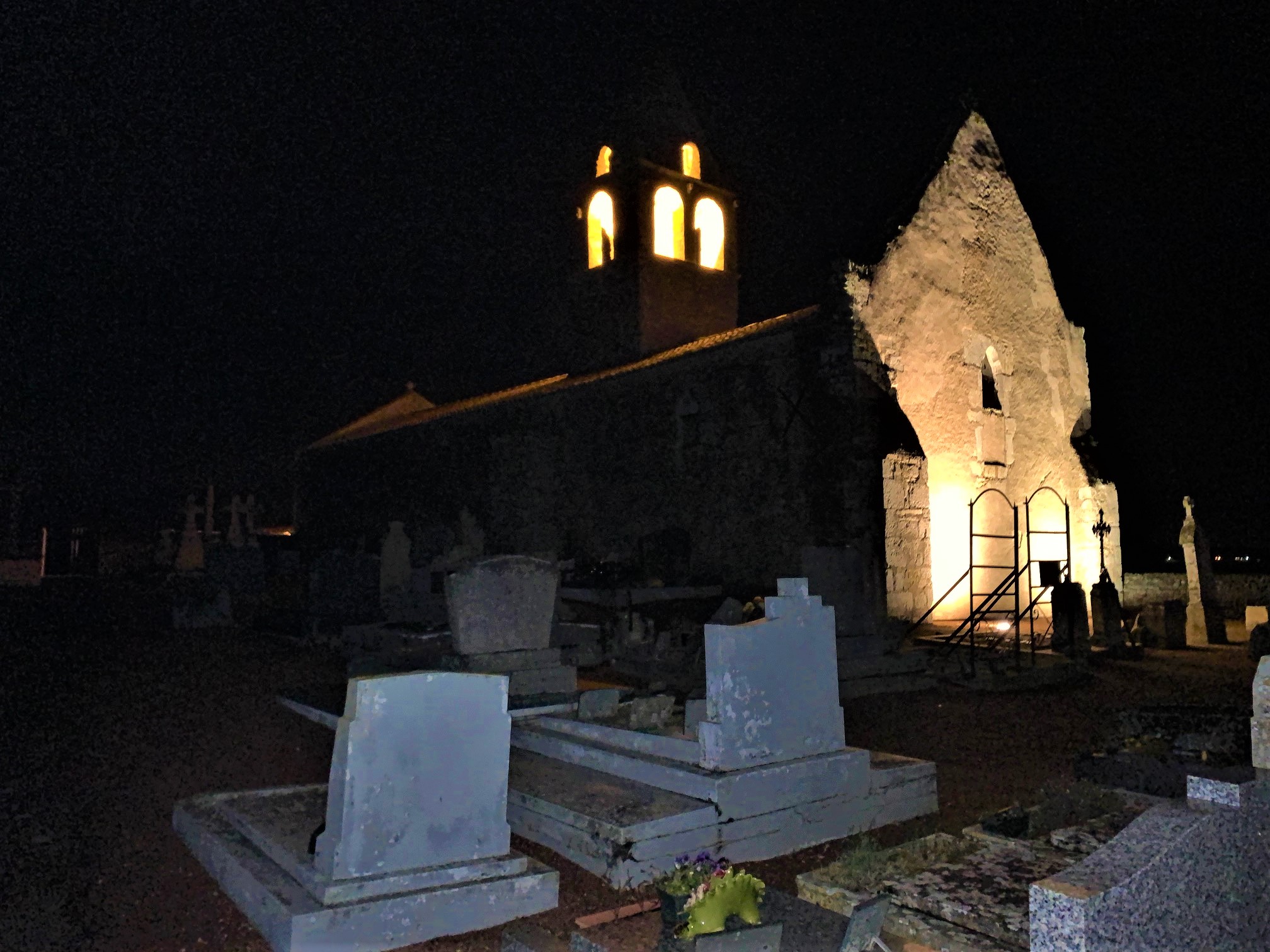 Une église sans village. Passant sur la départementale 37, j'ai remarqué cette petite église et son cimetière, loin de tout village ou habitation, posée au milieu de la plaine. Classée monument historique le 7 décembre 1976, son histoire m'a fasciné. Elle fut la seule survivante de l'incendie volontaire d'un village qui avait pour but d'éradiquer la peste noire responsable d'une épidémie. Interdite pendant 15 ans pour cause de vétusté, des habitants du village lui ont redonné vie, mais elle aurait encore besoin de restauration. Sa fragilité et sa simplicité sont vraiment touchantes. Construite il y a presque mille ans, son clocher daterait du XIIème siècle et sa cloche est toujours en place. La nef est séparée du chœur par un mur ouvert de deux passages en arcades et des dalles funéraires datées du 17ème et 18ème pavent le sol. Celle situé devant l'autel est la tombe de messire André Bureau, curé de la paroisse, décédé en l'an 1665. Fascinante et extraordinaire de simplicité. En passant la nuit du 31 janvier sur la départementale 37, j'ai découvert que cette église était éclairée la nuit. Merveilleuse vision de cet édifice si loin de tout, qui vous guide et vous attire comme un phare.