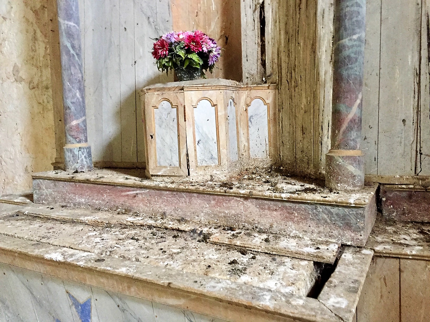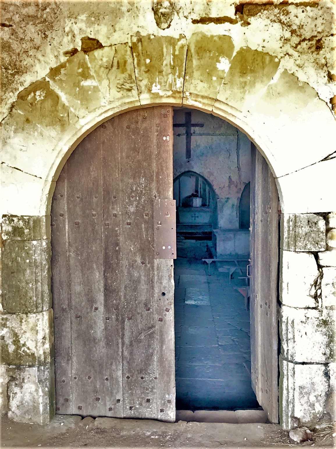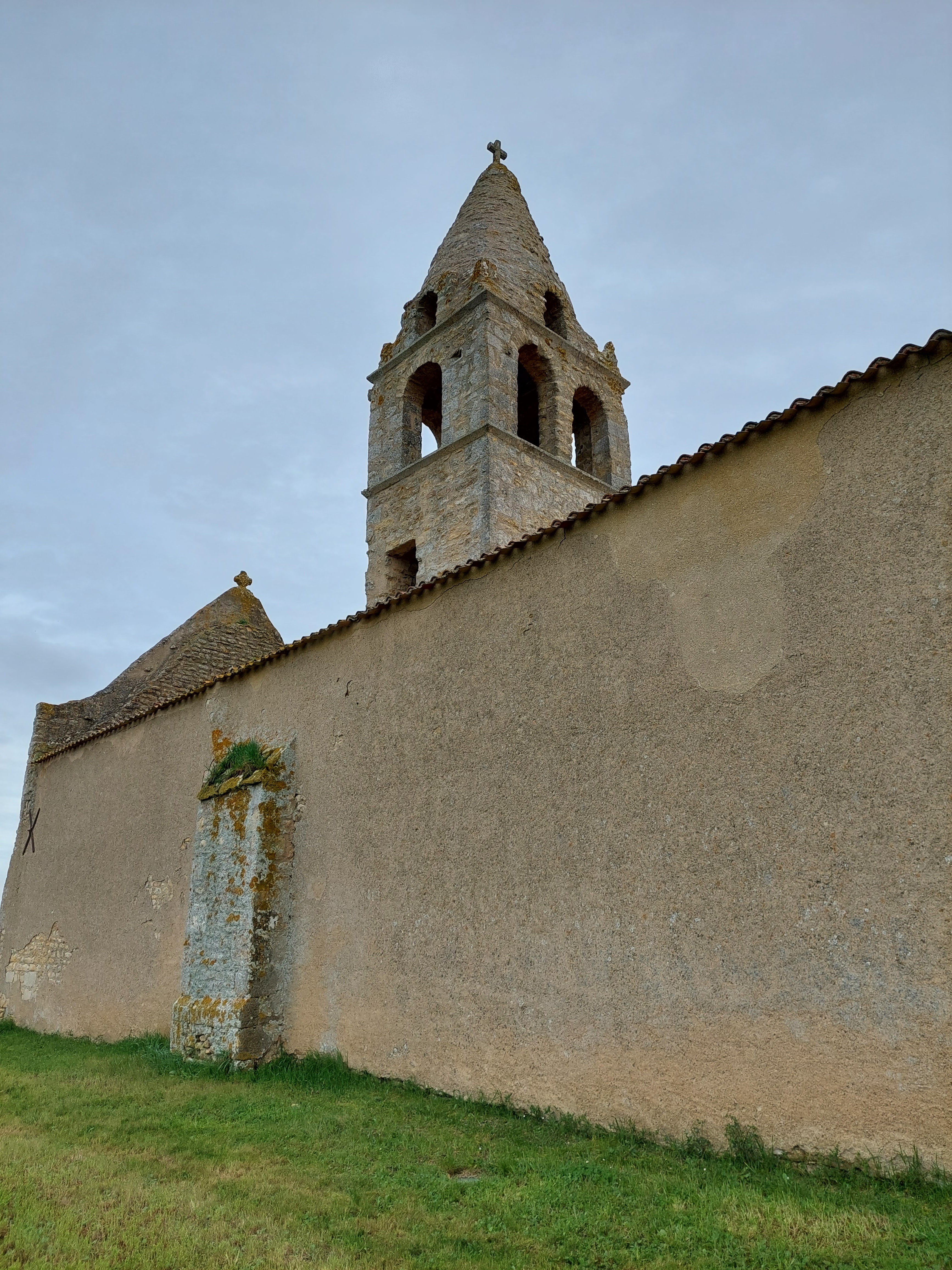 Étonnante église sans village, comme un film à la Alfred Hitchcock, elle s'impose aux milieu des champs comme le point du bout du monde, ou nul n'est aller plus loin... Un arbre qui ne s'est pas encore paré de sa verdure au loin, pourrait servir de perchoir aux oiseaux de mauvaise augure... Nous avons adoré cet endroit.