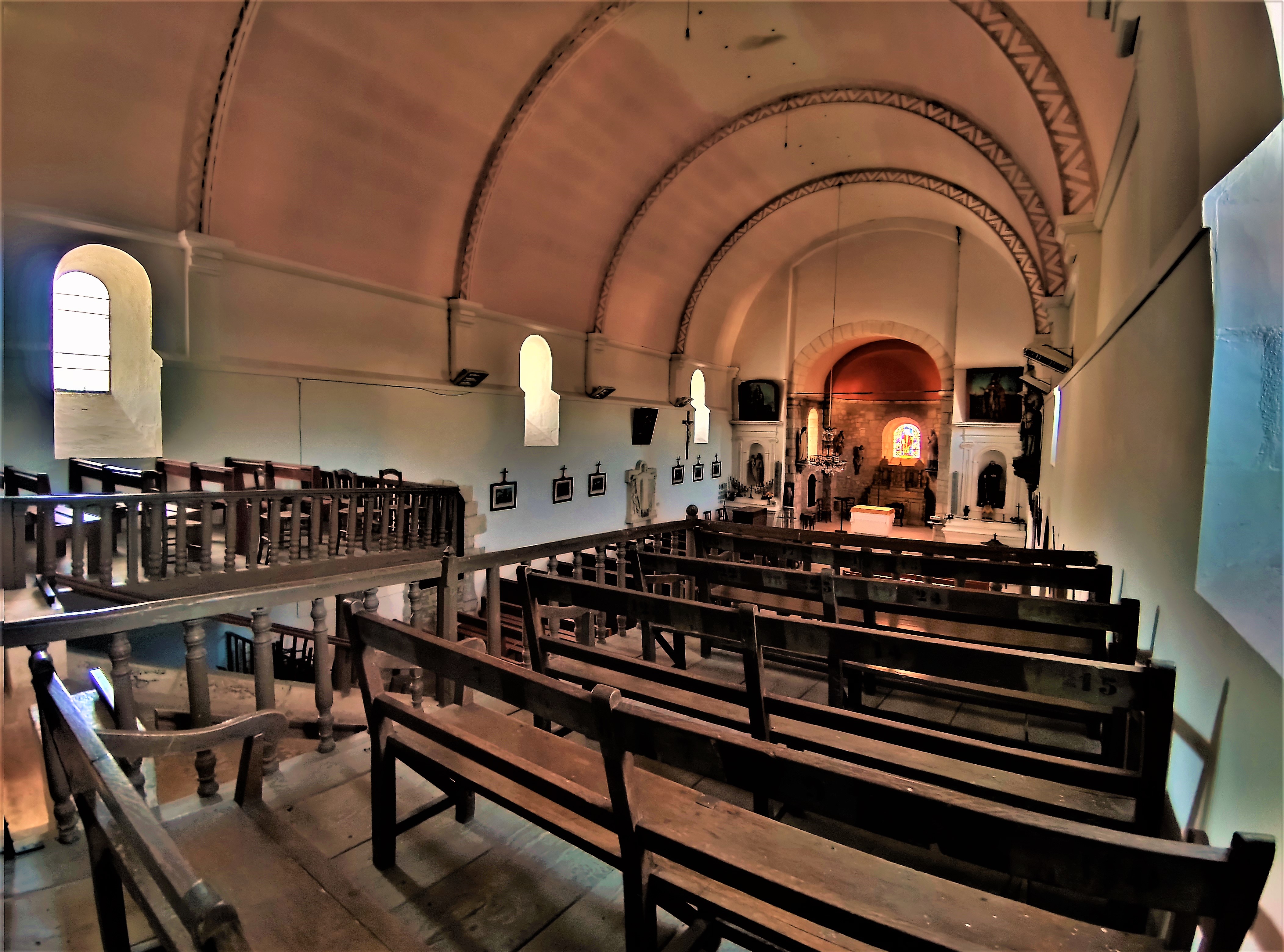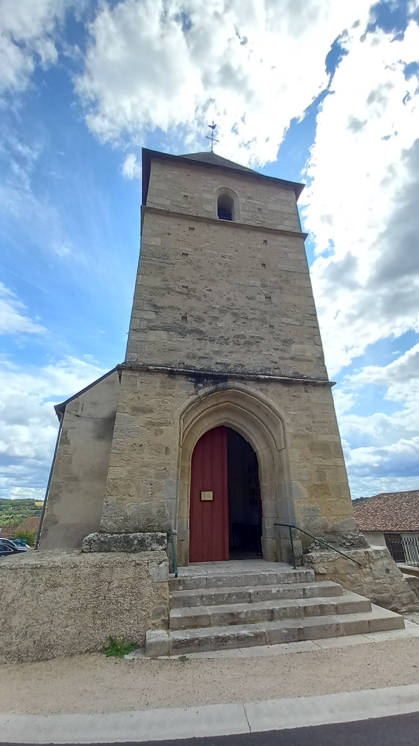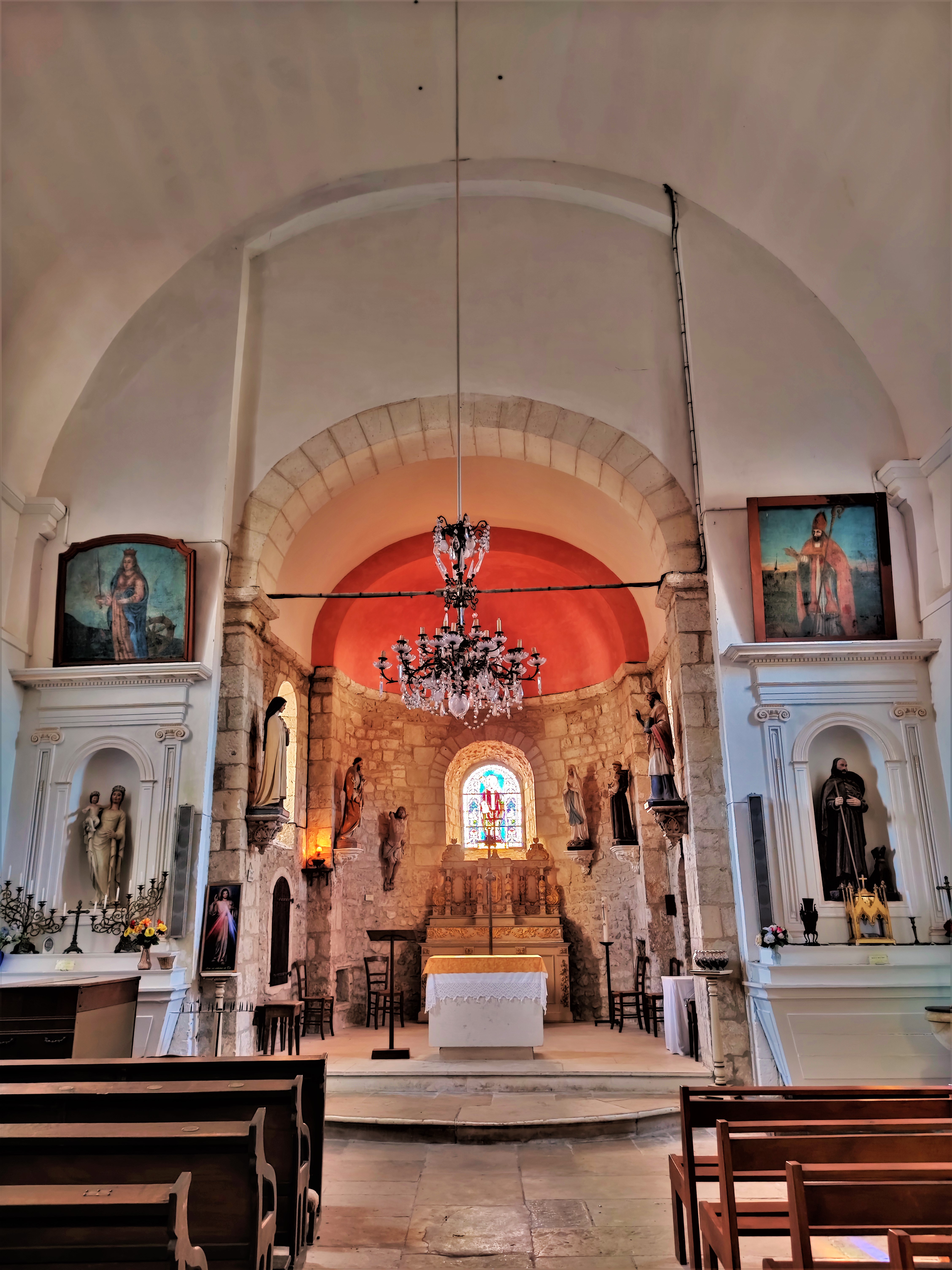 Une église du 11ème et 12ème, construite à flanc de coteau, ouverte et accueillante. On entre par un clocher-porche roman carré, couvert d'un toit à 4 pans, il faut gravir 4 marches pour accéder au portail ogival du 15ème. La partie basse du clocher fait narthex, elle s'ouvre sur la nef à vaisseau unique par un portail roman. Une échelle en bois permet l'accès à la salle des 2 cloches installées au 19ème. L'entrée de la nef est originale, il faut descendre 13 marches pour y accéder, seules les femmes étaient contraintes à cet exercice. En effet, réservées aux hommes, 2 tribunes sont placées de chaque côté de l'escalier, leurs accès sont situés au niveau du palier supérieur. 5 travées marquées par des arcs doubleaux sont percées de 3 ouvertures de chaque côté. La fausse voûte en berceau du 19ème préserve l'allure romane, sans le cachet d'une voûte en pierres. L'arc triomphal qui marque l'entrée du chœur est encadré par 2 autels avec retables, niches et statues, dont une vierge à l'enfant du 16ème. Au-dessus des retables sont placés des tableaux dont une représentation de Saint-Martin du 18ème. Le chœur s'ouvre sur l'abside voûtée en demi-coupole du sanctuaire. La crypte sur laquelle il fut construit a disparu au 19ème. Un christ amputé de ses bras à la révolution est placé à côté du maître-autel. Derrière ce dernier, la verrière représente Saint-Martin, ou plutôt nitraM-tniaS, comme écrit sur ce vitrail, posé derrière-devant par erreur. Une église romane typique et charmante, un mobilier et une statuaire intéressante, un endroit bien agréable à visiter, merci à la commune de la garder accessible. Cela marque l'intérêt des citoyens pour leur patrimoine bâti et des paroissiens pour leur église. Lieux de célébration, les églises médiévales étaient aussi lieux de débats et de décisions.