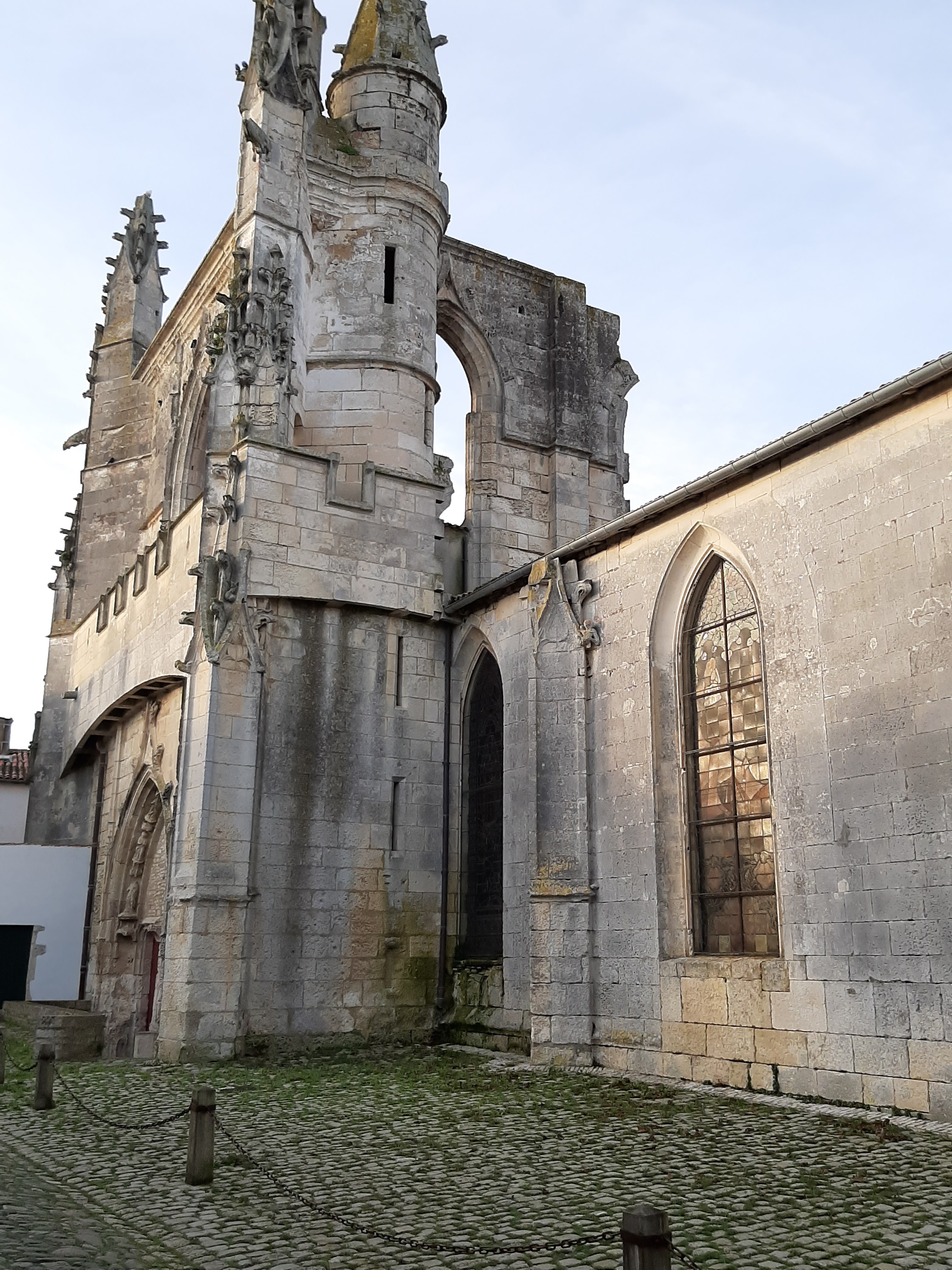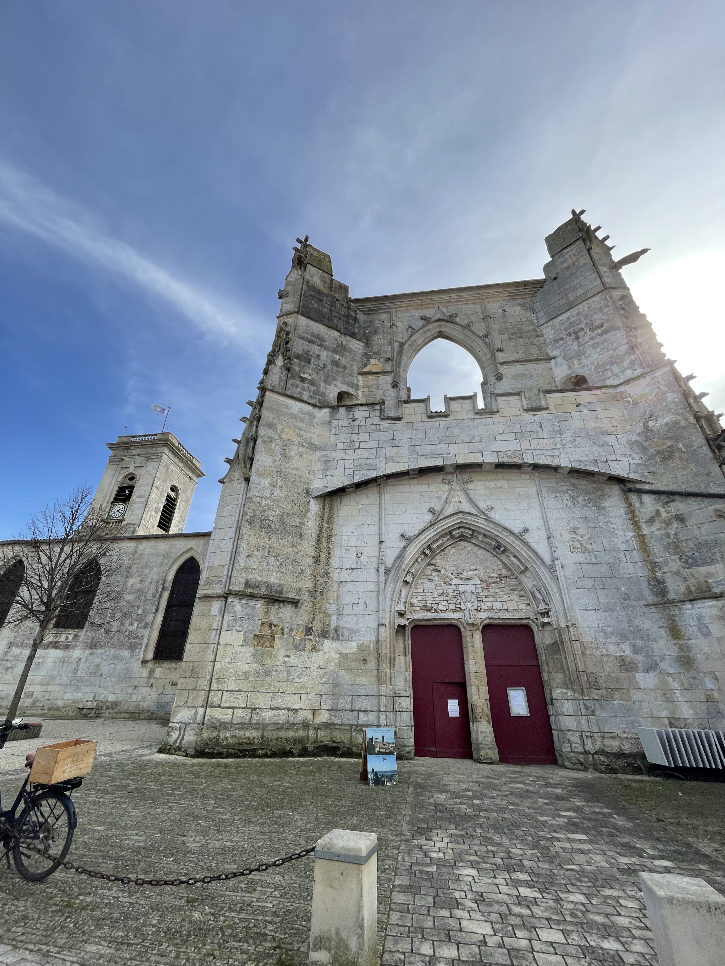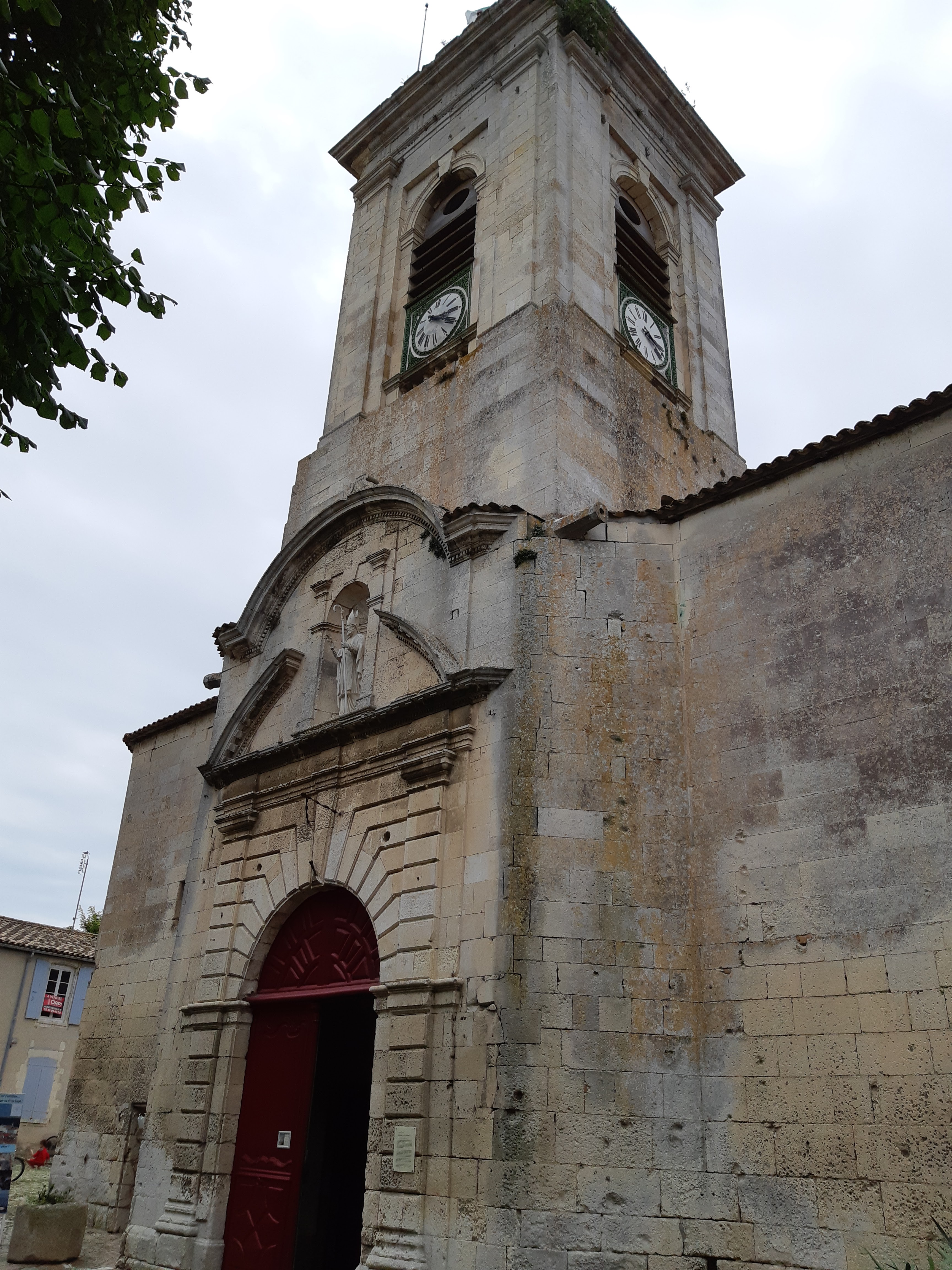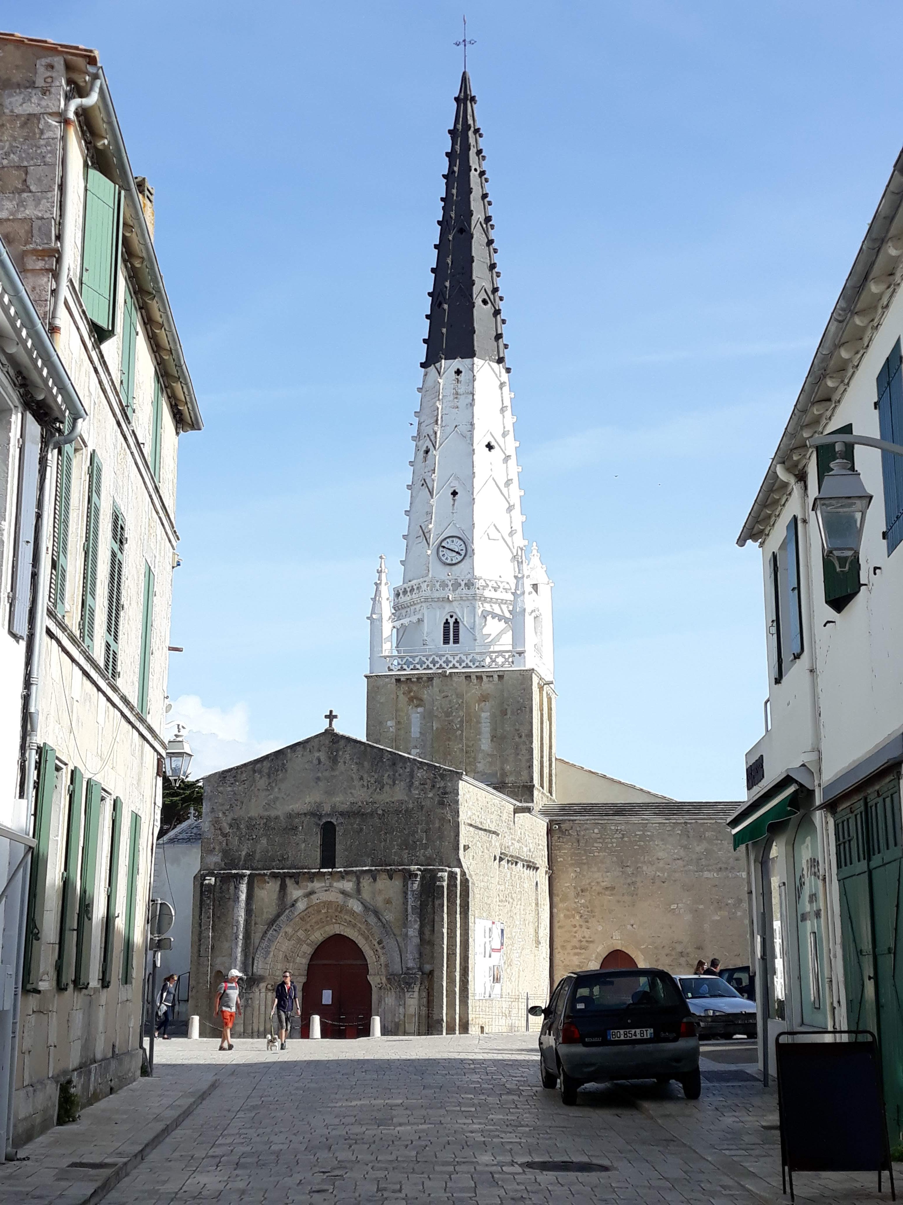 Cette église du XVIIIème siècle conserve les vestiges des deux églises précédentes telle une poupée russe. Celle ci est dominée par les ruines plus imposante de l'édifice gothique du XIVème siècle détruite lors des Guerres de Religion en 1586. Subsistent aujourd'hui une partie du mur du transept, un fenêtre gothique murée et la chapelle du chœur actuel qui autrefois était la nef. Dans ces ruines fut élevée 1629 un nouveau lieu de culte plus petit suivant l’orientation de l'ancien édifice. Cette église bombardée par une flotte Anglo-Hollandaise en 1696 lors du siège de la citadelle de Saint Martin en Ré, verra son clocher s’effondrer sur la nef en 1774. De cet édifice ne subsistent que les colonnes écrêtées et les parties hautes des bas-côtés de la nef. L'église actuelle date donc de cette seconde reconstruction dont le clocher fut construit à l'inverse des deux précédents. Il est possible contre paiement de monter sur ce dernier qui sert d'observatoire, offrant ainsi un point de vue exceptionnel sur la ville et ses alentours notamment lors du coucher du soleil.