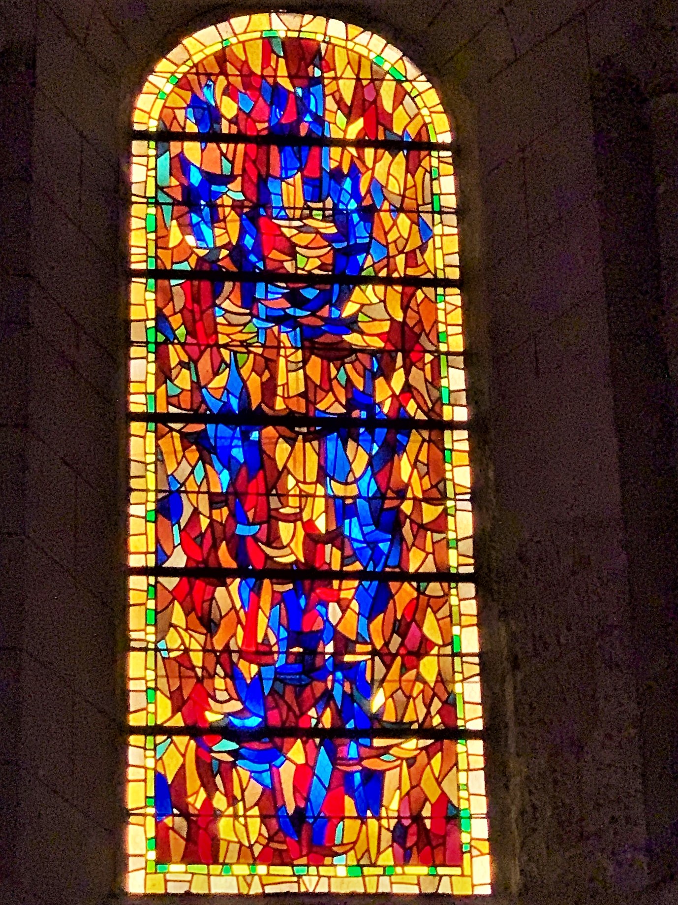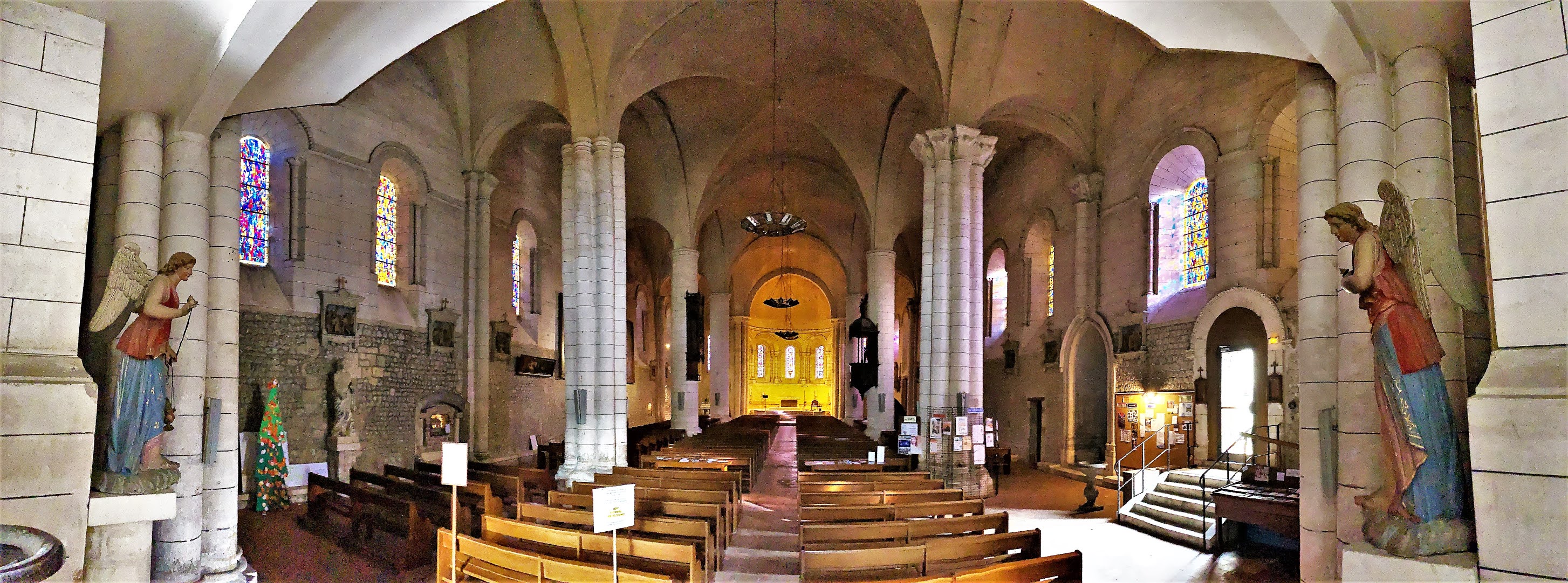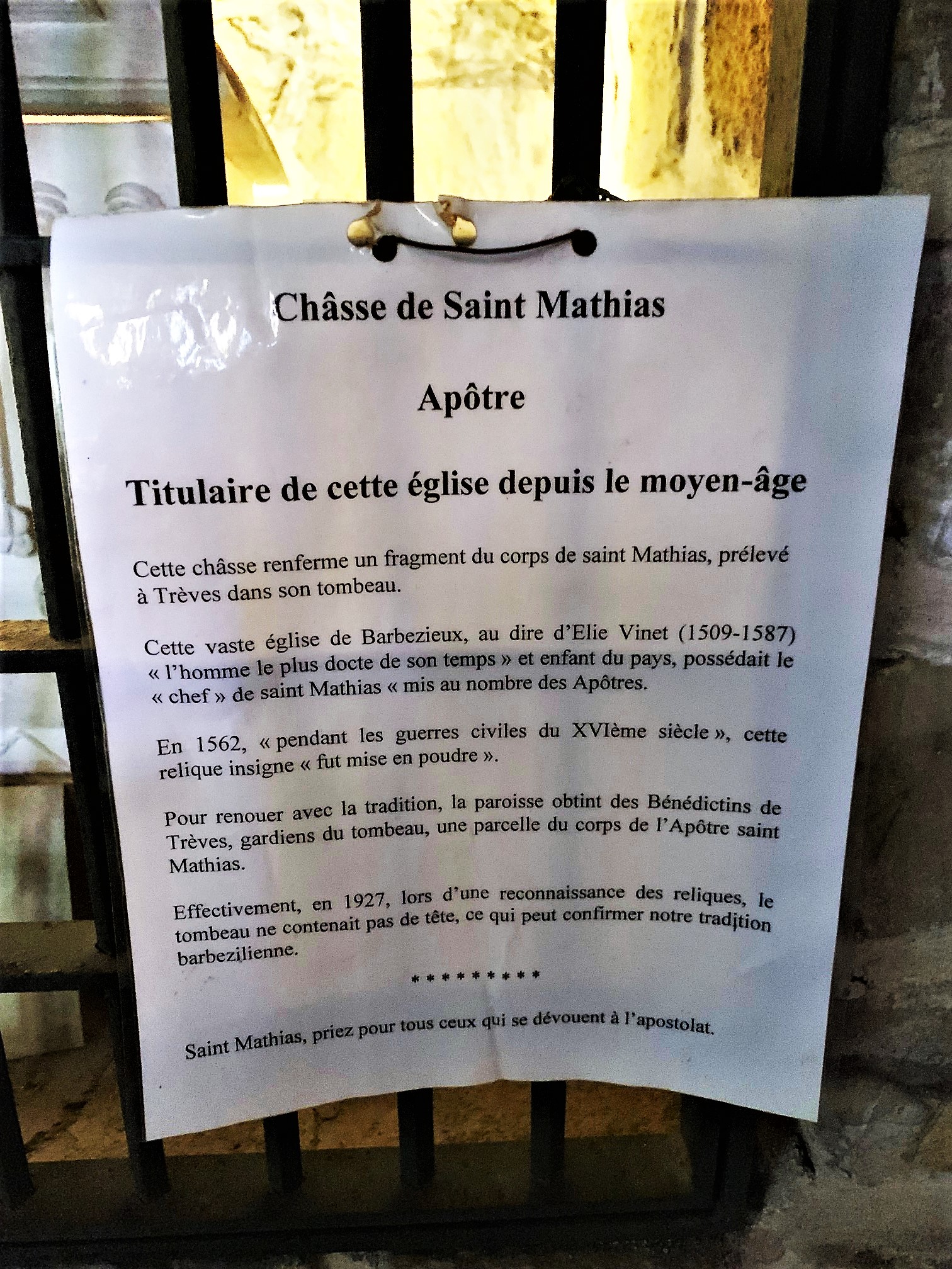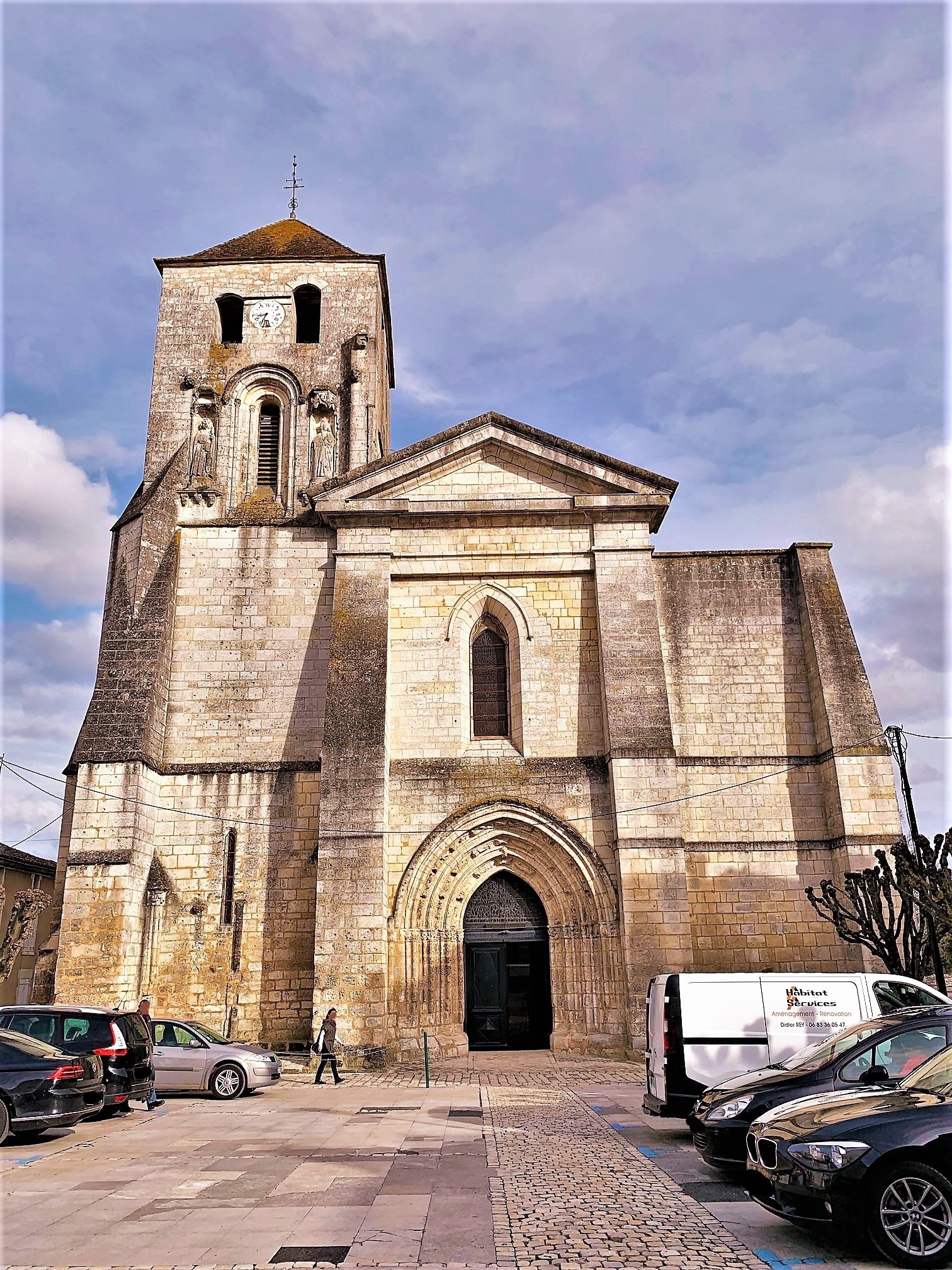 Magnifique église ouverte, une visite s'impose. L'église primitive Saint-Mathias fut construite dans la première moitié du 11ème siècle, elle dépendait du prieuré Notre-Dame. La raison du choix Saint-Mathias comme titulaire et pas Notre-Dame était la présence de reliques du Saint Apôtre, au sein desquelles son crane (Mathias fut celui qui remplaça Juda parmi les Apôtres) Au 12ème siècle, l'église fut reconstruite, les parties les plus anciennes (peu nombreuses) datent de cette époque. L'église Saint-Mathias fut détruite en grande partie durant la guerre de cent ans (1337 – 1453). La reconstruction se fit au 15ème siècle, le clocher et le porche de la façade Ouest restent de ce nouvel édifice. Puis arrive le 16ème siècle et son cortège de conflits meurtriers entre les catholiques et les protestants. Ces derniers, au cours de deux assauts, mirent en ruines l'église Saint-Mathias, voûtes et toitures furent détruites. Plus d'un siècle passa, l'édifice resta en l'état, se dégradant de plus en plus. Au 17ème siècle, une reconstruction fut engagée par le seigneur de Barbezieux en 1680. Au 18ème, des chantiers de restaurations ou d'entretiens eurent lieu. Au 19ème siècle, les voûtes furent refaites, une abside remplaça le chevet plat, un fronton classique fut ajouté à la façade. Au 20ème siècle, une mise en valeur fut réalisée par creusement du sol pour retrouver le niveau initial. De nouveaux vitraux furent créés et posés. Magnifique église ouverte à la visite, ce fut une belle découverte en 2018 et une redécouverte en juin 2021. De très belles choses sont à découvrir dans cet édifice inscrit en totalité par les M.H. depuis novembre 1948. Une visite s'impose, qui peut se prolonger par la découverte de l'église de Saint-Hilaire à Saint-Hilaire.