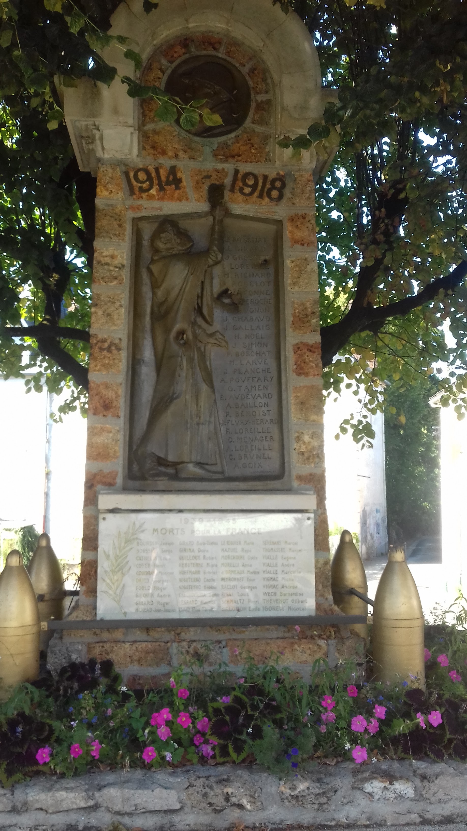 Une belle ancienne église avec sur la place un monument aux morts.
