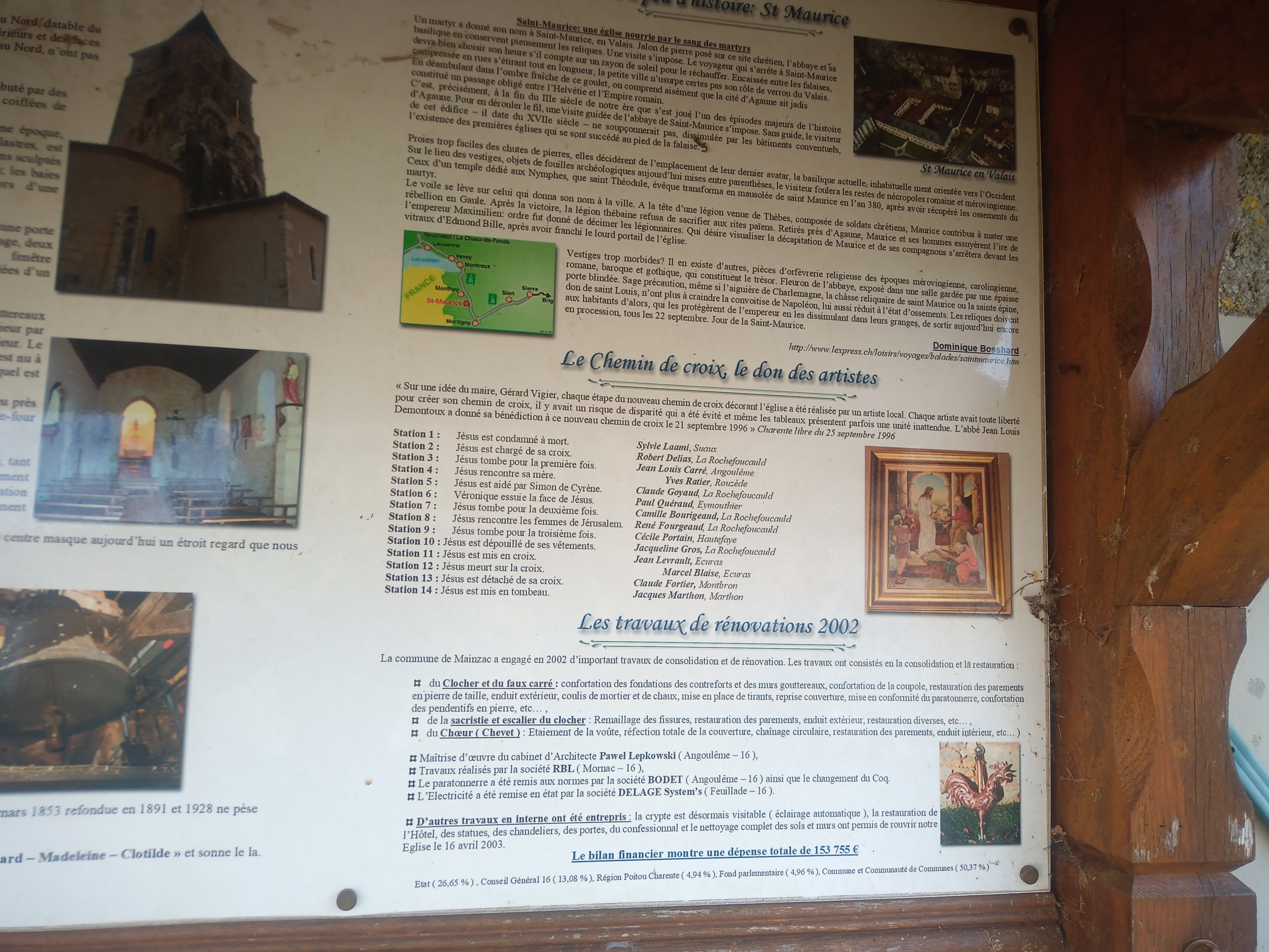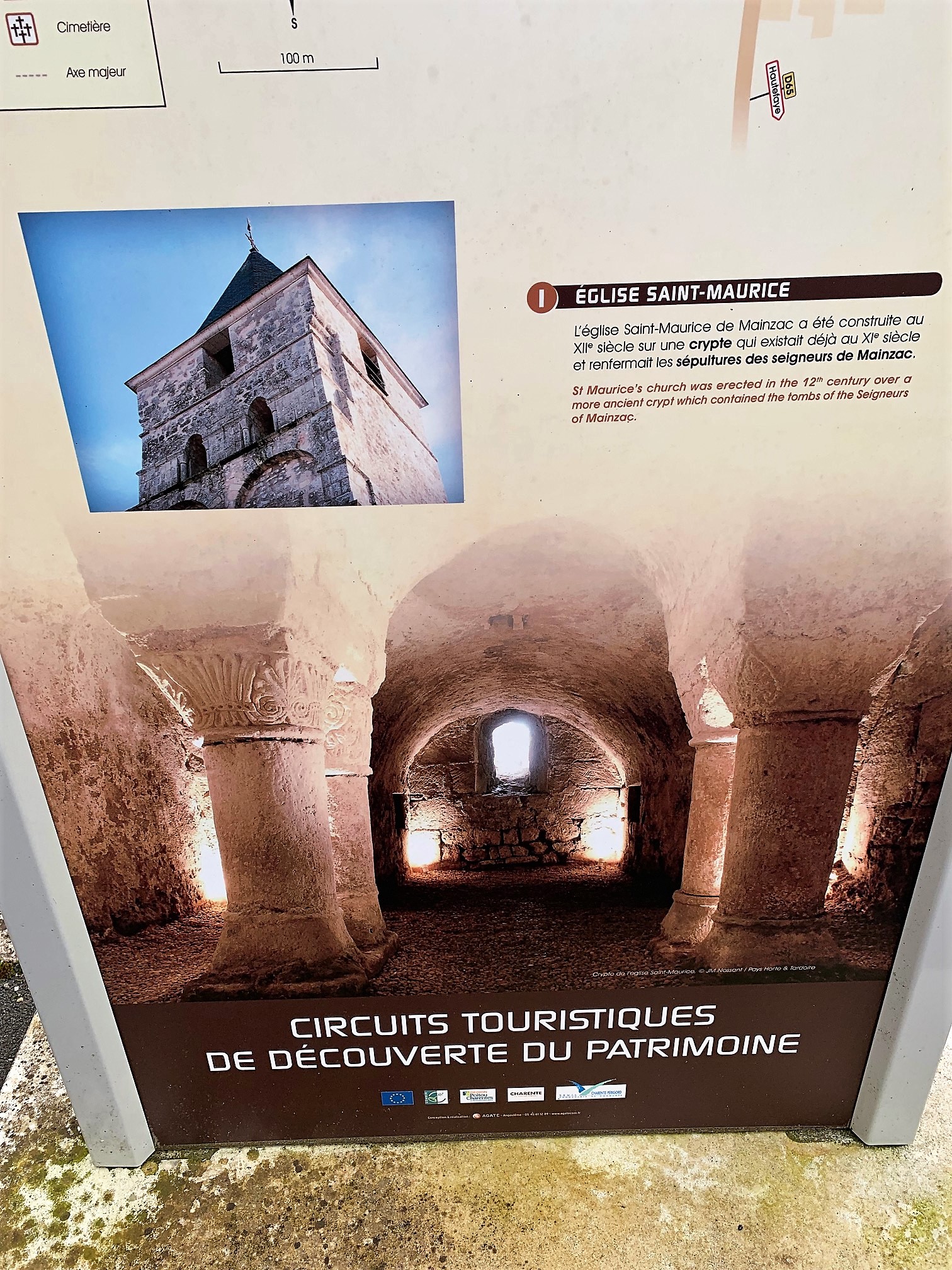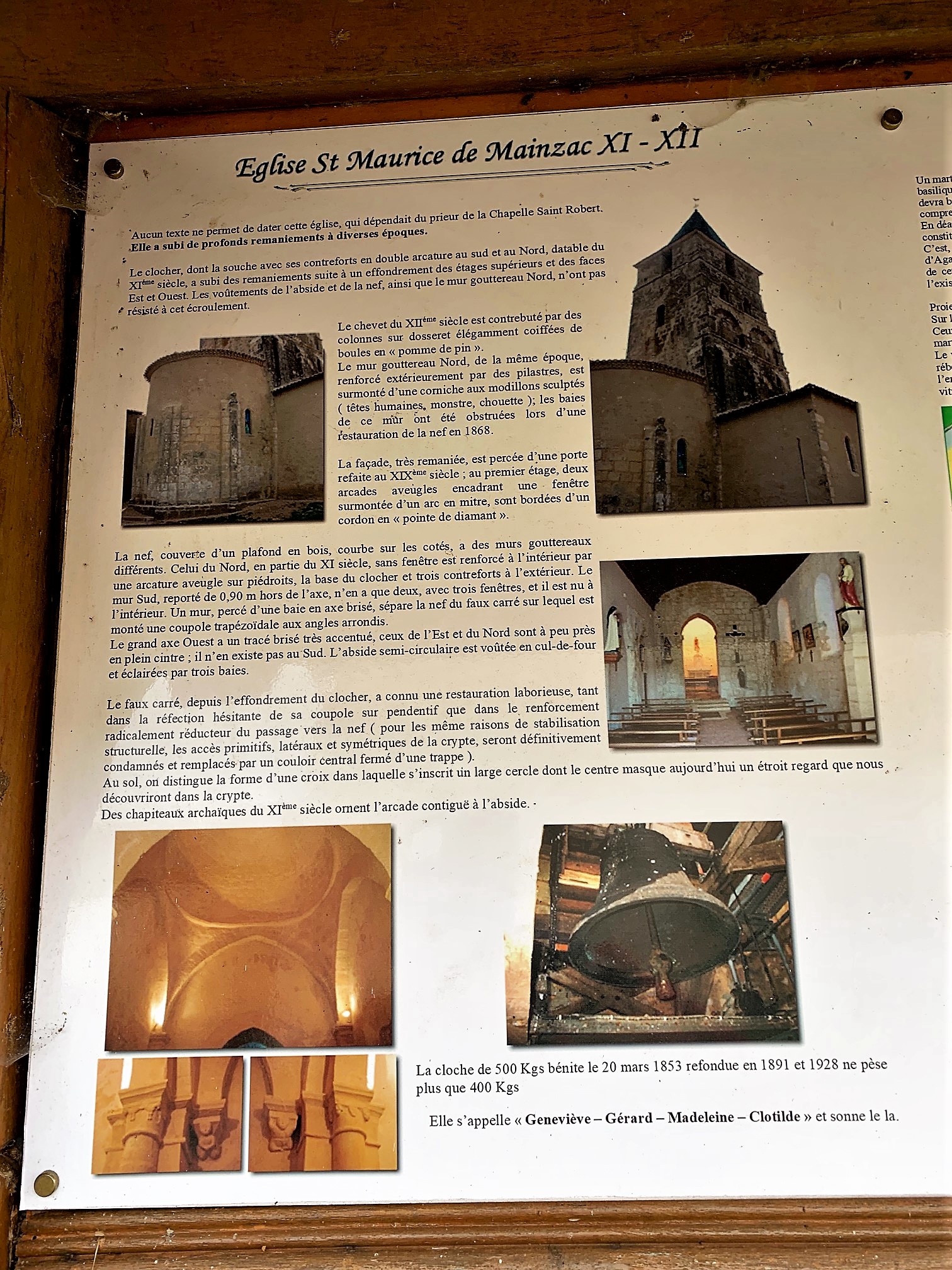 Une église hors du temps et une crypte du Xè-XIè siècles Cette église construite à partir du 11ème au dessus d'une crypte déjà existante a été souvent remaniée au cours des siècles. Si certaines modifications sont difficiles à dater, le charme de cette église agit. Les modillons, les décors sculptés, le chemin de croix, les peintures qui décorent la nef, l'architecture originale, la crypte millénaire en état remarquable, tous ces éléments bénéficient d'une magnifique mise en valeur par la petite commune de Mainzac. j'ai été vraiment enthousiasmé par cette visite. Il faut passer à la mairie située à côté de l'église pour prendre les clefs. Le N° de téléphone de la mairie est celui indiqué sur la page de l'église Saint-Maurice (il peut vous être utile pour connaître les horaires d'ouverture).