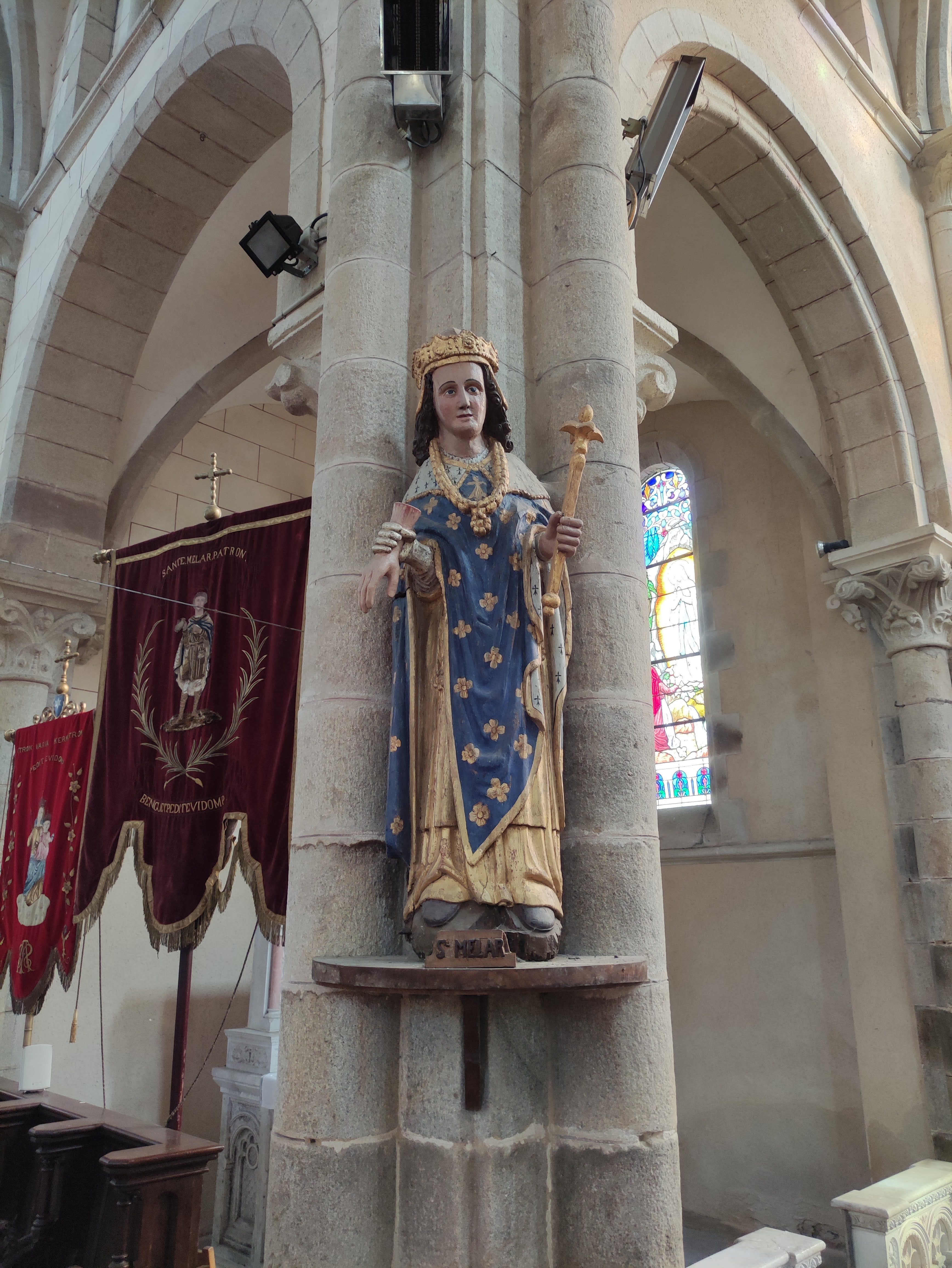 Cette église possède en sous-sol une crypte d'époque carolingienne unique en son genre. Il y a un parcours historique bien réalisé à l'intérieur de l'église dédié à Saint-Melard qui est un enfant martyr de la Bretagne.