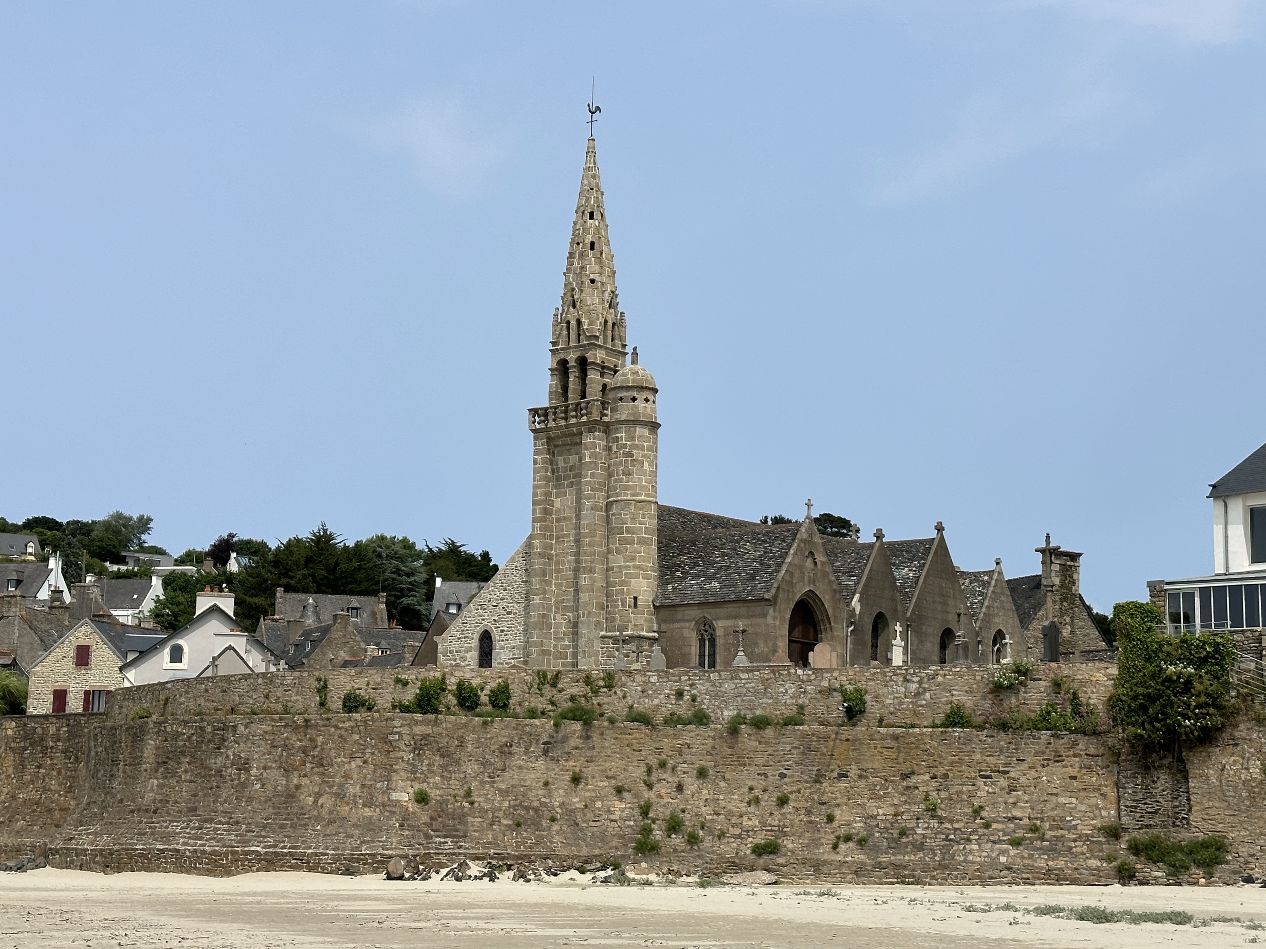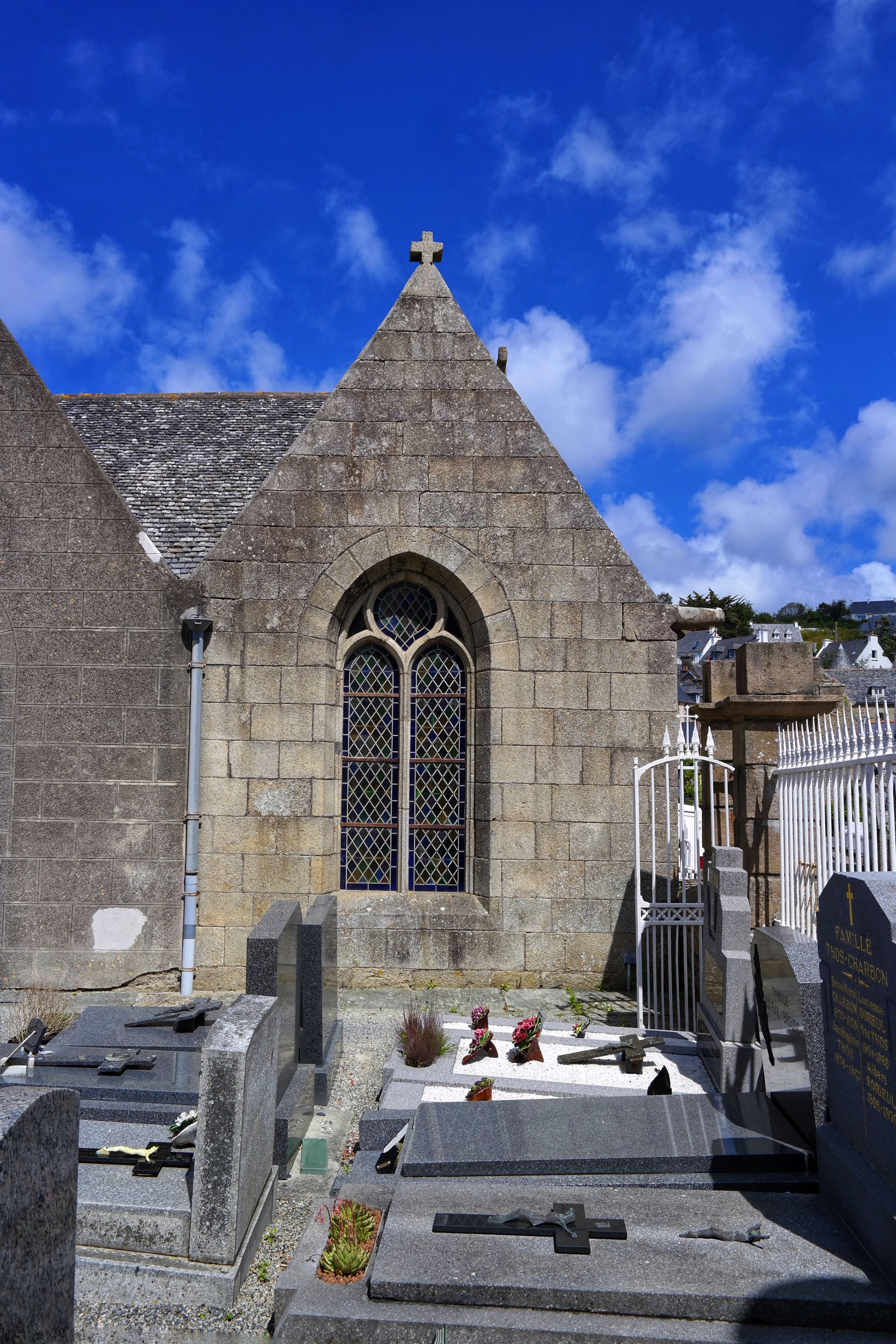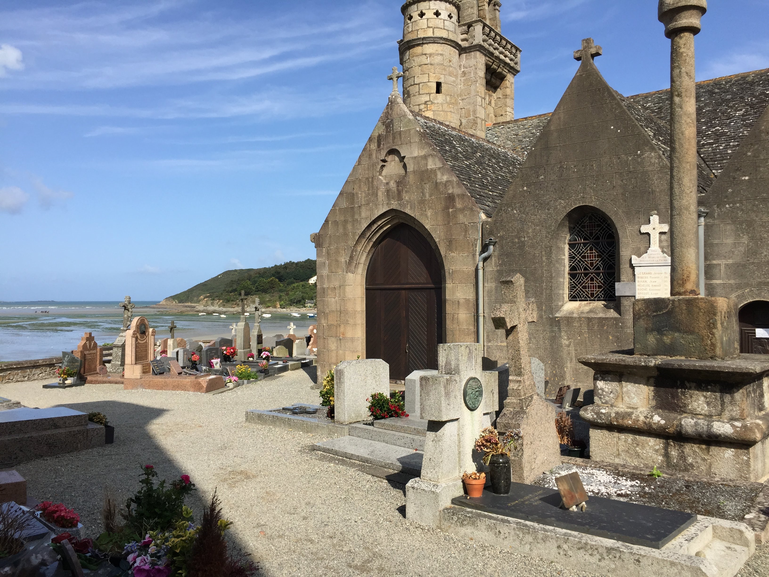 Église caractéristique avec cimetière attenant face à la mer.