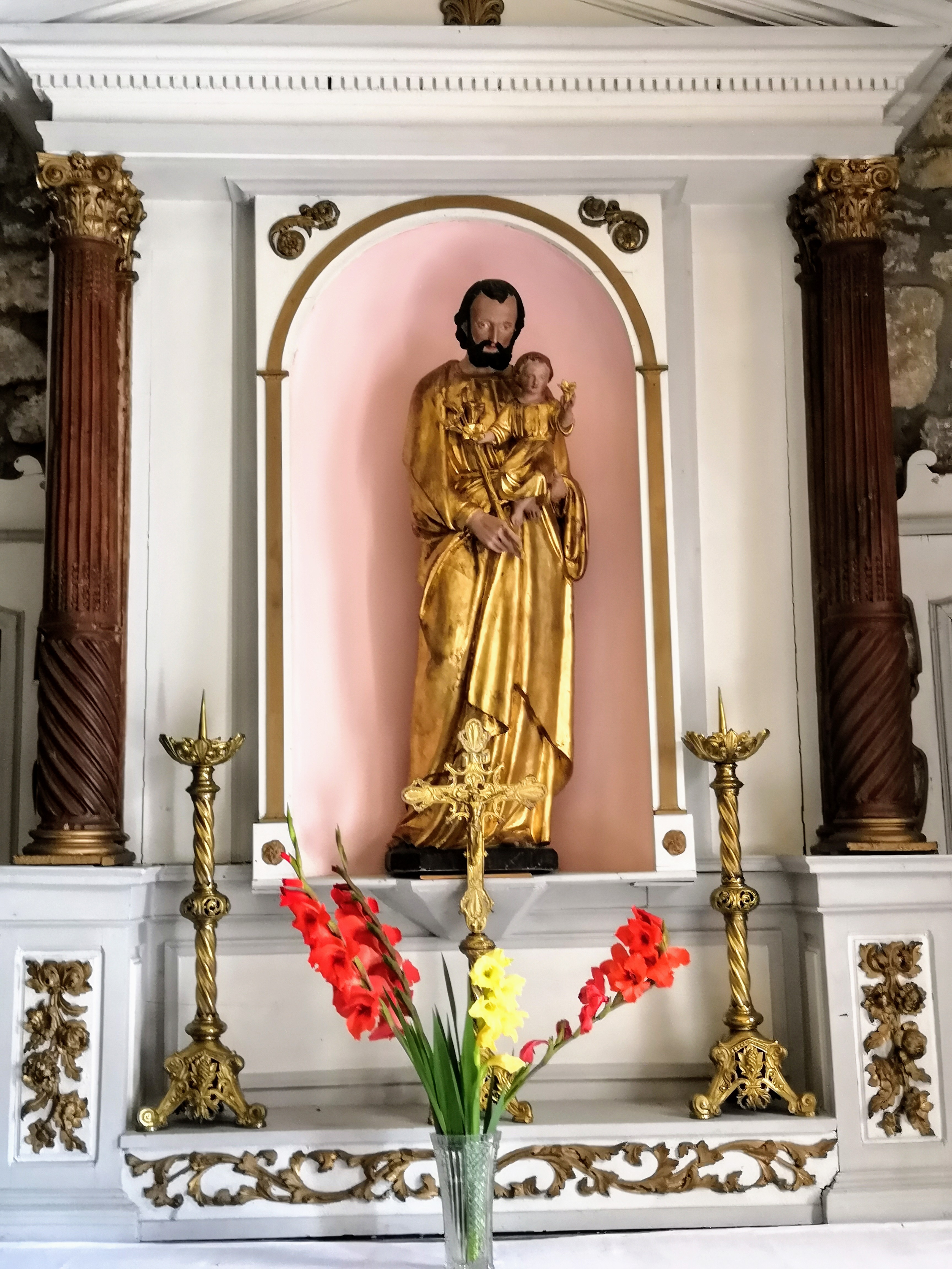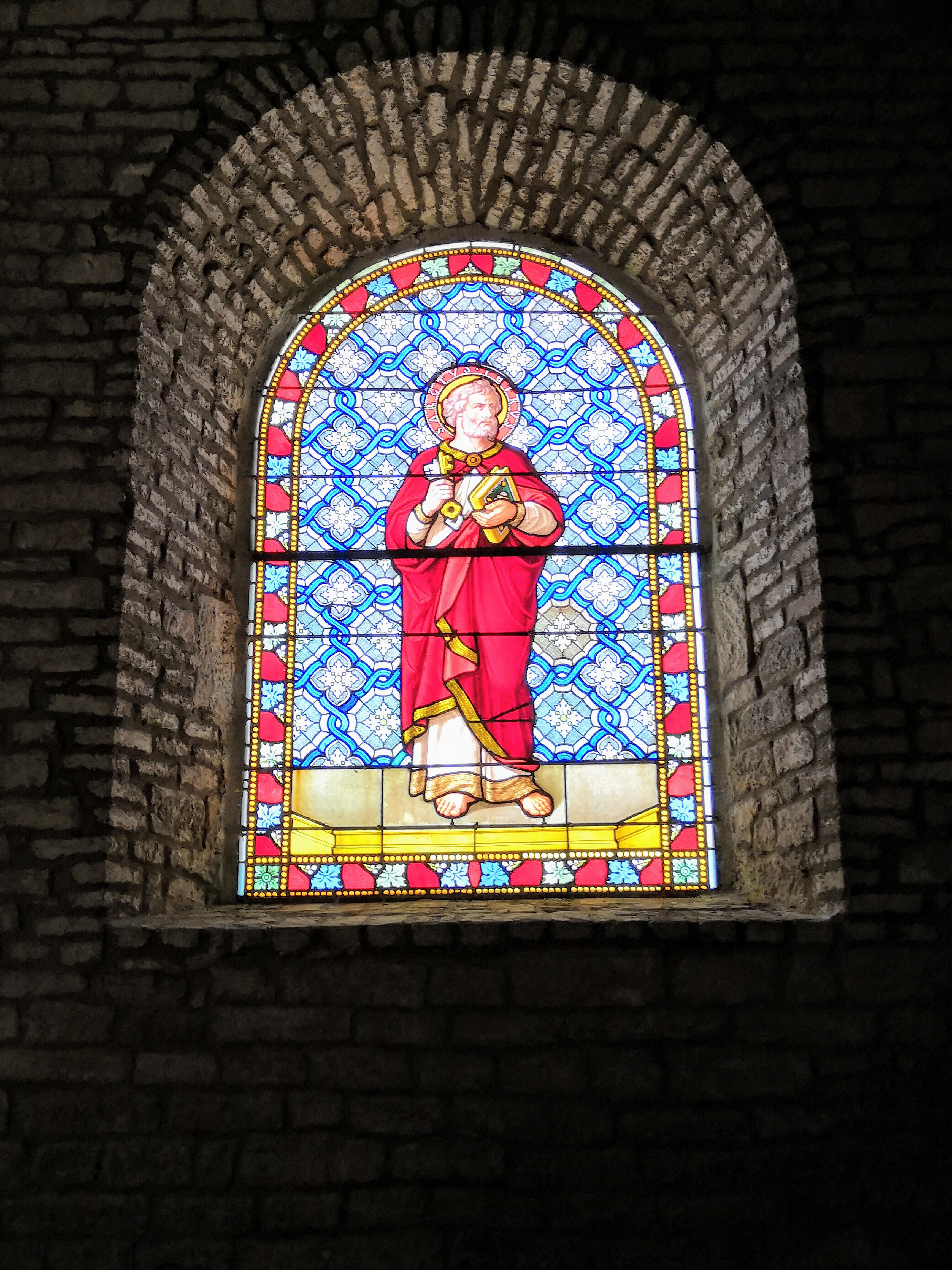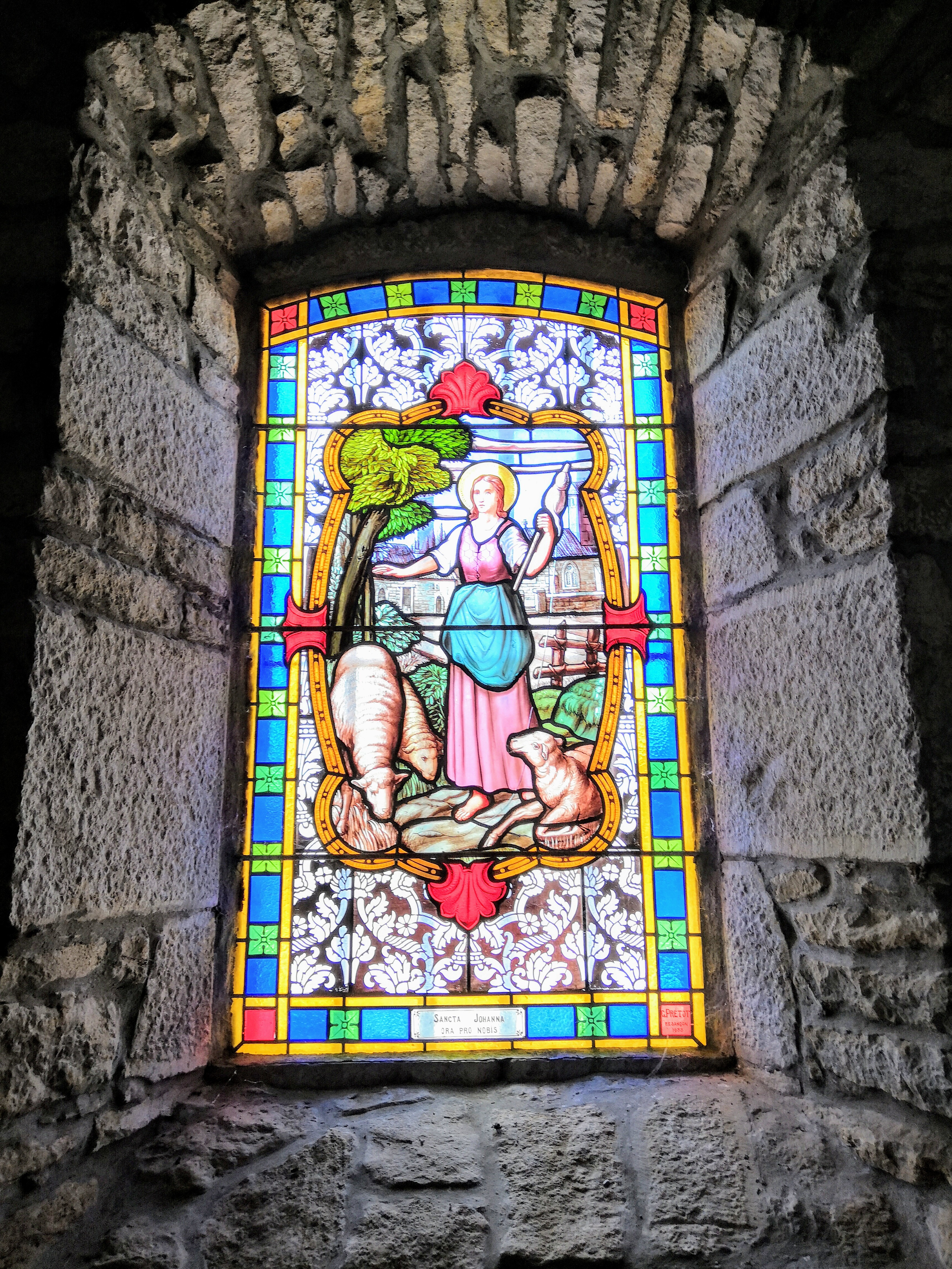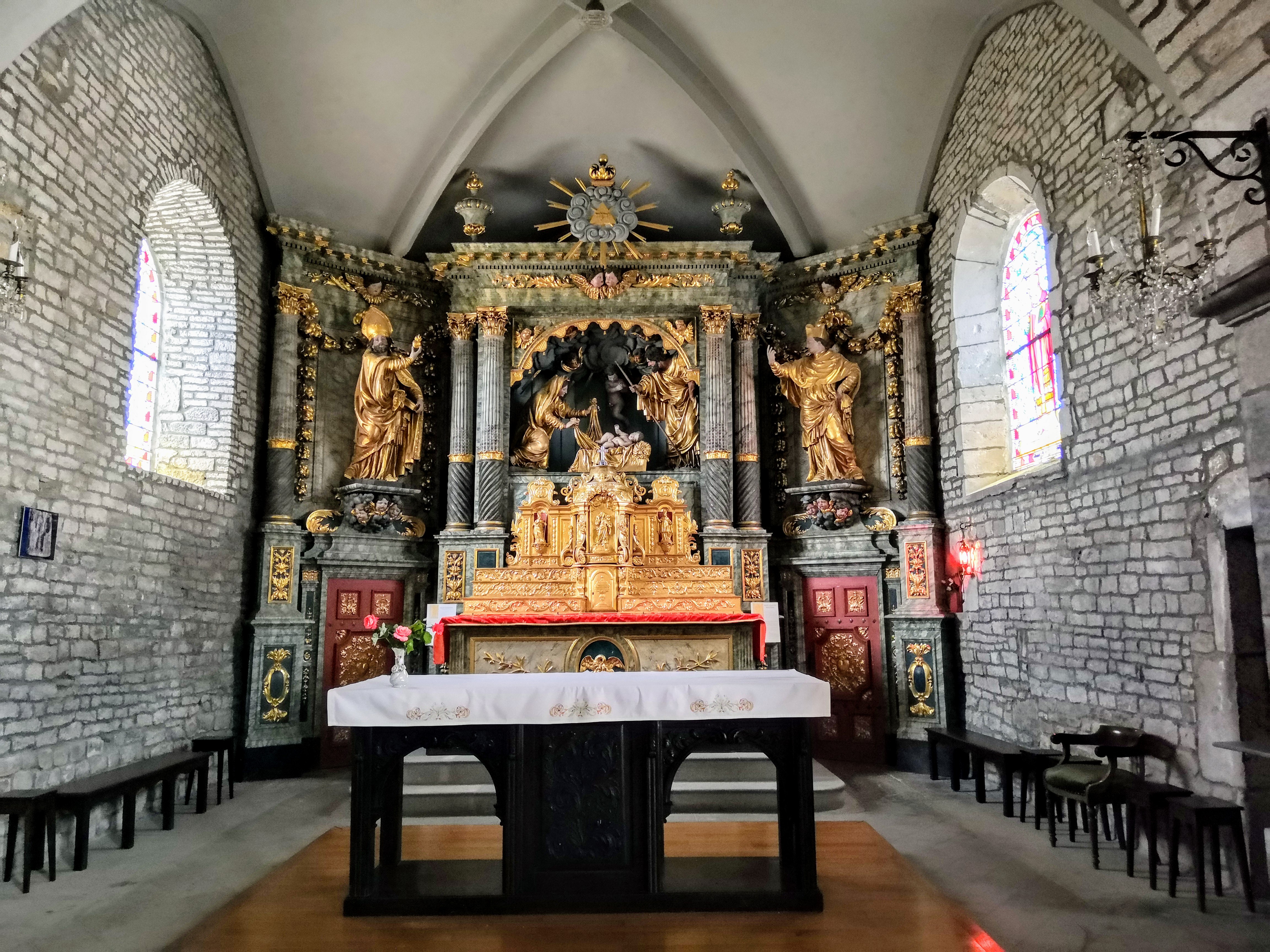 Eglise avec dans le coeur la naissance de Jésus représentée par des sculptures dorées, quelle surprise de découvrir aussi la beauté des vitraux qui représentent des saints célèbres dans une nef toute en pierre...